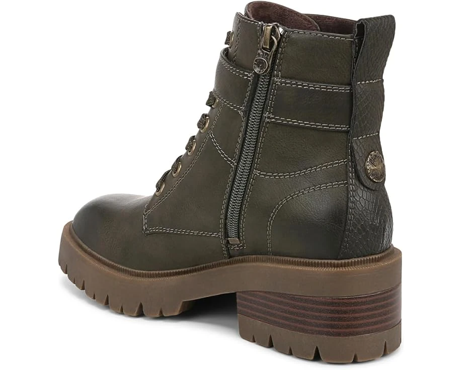 Elevate your style with the edgy Jagger Boots in Olive, crafted by Blowfish. Verified vegan construction and a moto-inspired silhouette add a touch of rebelliousness. Featuring a lace-up front, ankle strap, and lug outsole, these faux-leather boots offer both style and comfort with a padded insole, zippered side closure, and stacked heels. This boot has a side zip closure.
