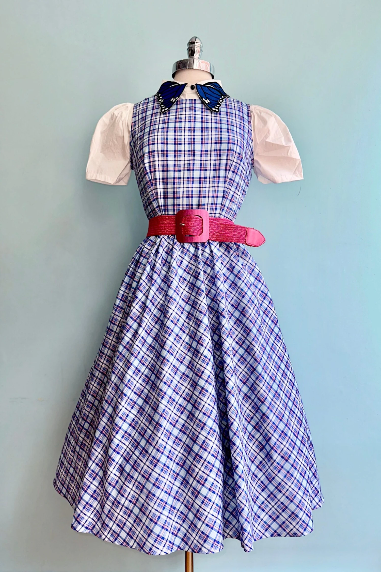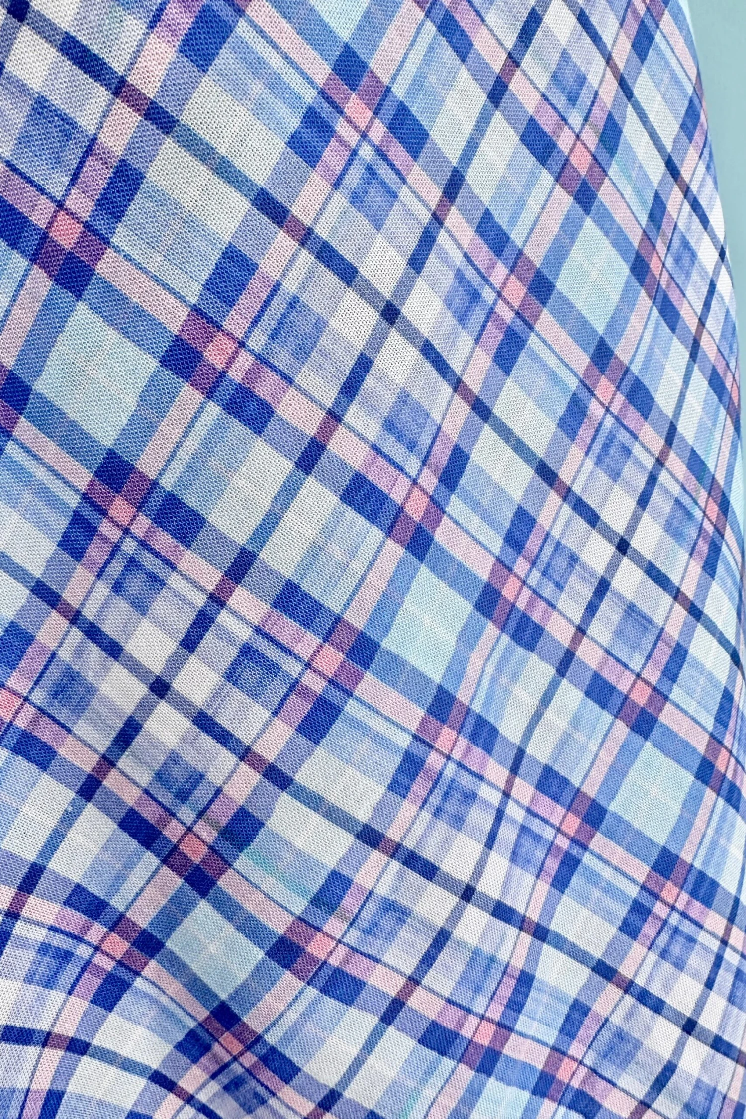 We love a spring plaid and this one is perfect for transitional spring and the height of summer. This plaid consists of shades of blue and pink. Made of 100% cotton and a great layering piece! The back waist is elastic for added comfort. Pockets on the side and zips up the back!