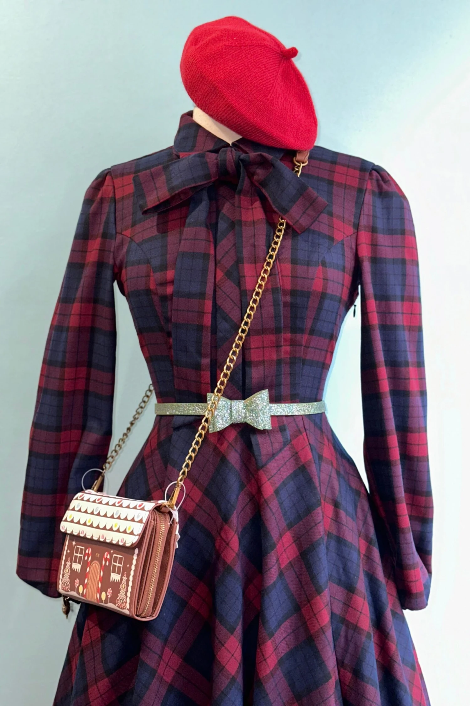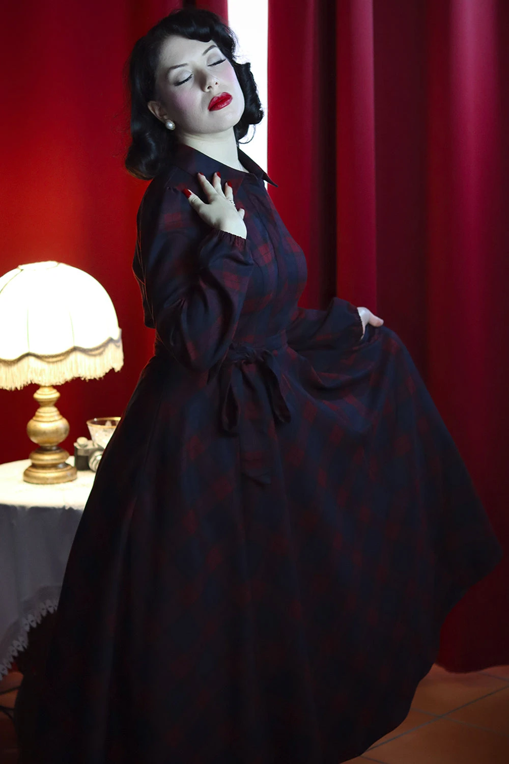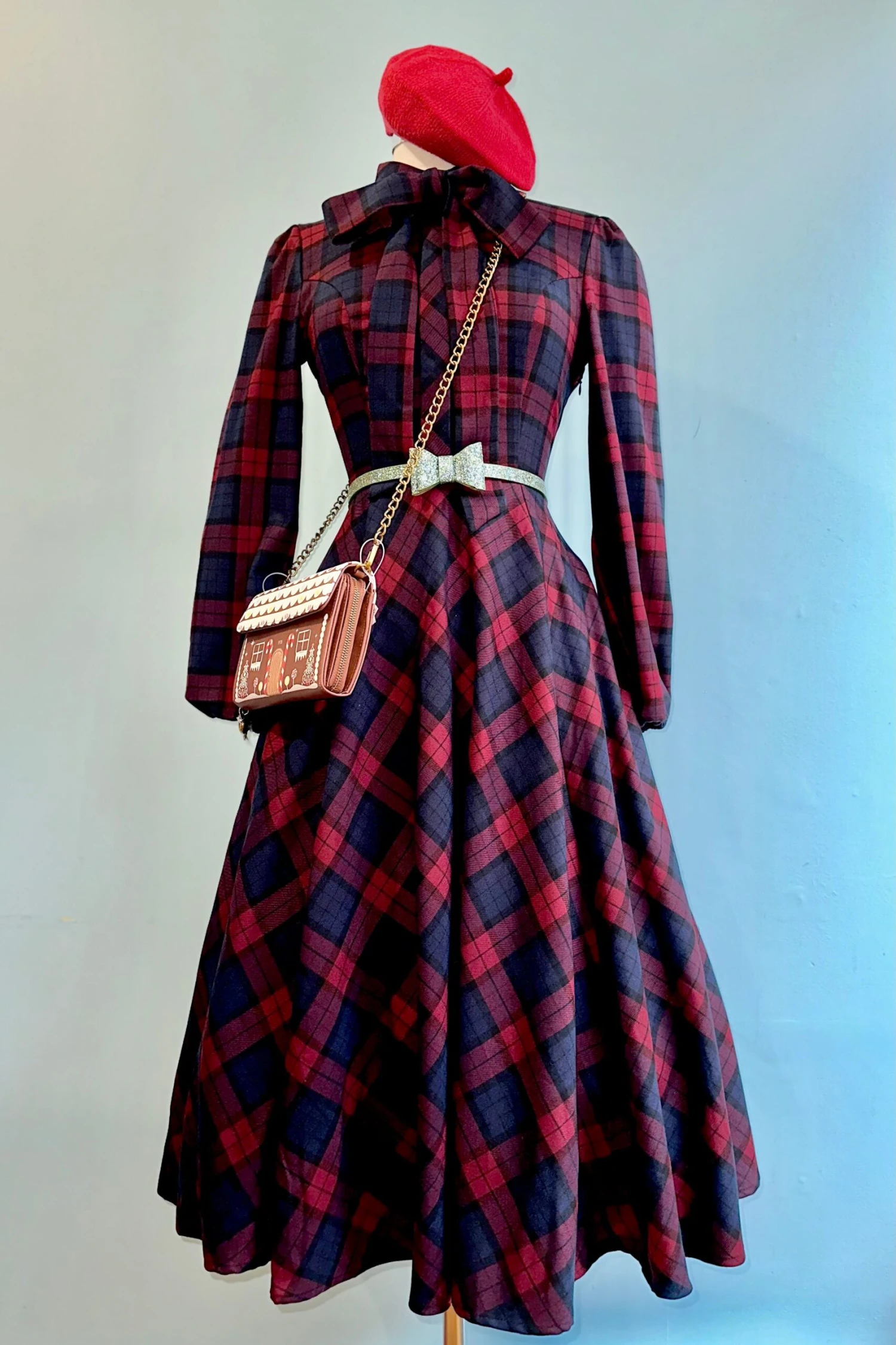 Plaid dress in navy and burgundy plaid. This dress has full length sleeves with elasticized cuffs, a pointed fold over collar, and a summary front bodice. The skirt is full and has a self sash to fasten in. There is a side zip closure, side pockets and is not lined.