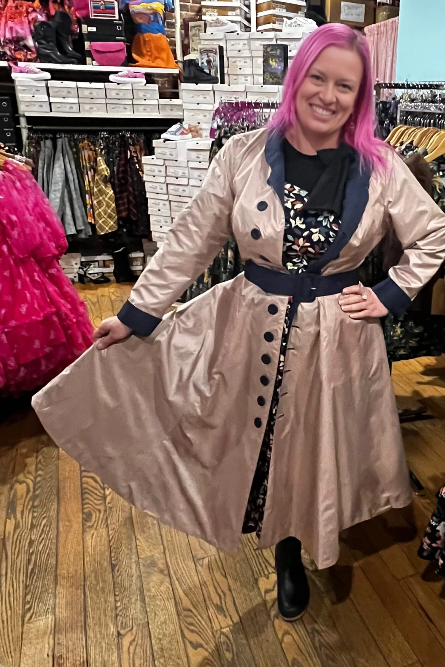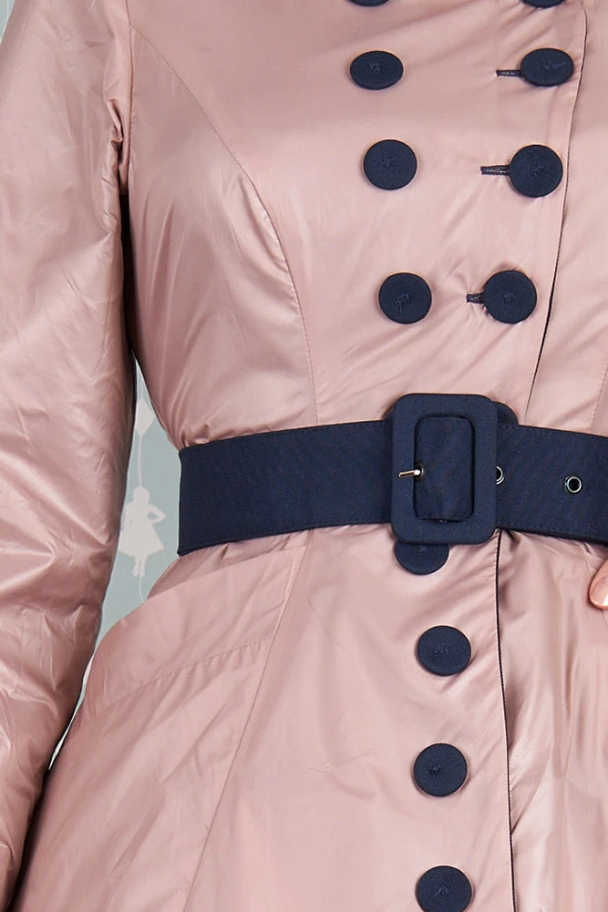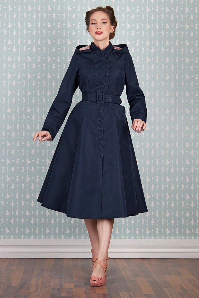 Two coats in one! This raincoat can be both navy or pink. The hood is removable and simply zips off, detach it from the coat when the rain has stopped and get a completely different look. Double breasted bodice with a full skirt, side pockets and a coordinating belt.