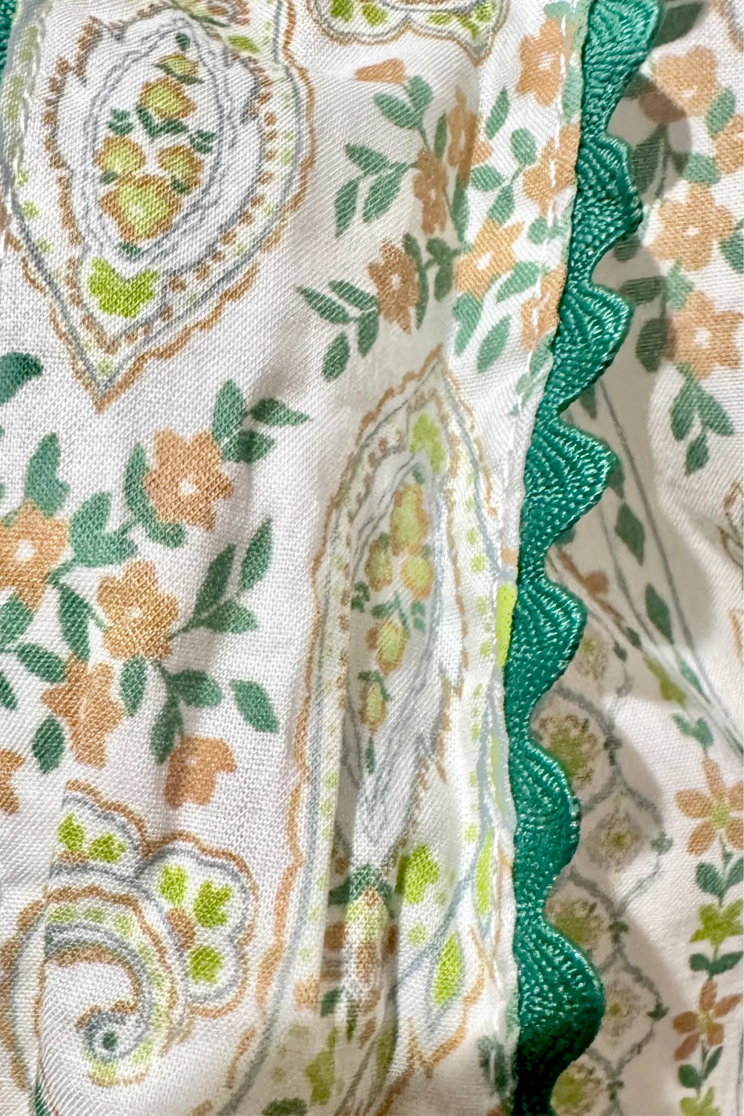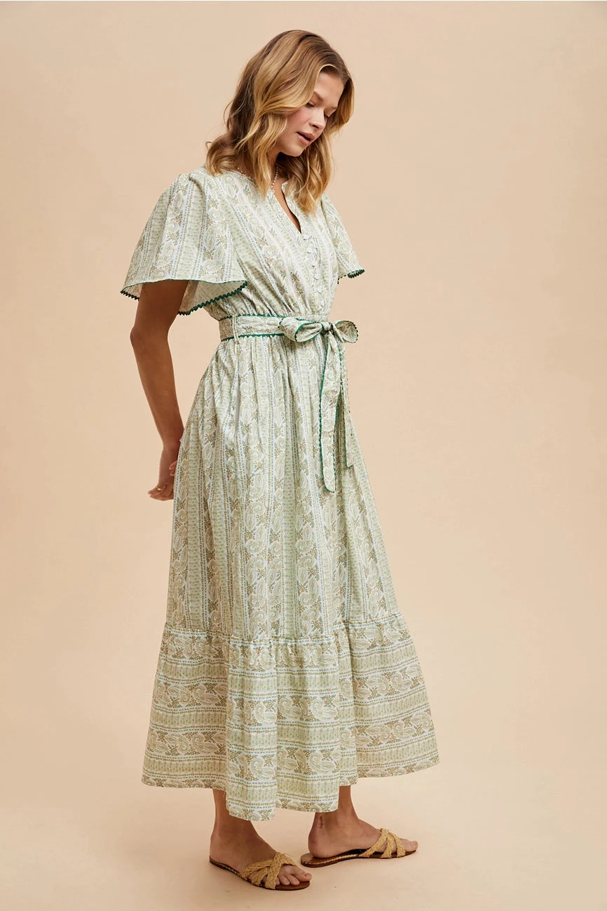 Maxi dress with a split neck, functional summarys down the bodice and flutter sleeves. The skirt is maxi length with a flounced hem, and is flowy with side pockets. The fabric is off white with a print of lemongrass green flowers and a paisley pattern. Fully lined and has an elasticized waist.