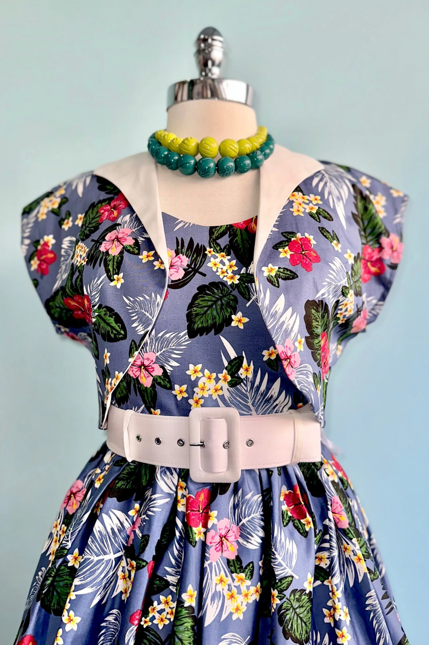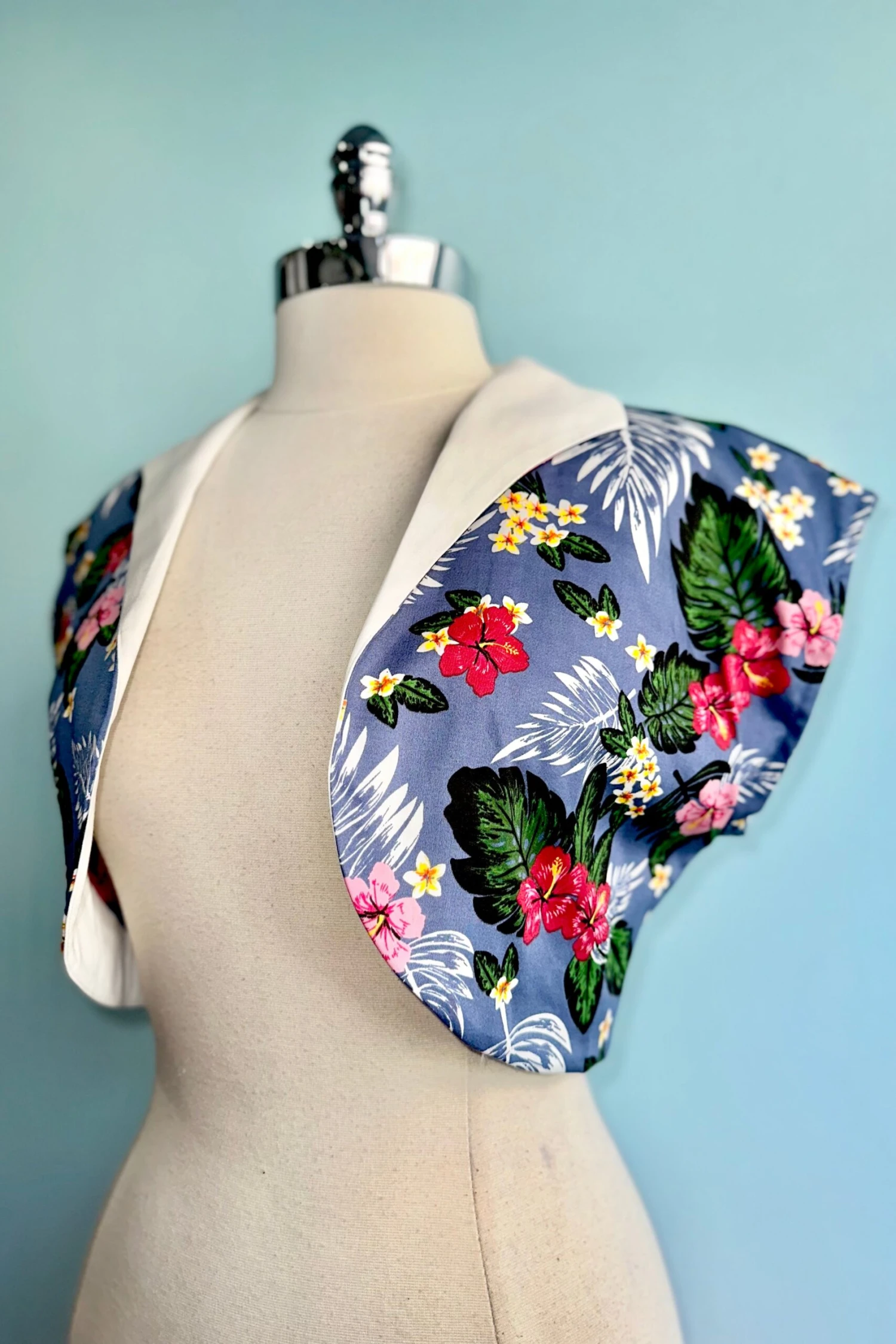 Woven cropped bolero in blue with a print in pink, yellow, white and green flowers and leaves. There is a contrast fold over collar in white.