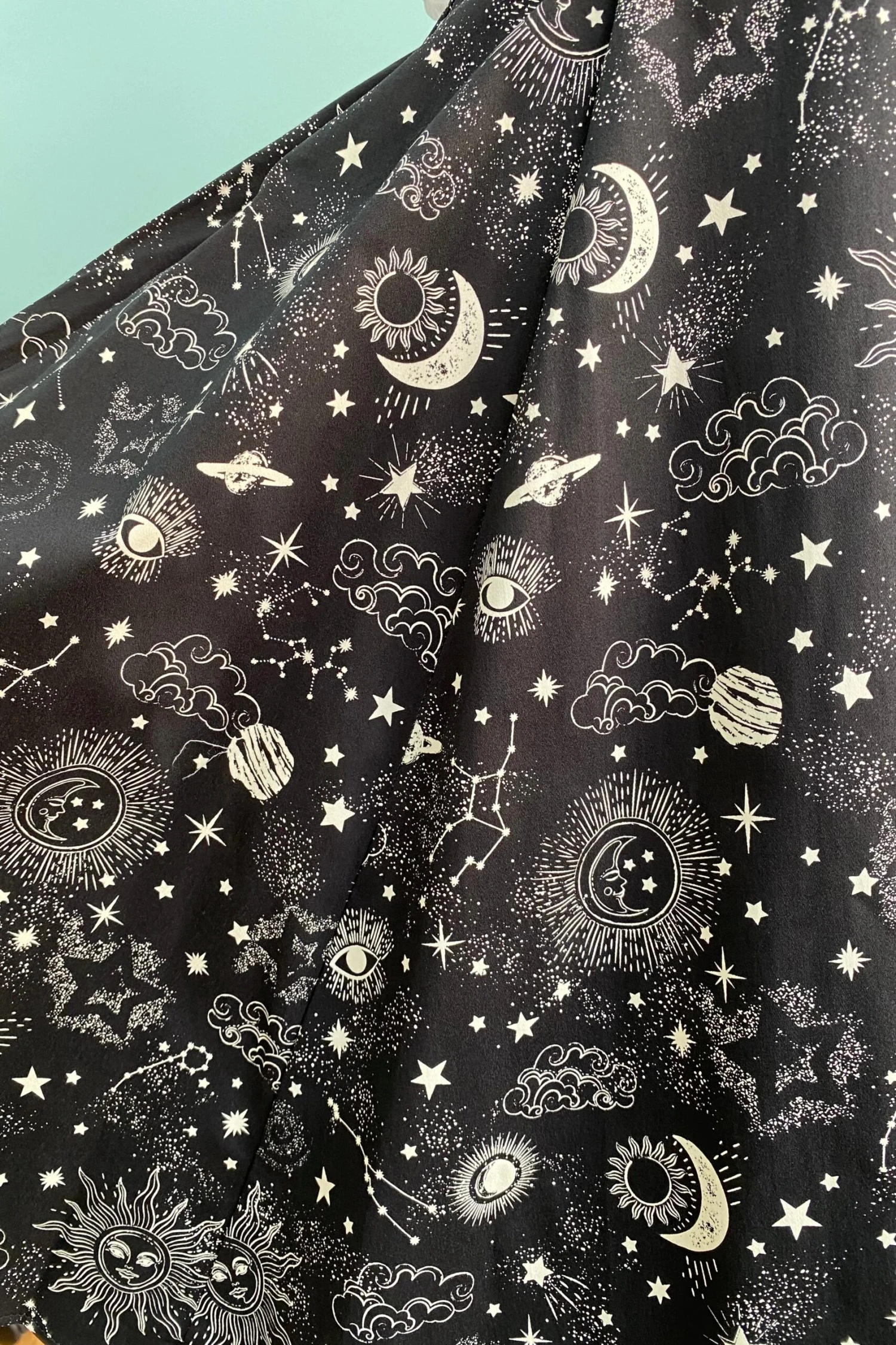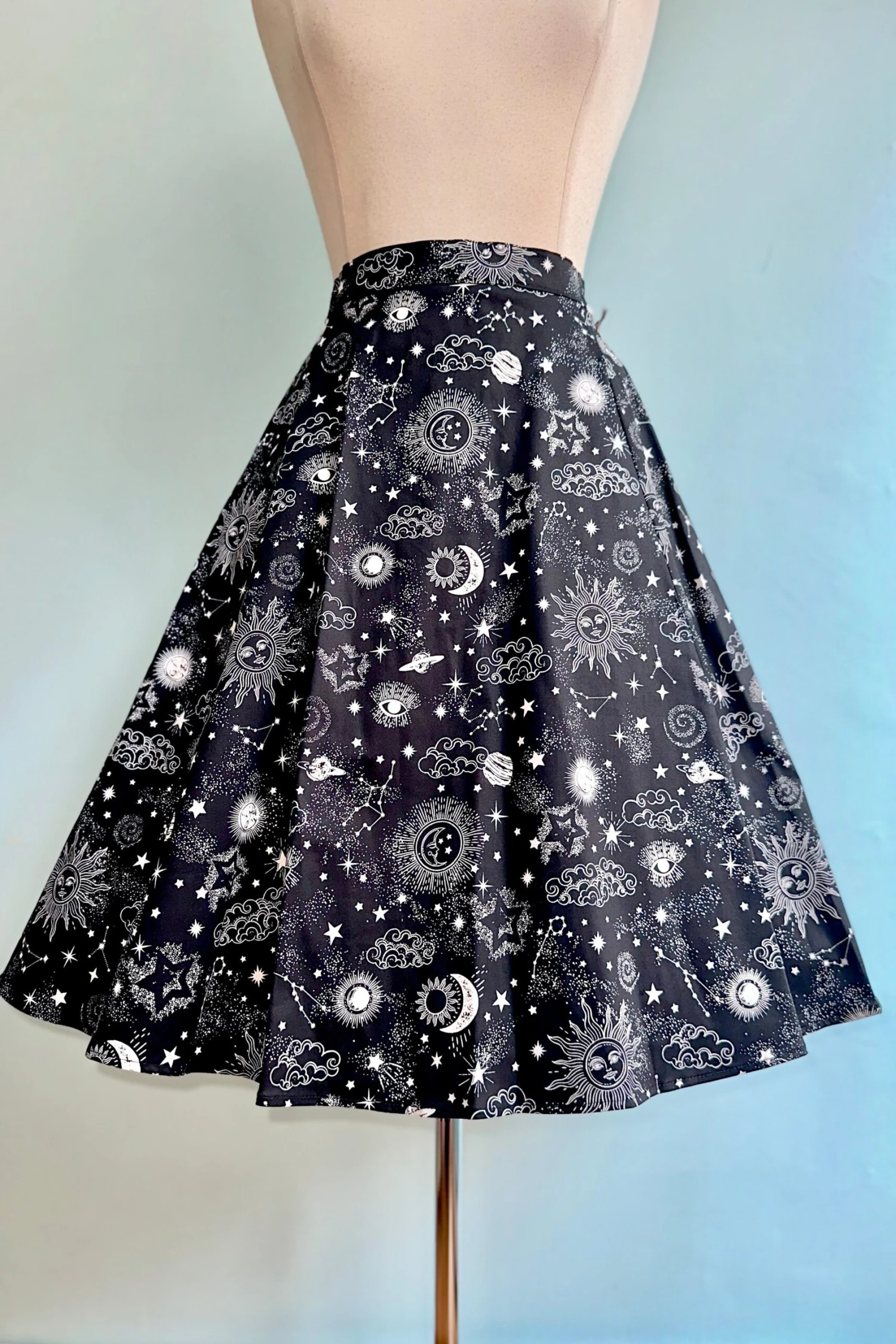 Black full skirt with a celestial lunar print in white. The print is of suns, constellations, moons, planets, all seeing eye and stars. This skirt has pockets and zips up the back! This is made of a cotton and elastane blend, there is some ease to the fabric but no real stretch.
