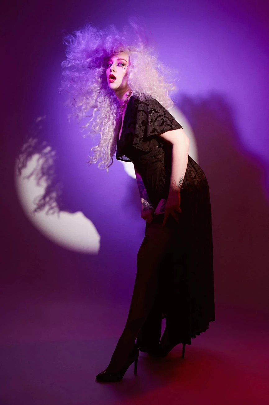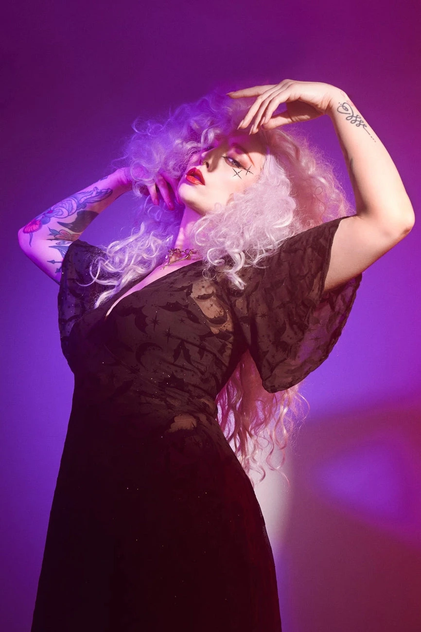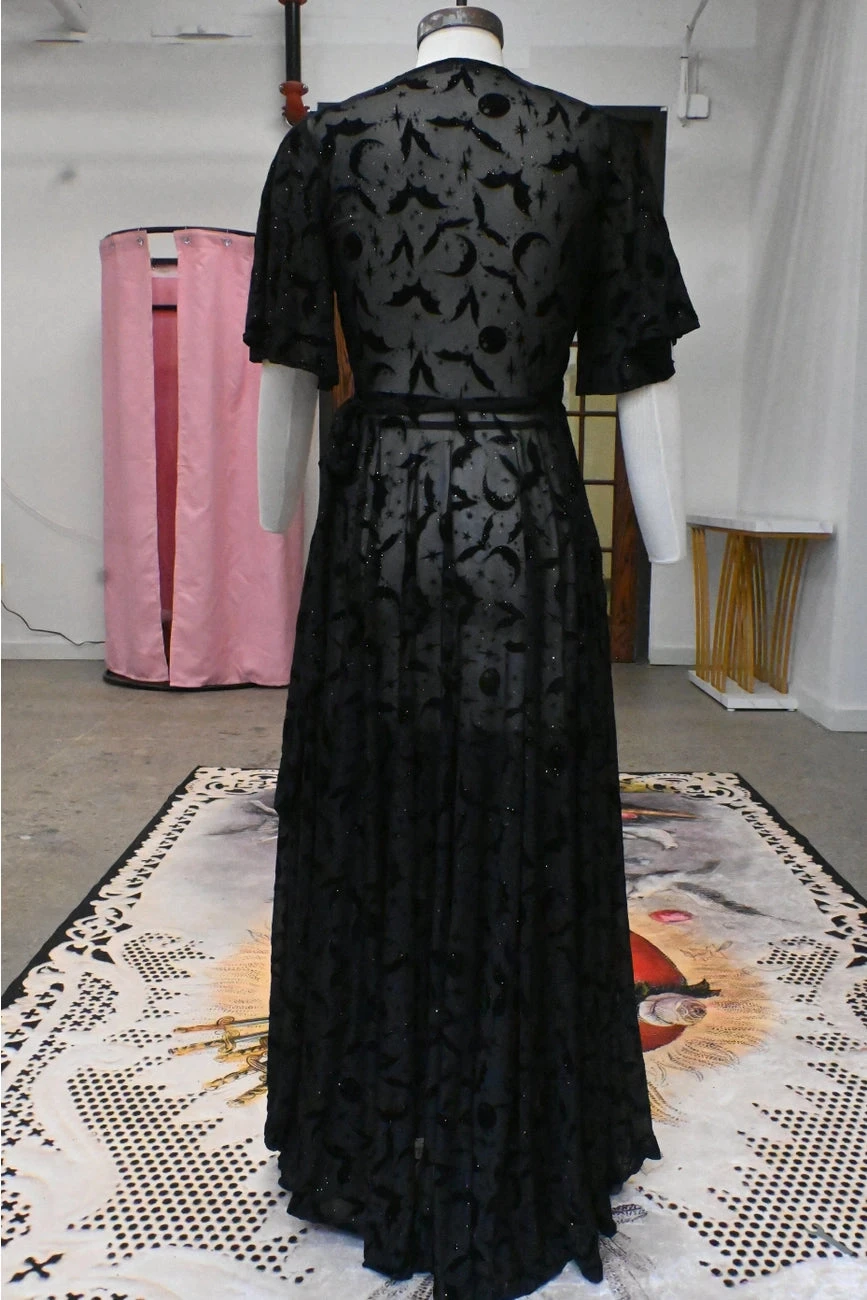 We can’t get enough of how absolutely fabulous the Lydia dress is! This soft mesh, floor length robe-like dress is just the thing for adding a huge dose of glamour to any look. It’s so versatile and so feminine! There are flocked bats and moons throughout.