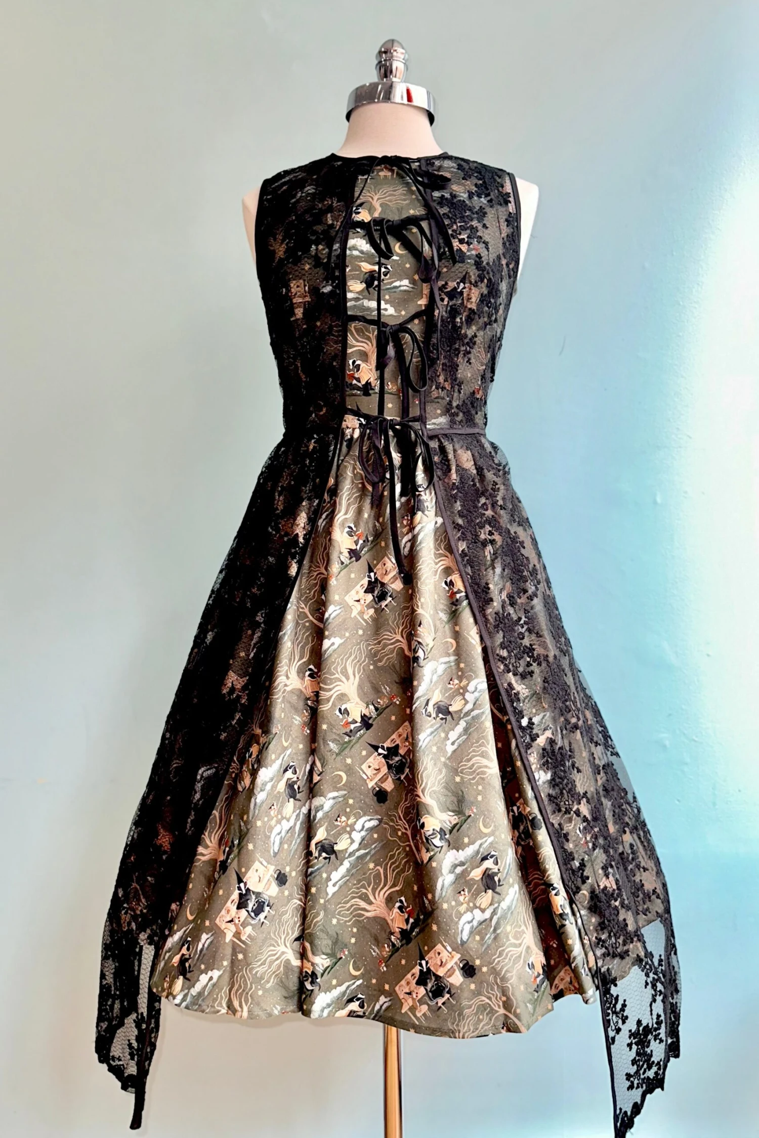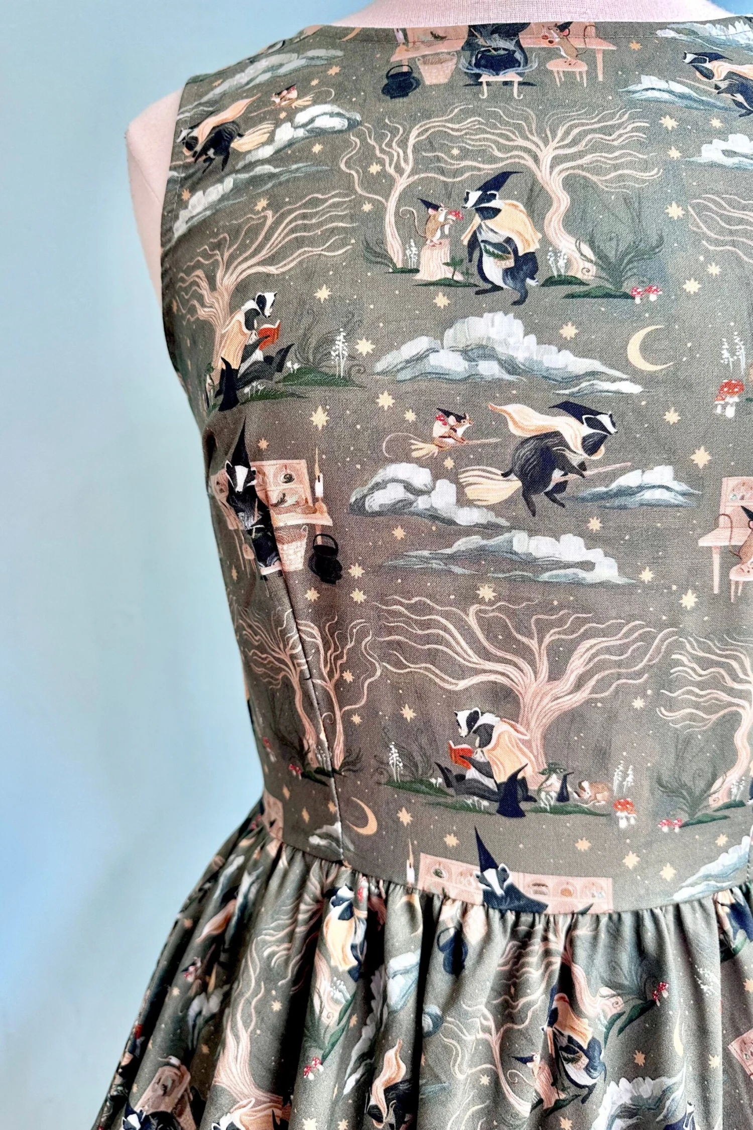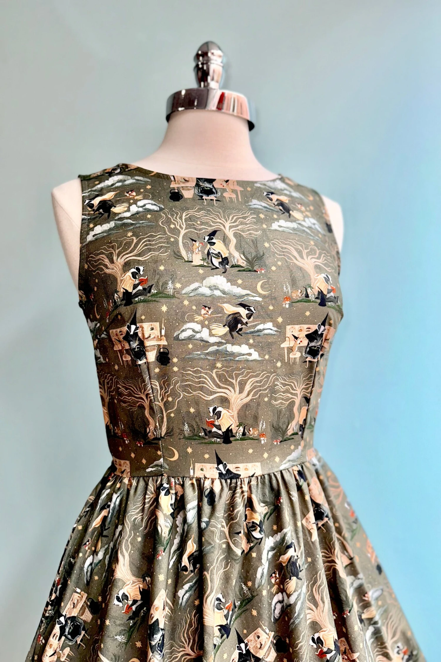 Slip into a spell in this magical print from Retrolicious! This print will have others bewitched, featuring a badger and a mouse making a spell, reading, flying on broomsticks and foraging. The colors are a deep grey green and neutrals. This incredible textile was designed by Rae Ritchie.