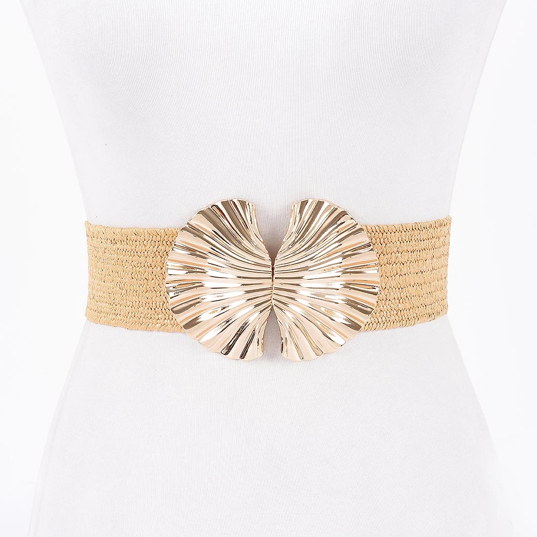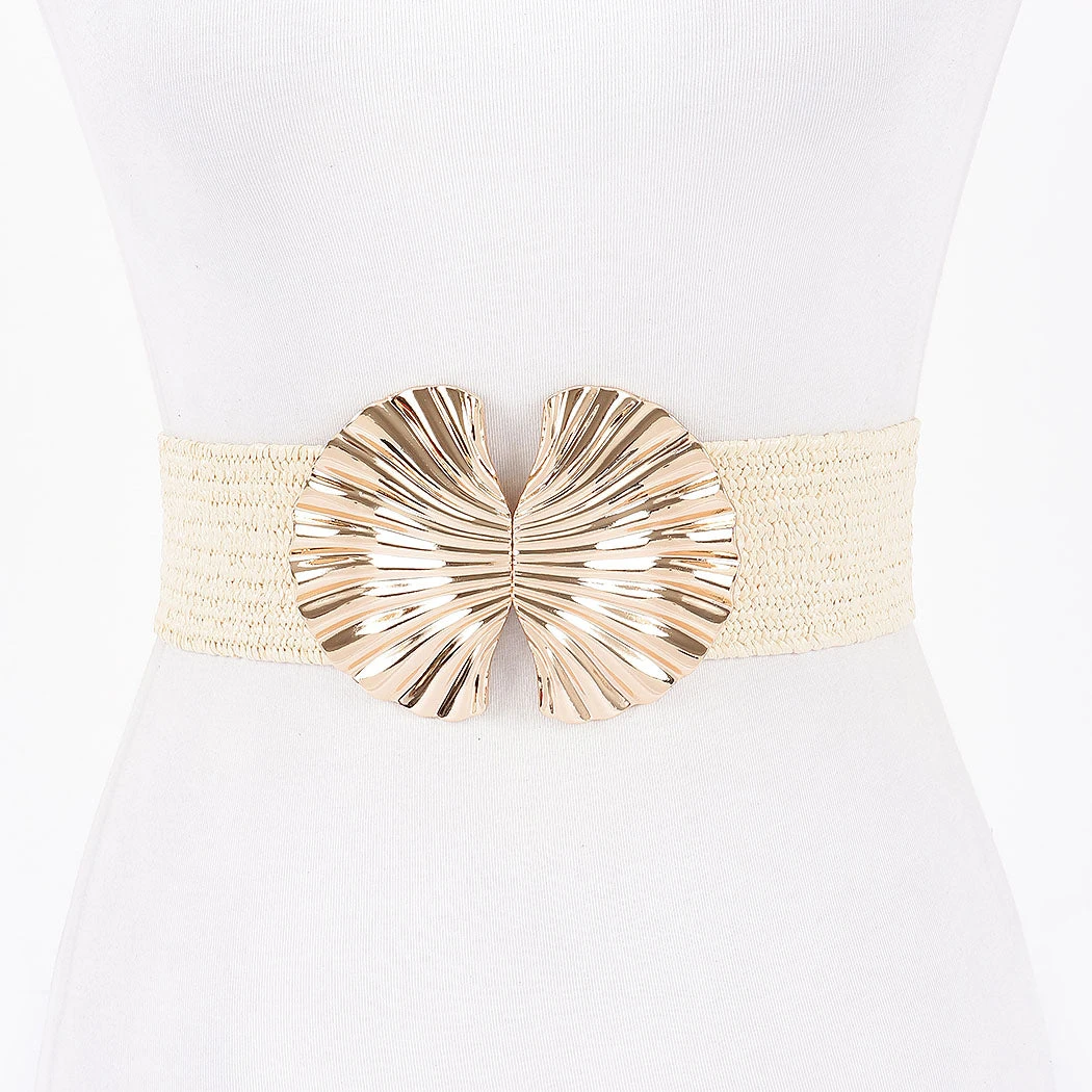 A stretchy straw belt with a double gold flower petal buckle. Super comfy!