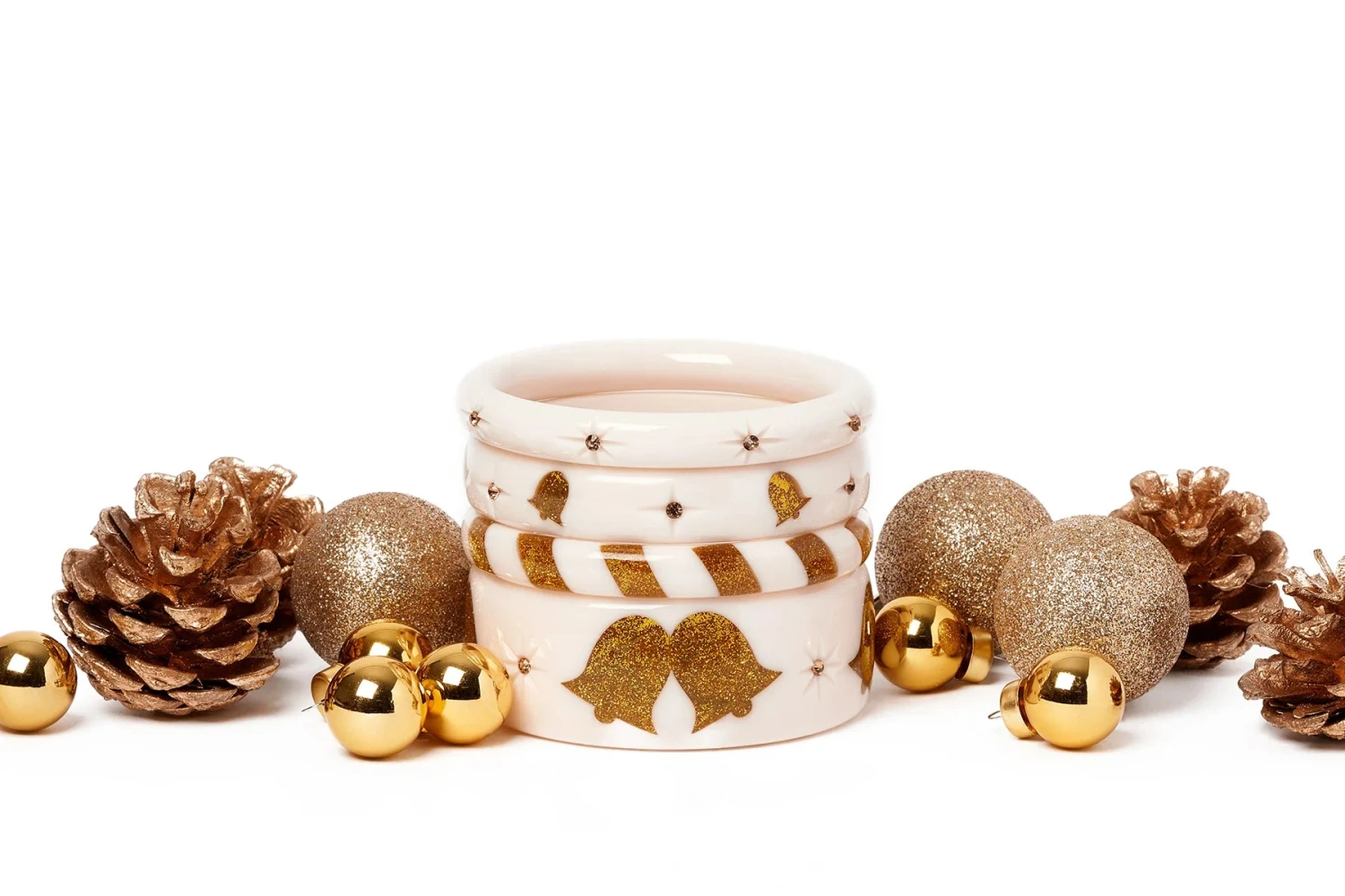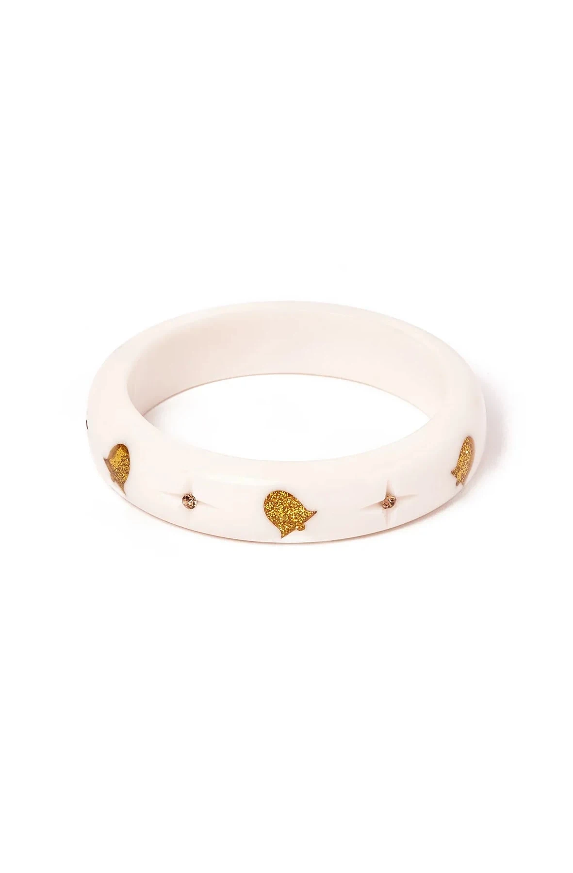 White Bells Midi Bangle Bracelet. The bracelet has inlay gold bells and rhinestones.