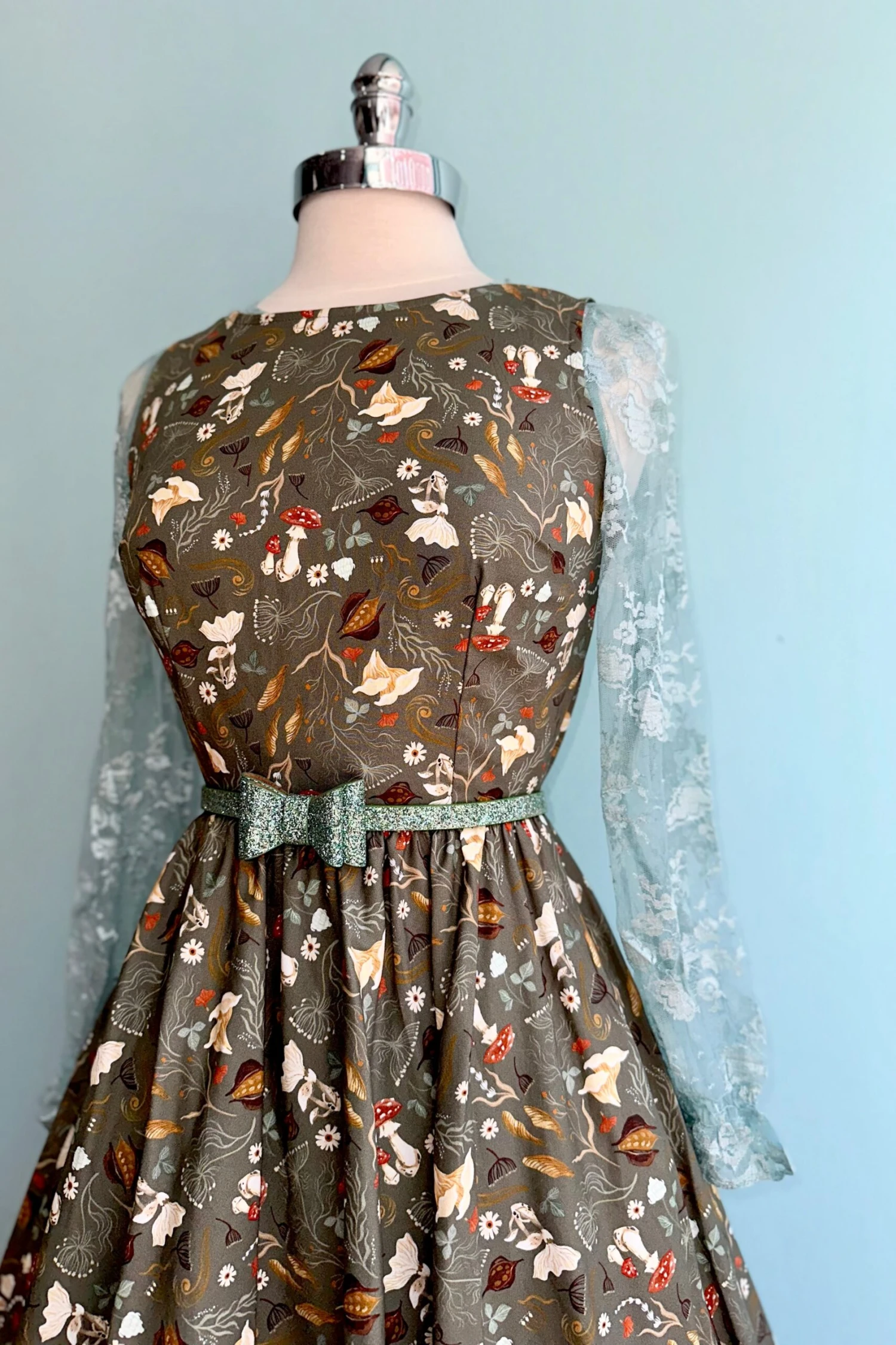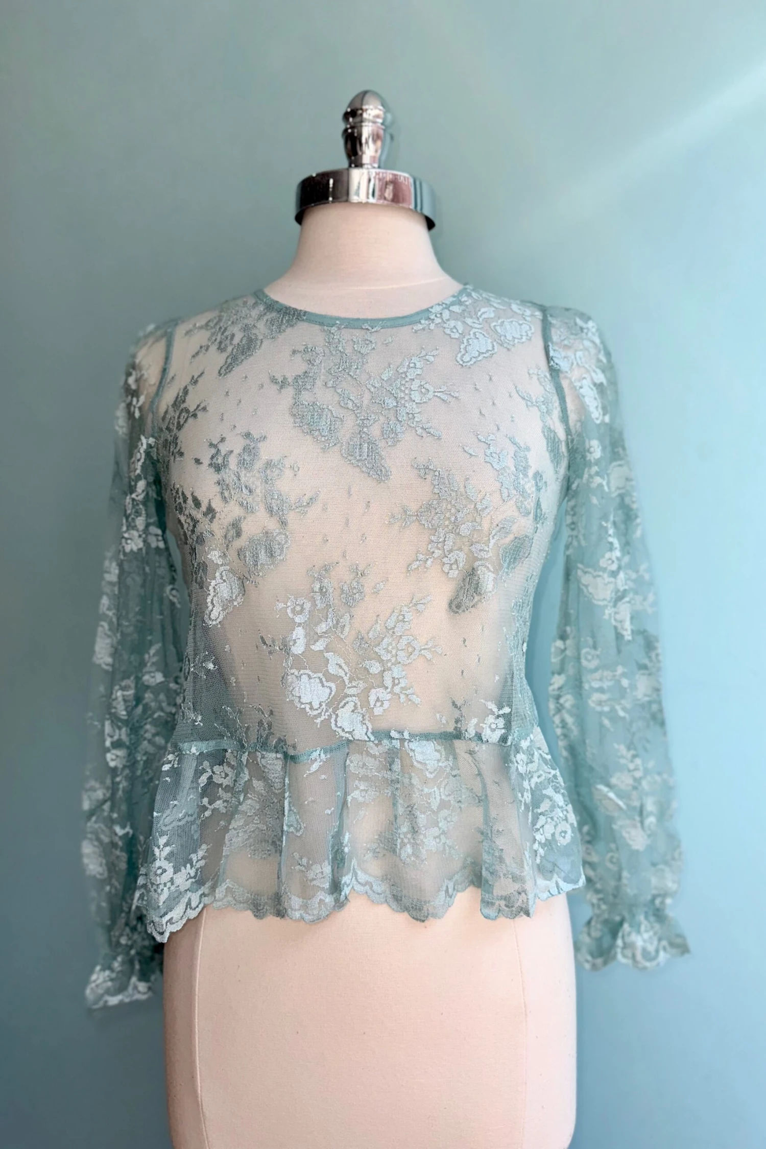 Mint lace top with long sleeves a peplum waist and a keyhole back neck fastener. This is a great under layer piece!