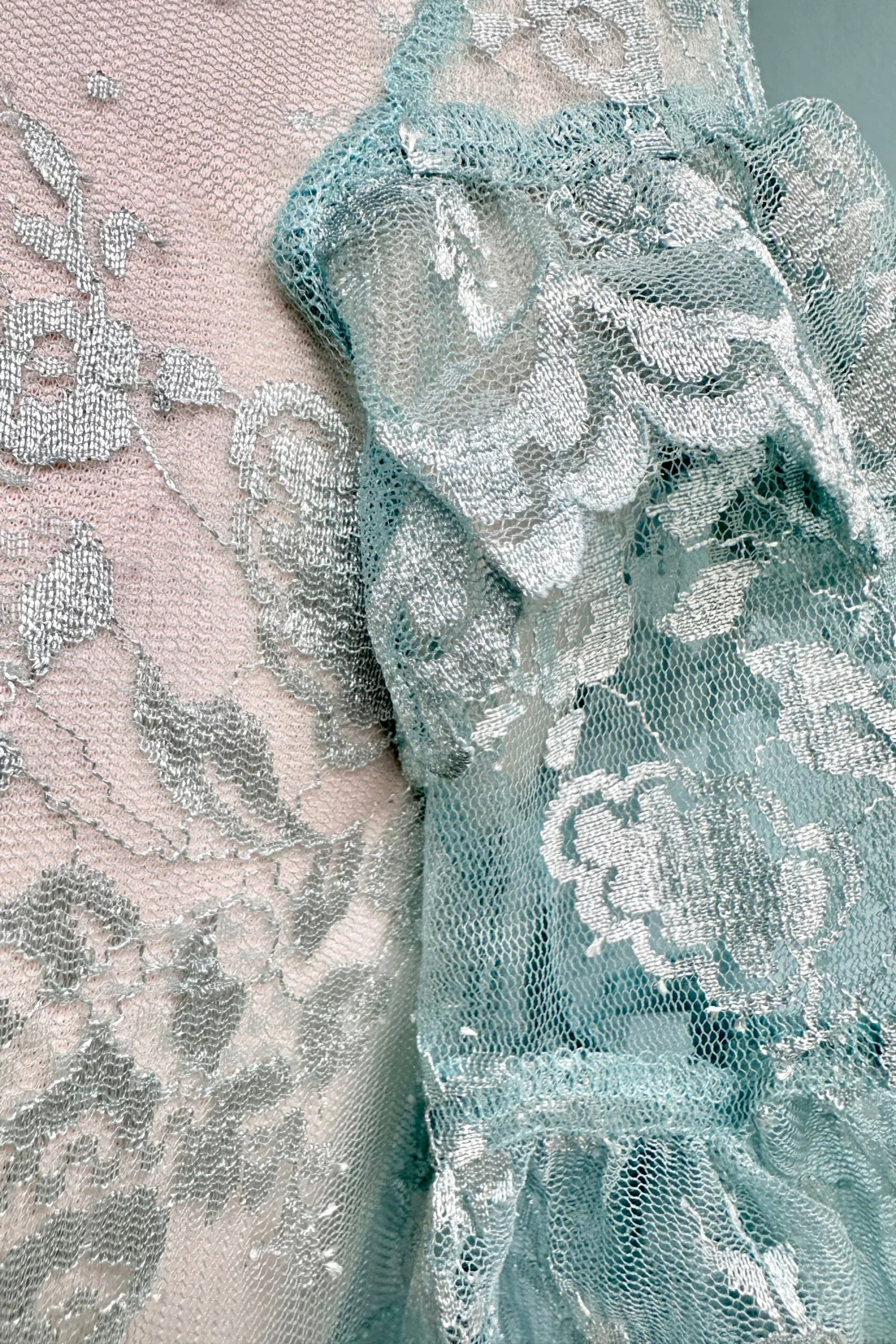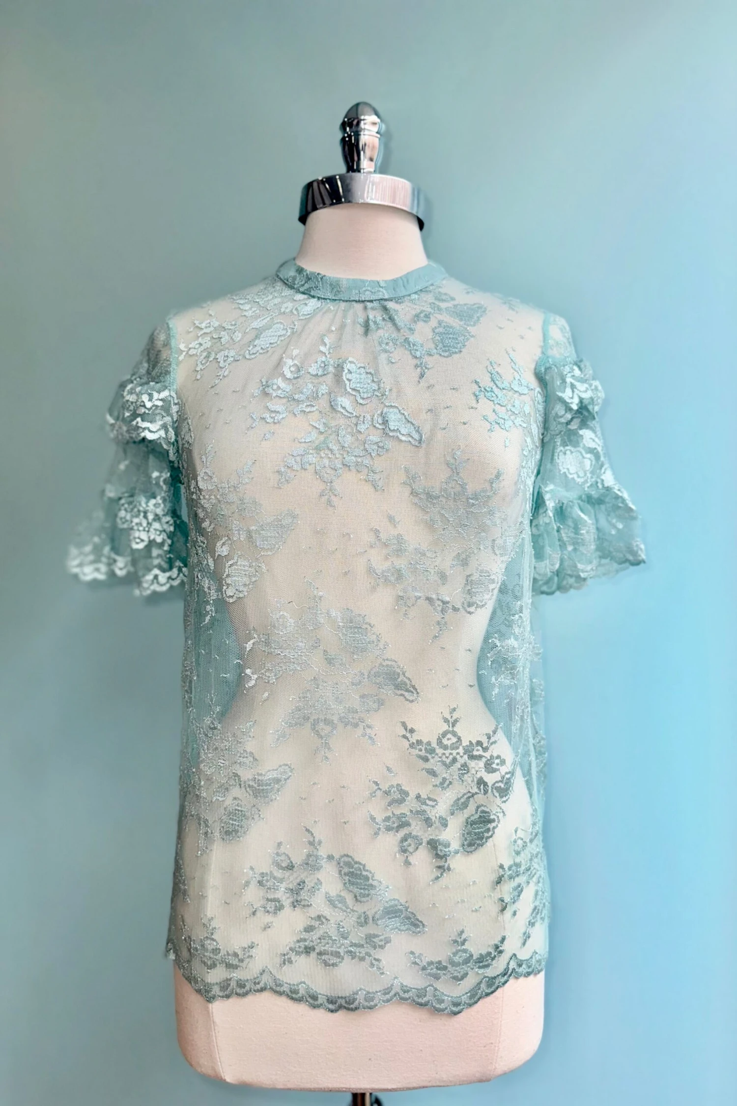 Mint lace top with short tiered flutter sleeves and a keyhole back neck fastener. This is a great under layer piece!