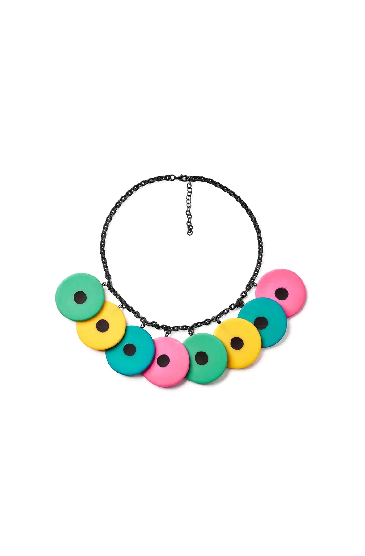 Make a statement with this bright, tropical inspired Multicoloured Matte Disc Necklace! Featuring an eye-catching matte finish, this statement necklace will finish your vintage outfit.