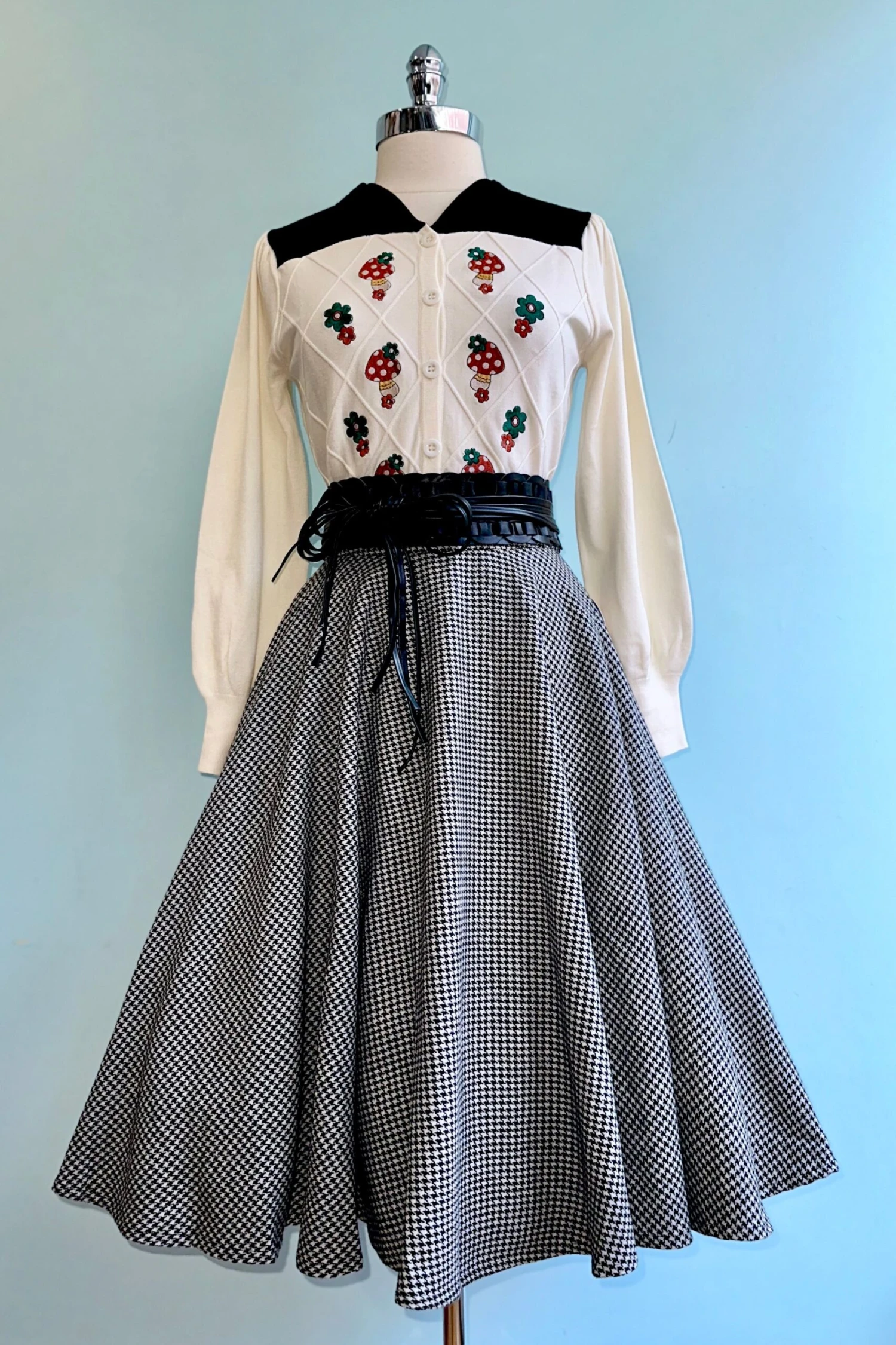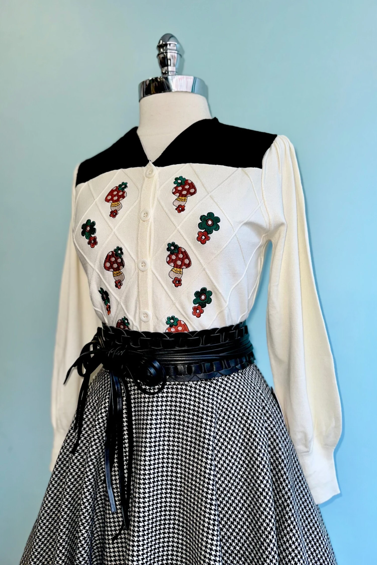 Cardigan sweater in ivory with a black yoke and fold over collar. The sleeves are long and have puffs at the shoulder. The front has embroidered red mushrooms and flowers throughout.
