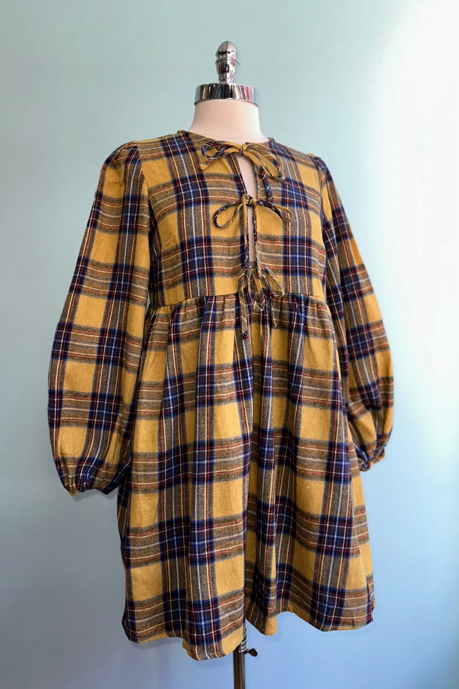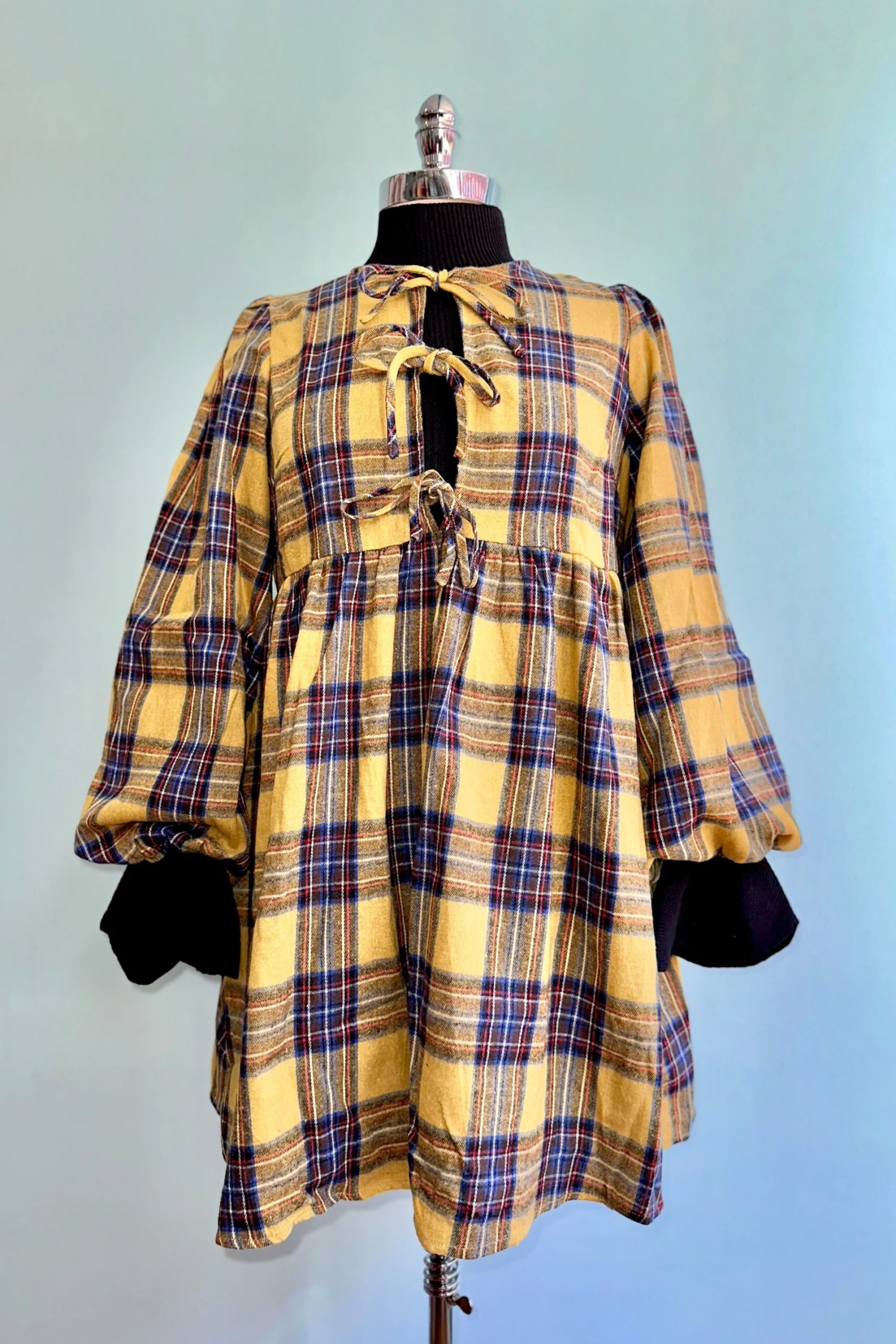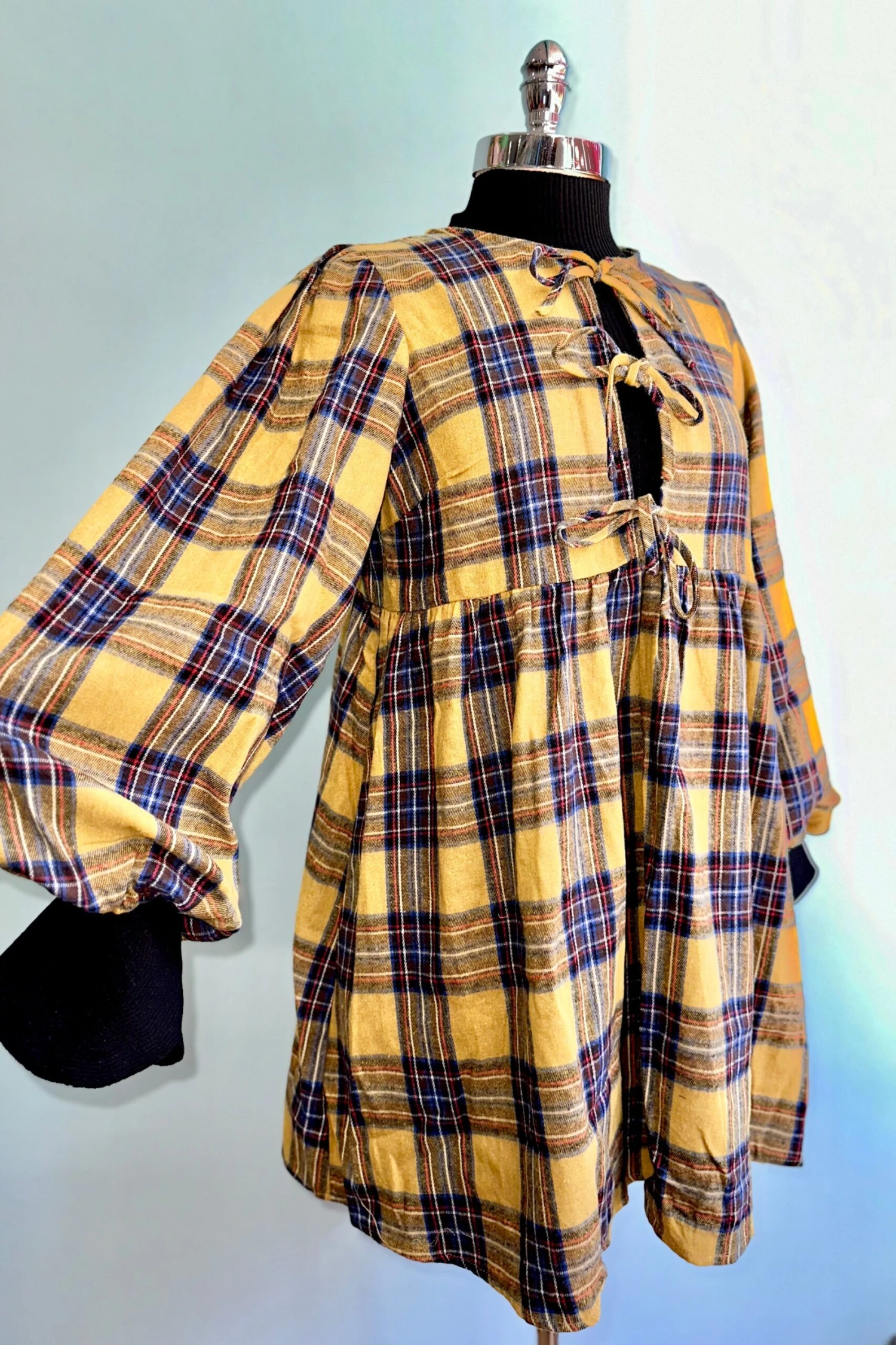 Cute plaid dress in mustard flannel with a row of ties in the front. This dress has a gathered empire waist with long Billowy sleeves. The ties will leave openings so something will need to be worn underneath for coverage if so preferred. This dress is not lined and has no closures.