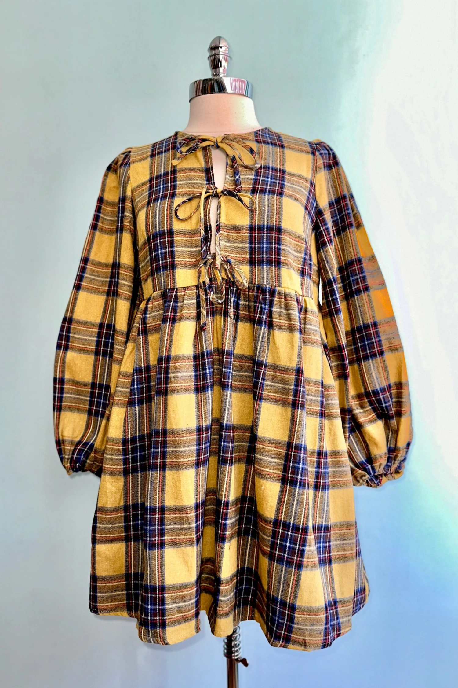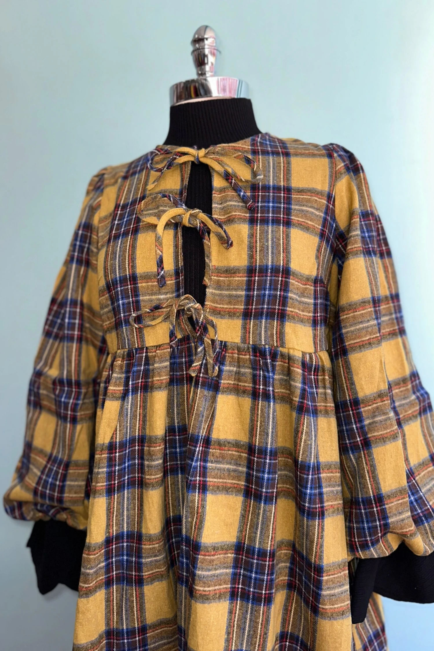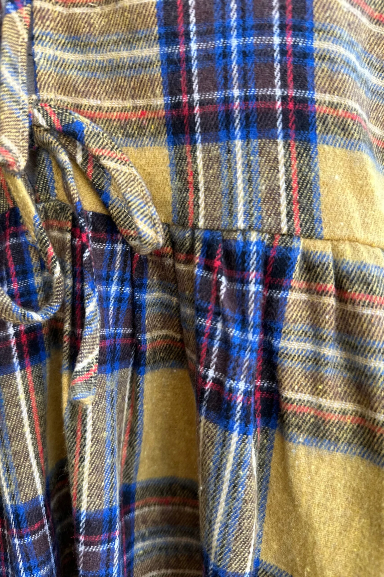 Cute plaid dress in mustard flannel with a row of ties in the front. This dress has a gathered empire waist with long Billowy sleeves. The ties will leave openings so something will need to be worn underneath for coverage if so preferred. This dress is not lined and has no closures.