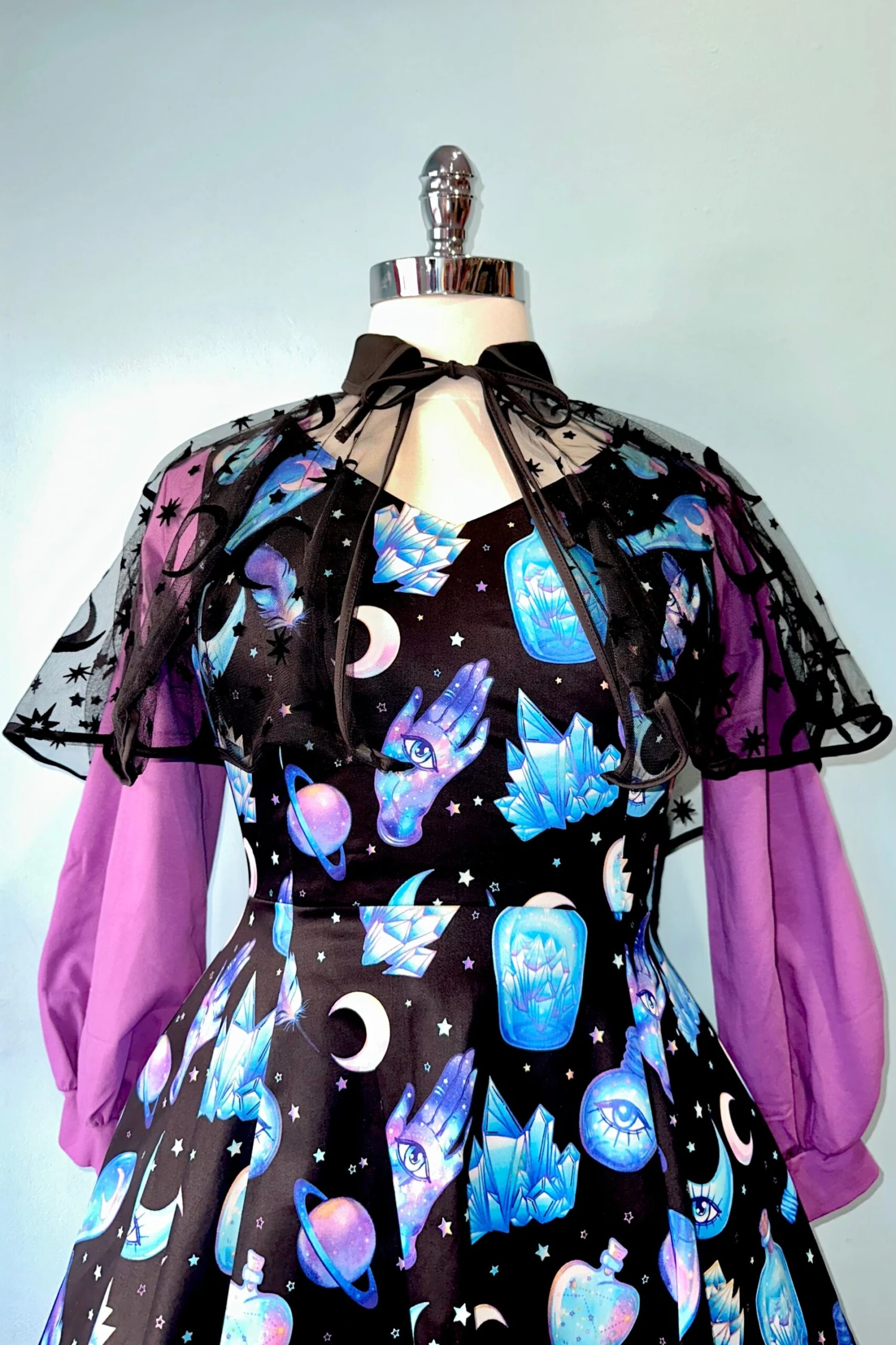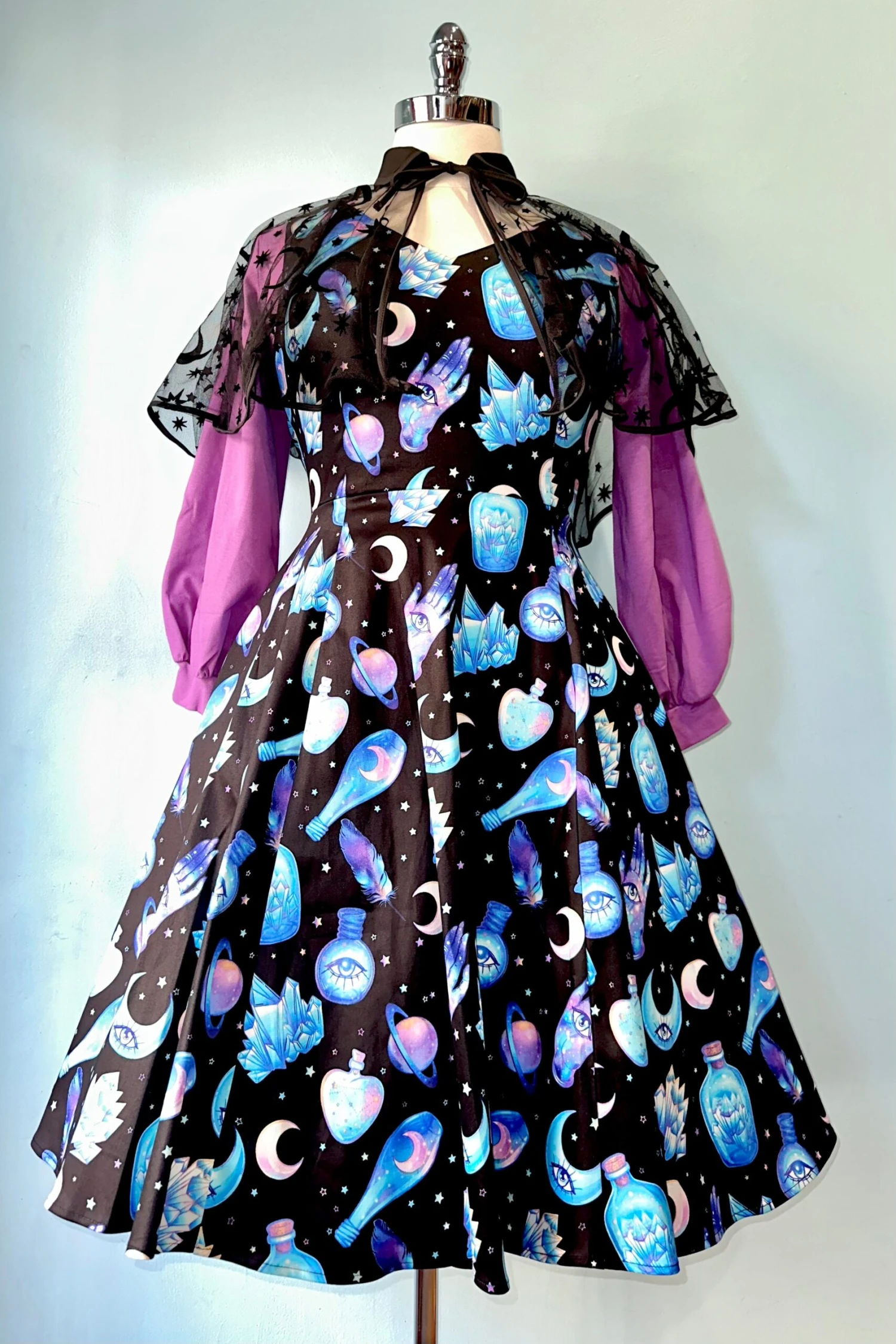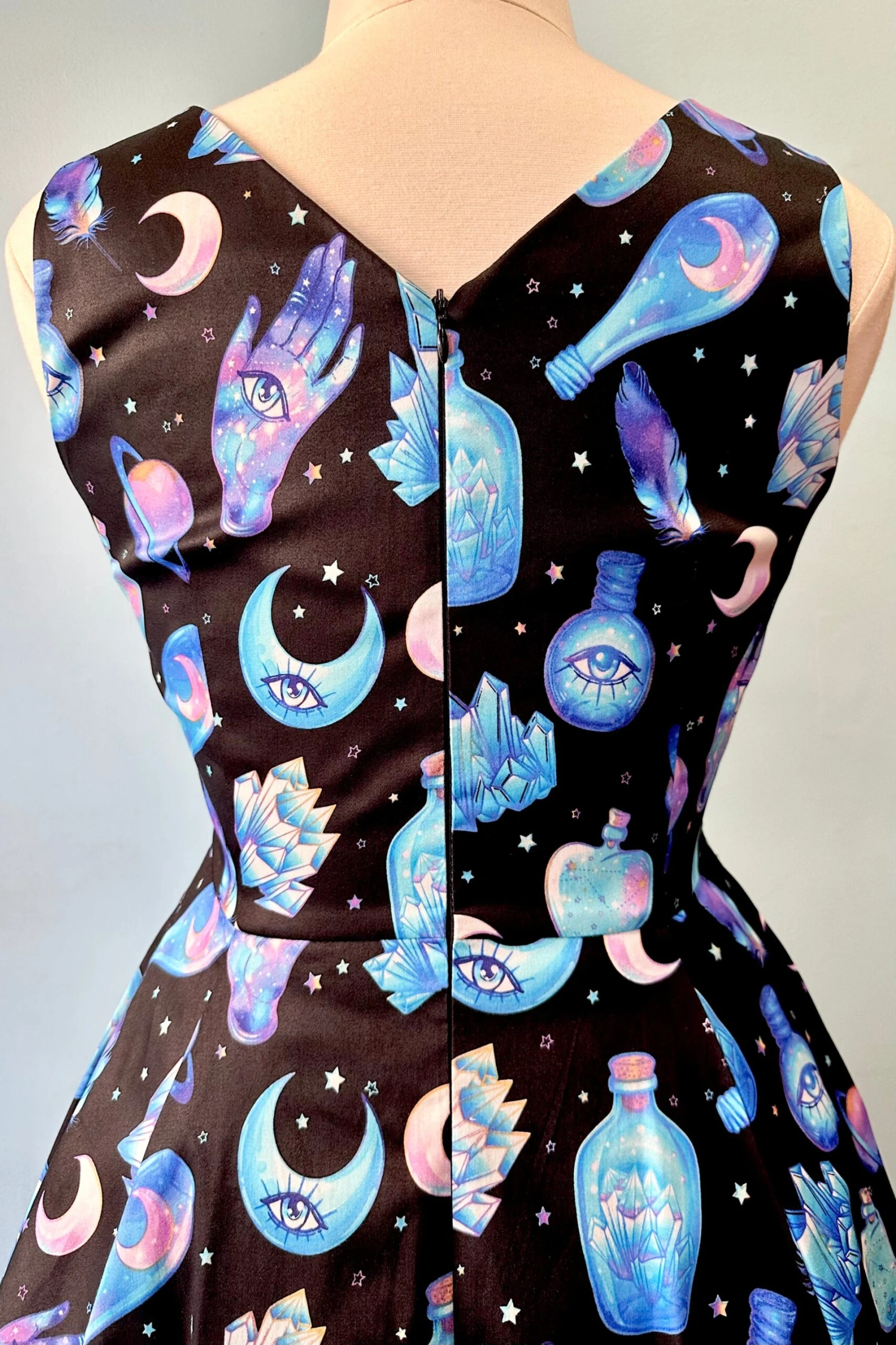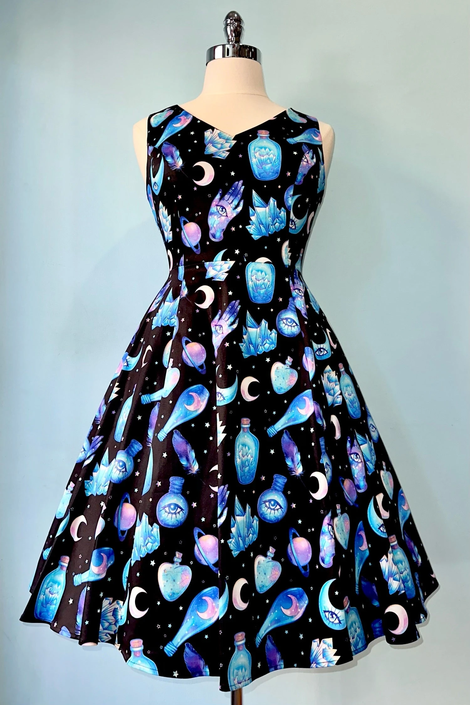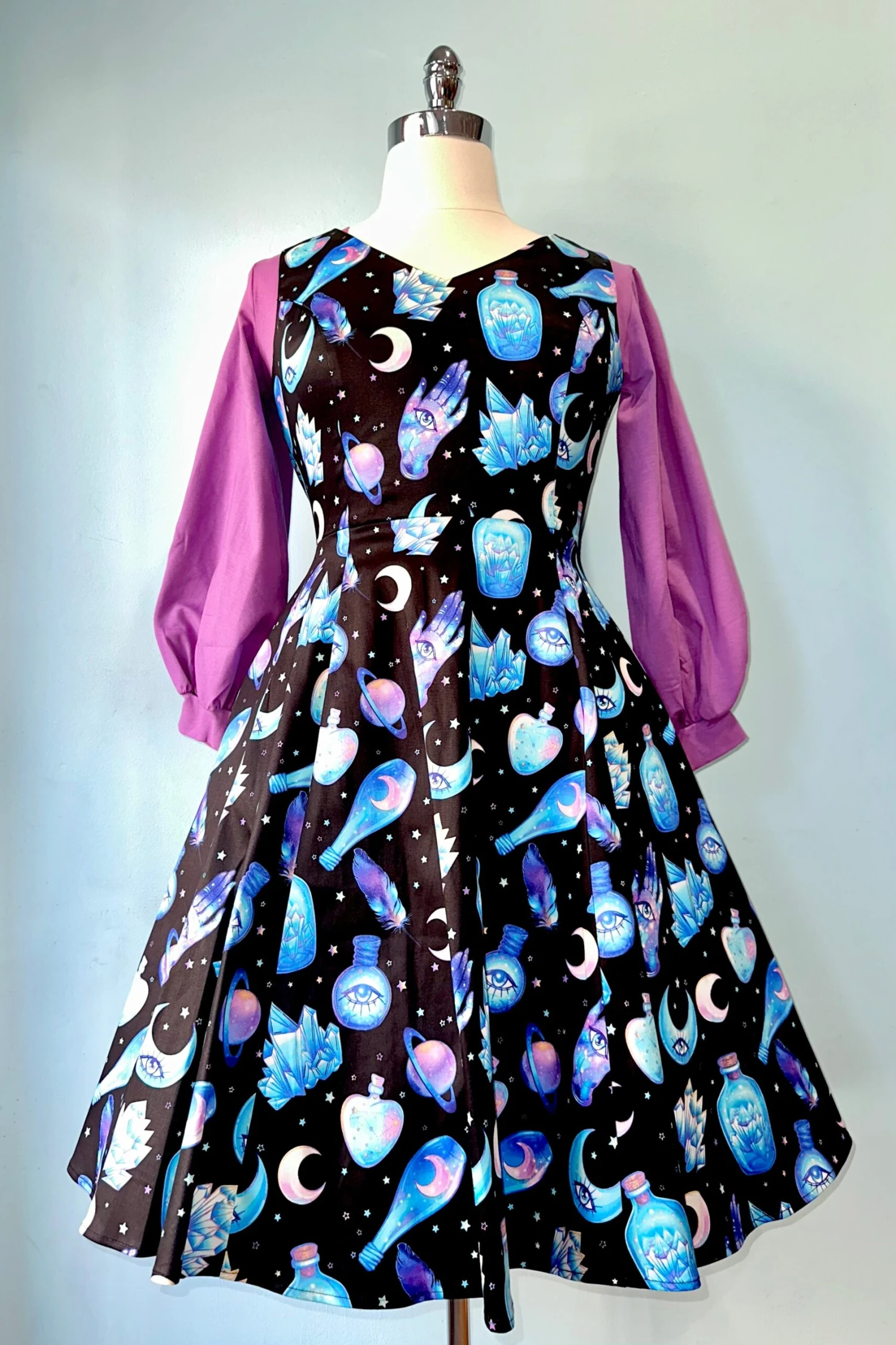 Our Eva Rose V-Neck dress in the new mystical print! This fabric has a black background with a a print in blue and purple of crystals, moons, eyes, hands, bottles and more! Made of a cotton spandex blend, has stretch and a wonderful full skirt for that perfect fit and flare! This dress is not lined and has pockets!