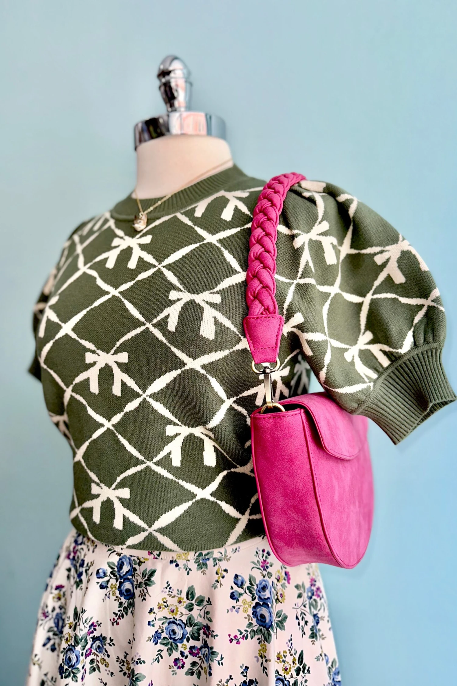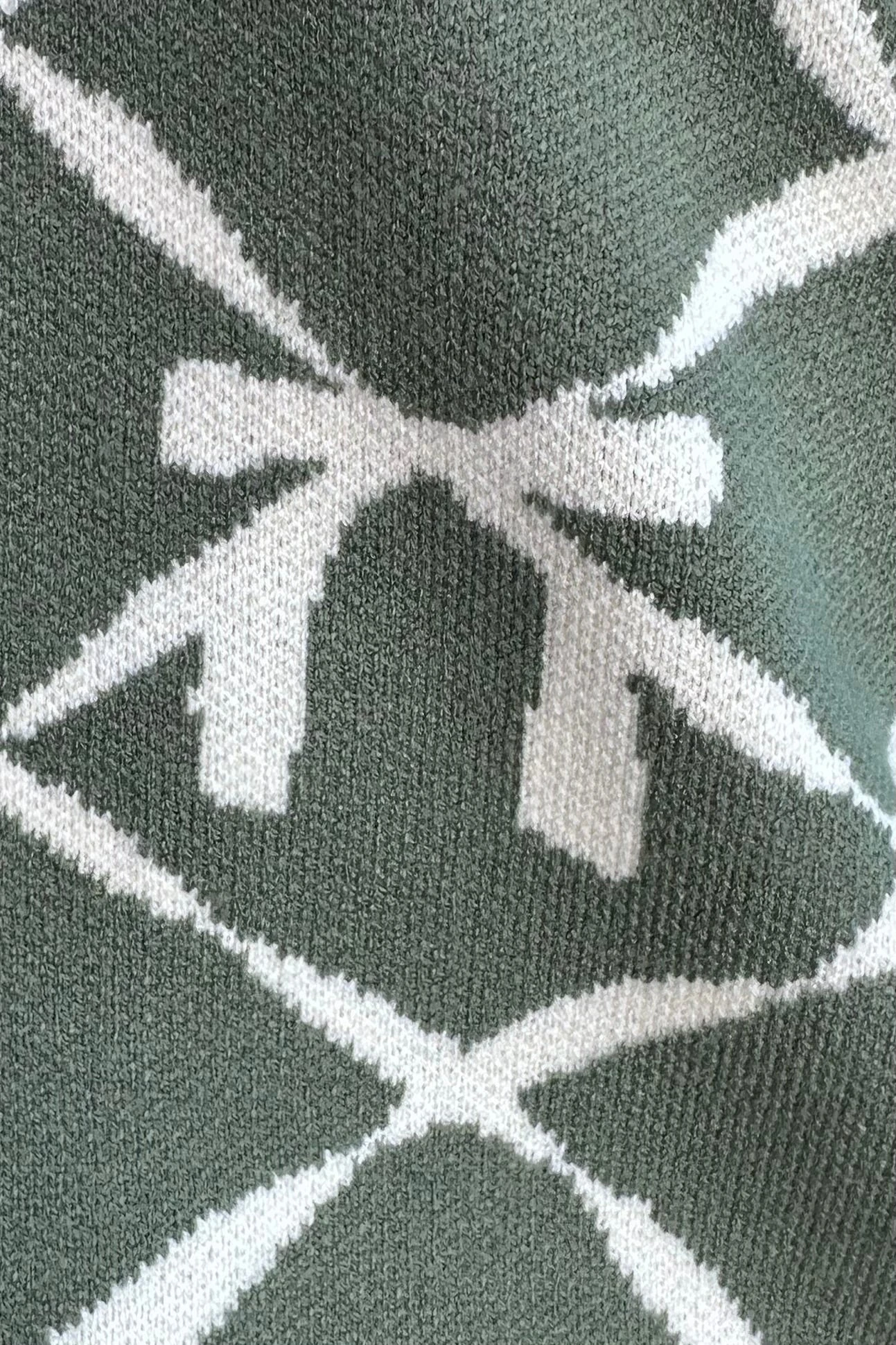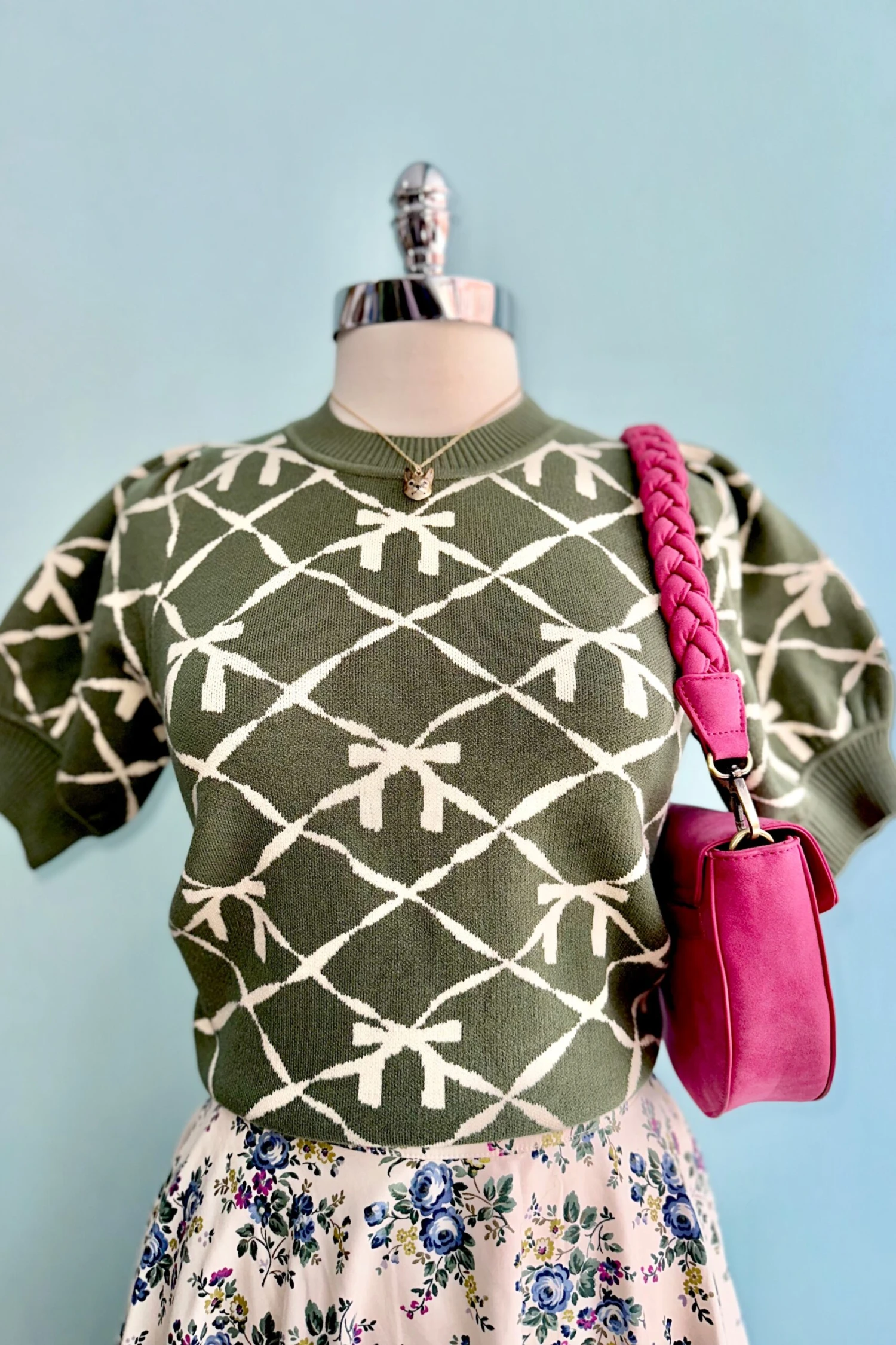 Olive sweater with an ivory bow print throughout. This sweater has short sleeves with gathering at the shoulder. Semi-fitted style.