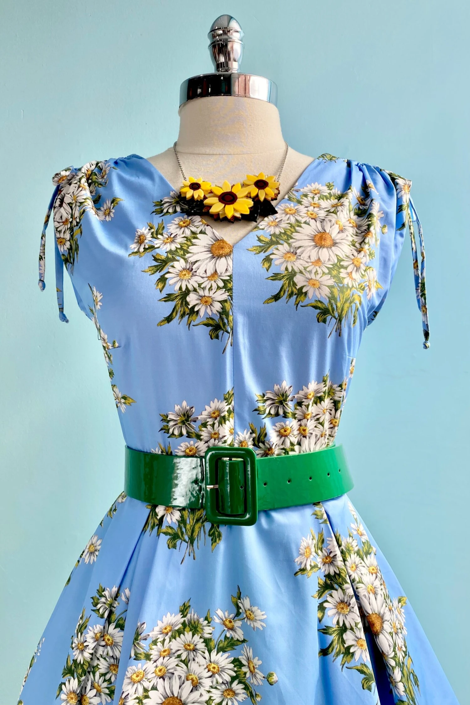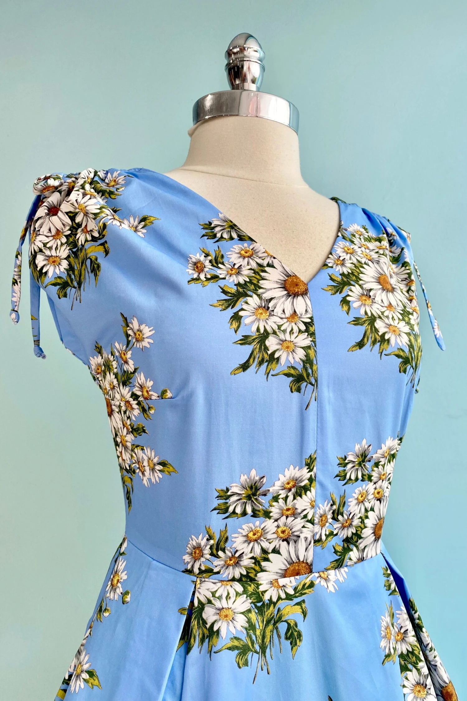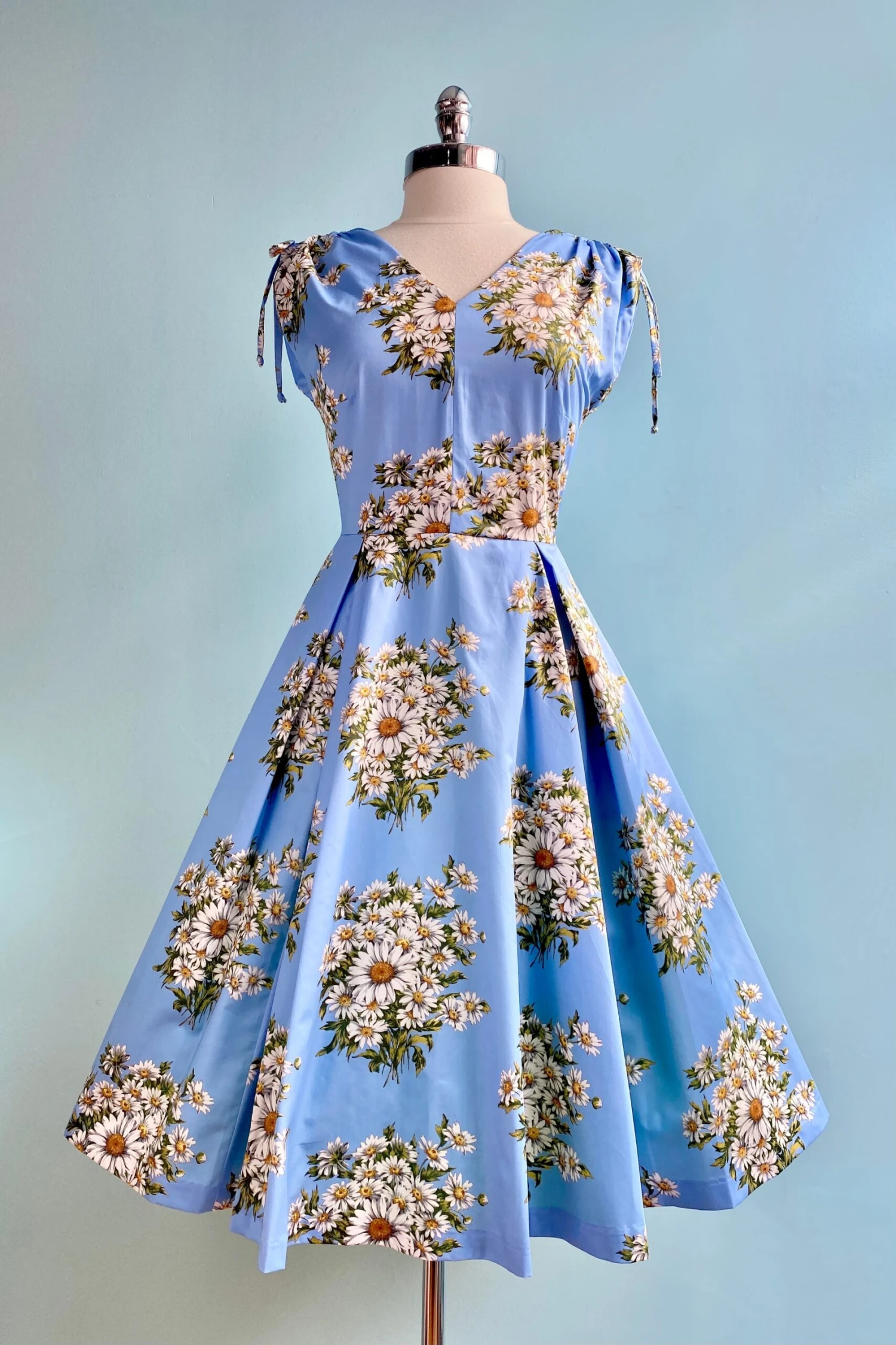 Louisa is a new style of dress by the wonderful brand Retrospec’d of Australia. Beautiful blue dress with a daisy bouquet pattern throughout. The sleeves have a tie at the top that can tighten or loosen to be a tank style or capped sleeve. The skirt has pleats and is full with hidden side pockets. This dress is not lined.