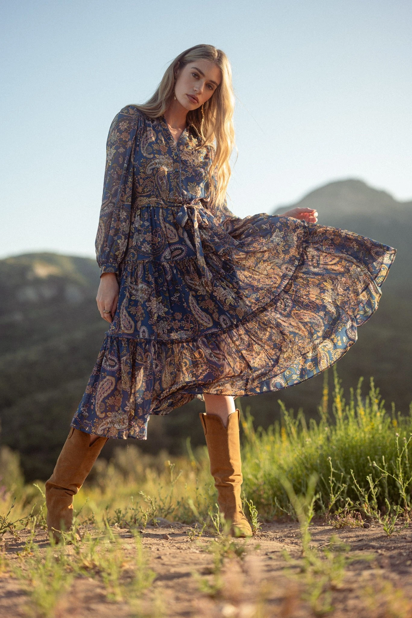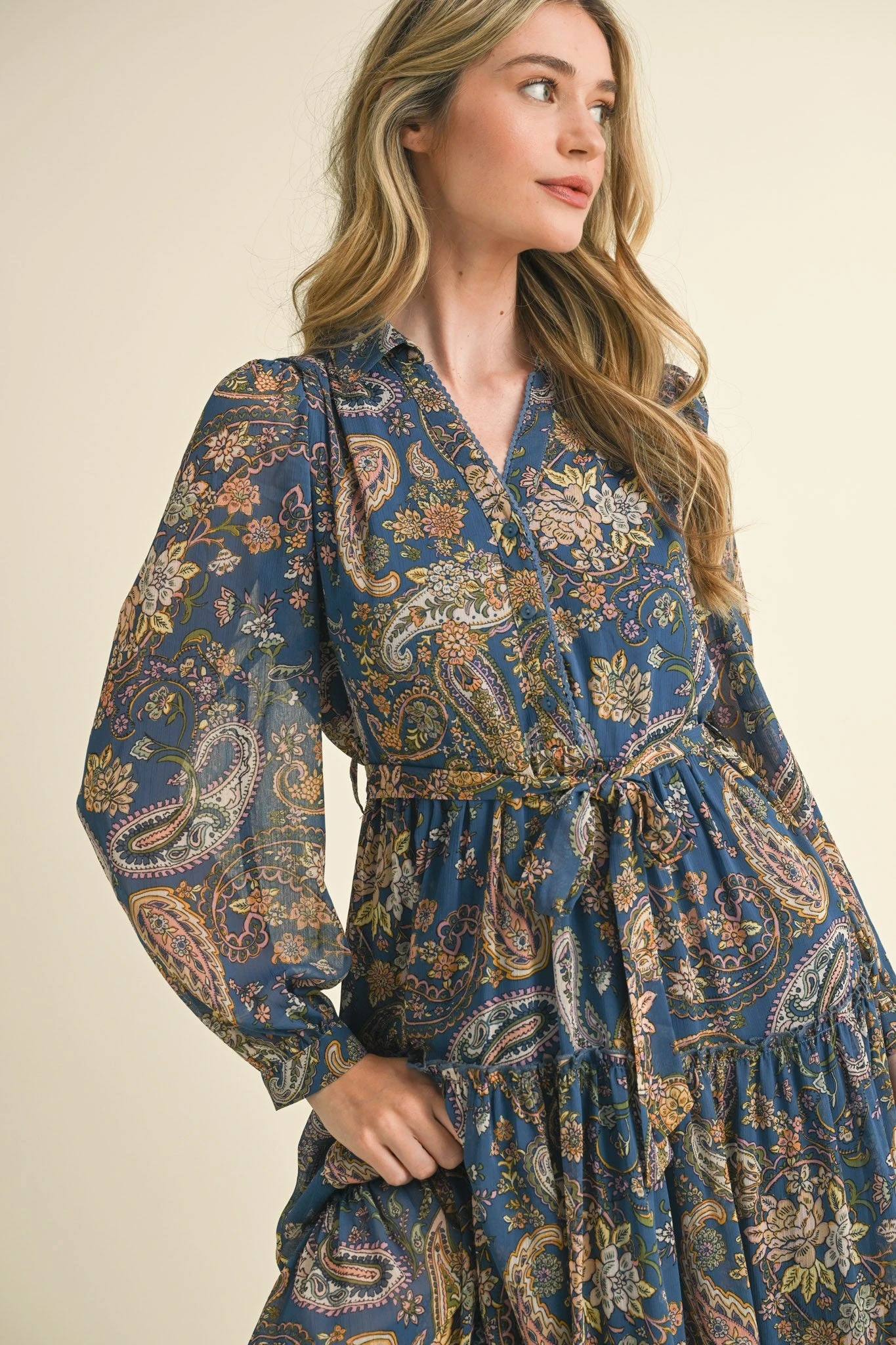 Navy paisley print midi dress with a fold over collar and long sleeves. The bodice has a summary front and no darting, so the fit should be slightly blousy. The fabric is navy with a pink, green, and pink flowers and paisley print. The skirt is full and tiered with ruffles and an elastic back waist. There is a ric-rac trim along the summary placket. The sleeves are long and full with a summary fastener. The bodice and skirt are fully lined.