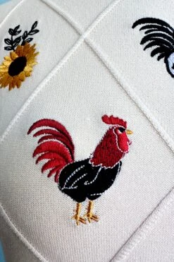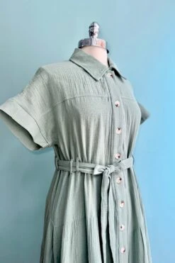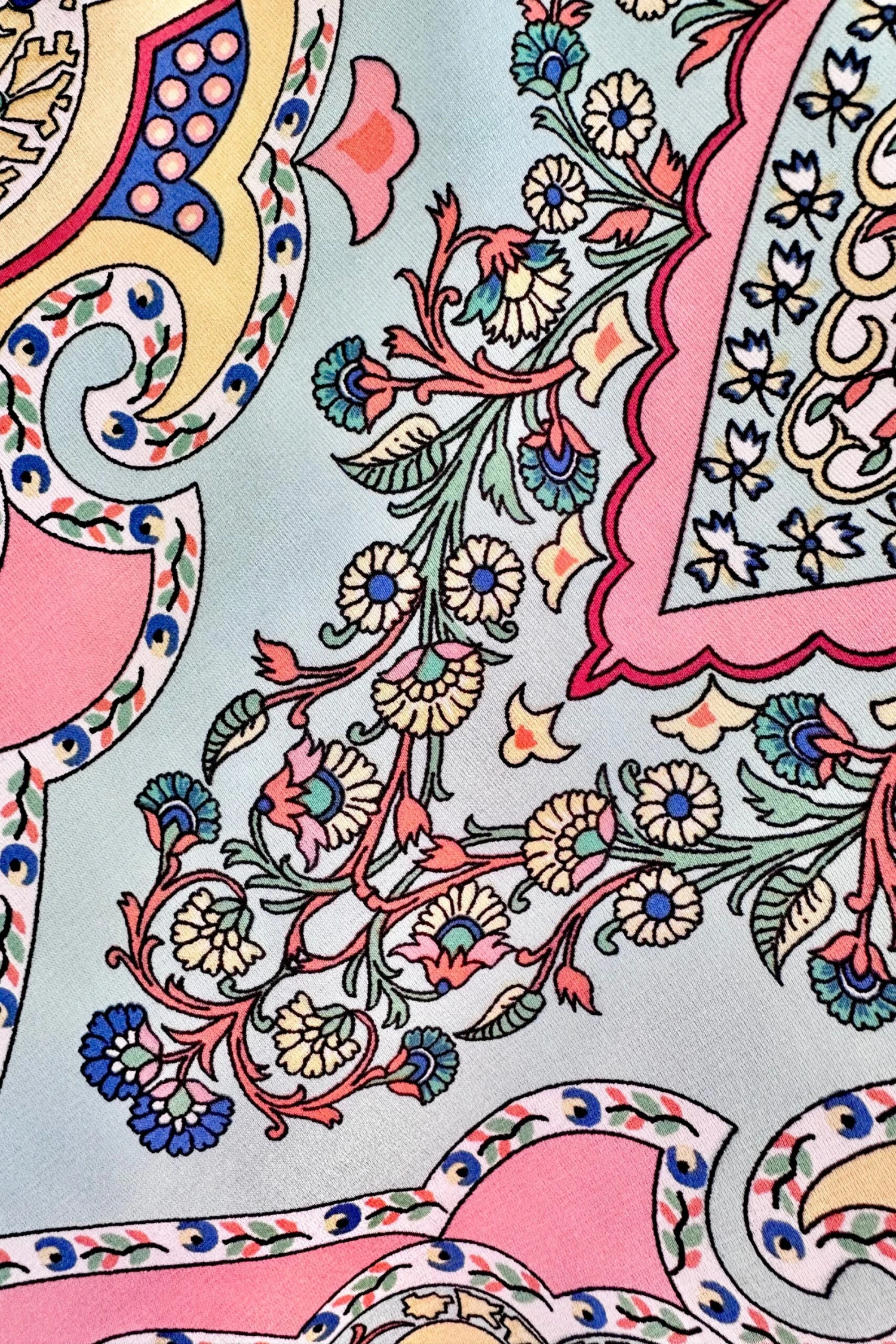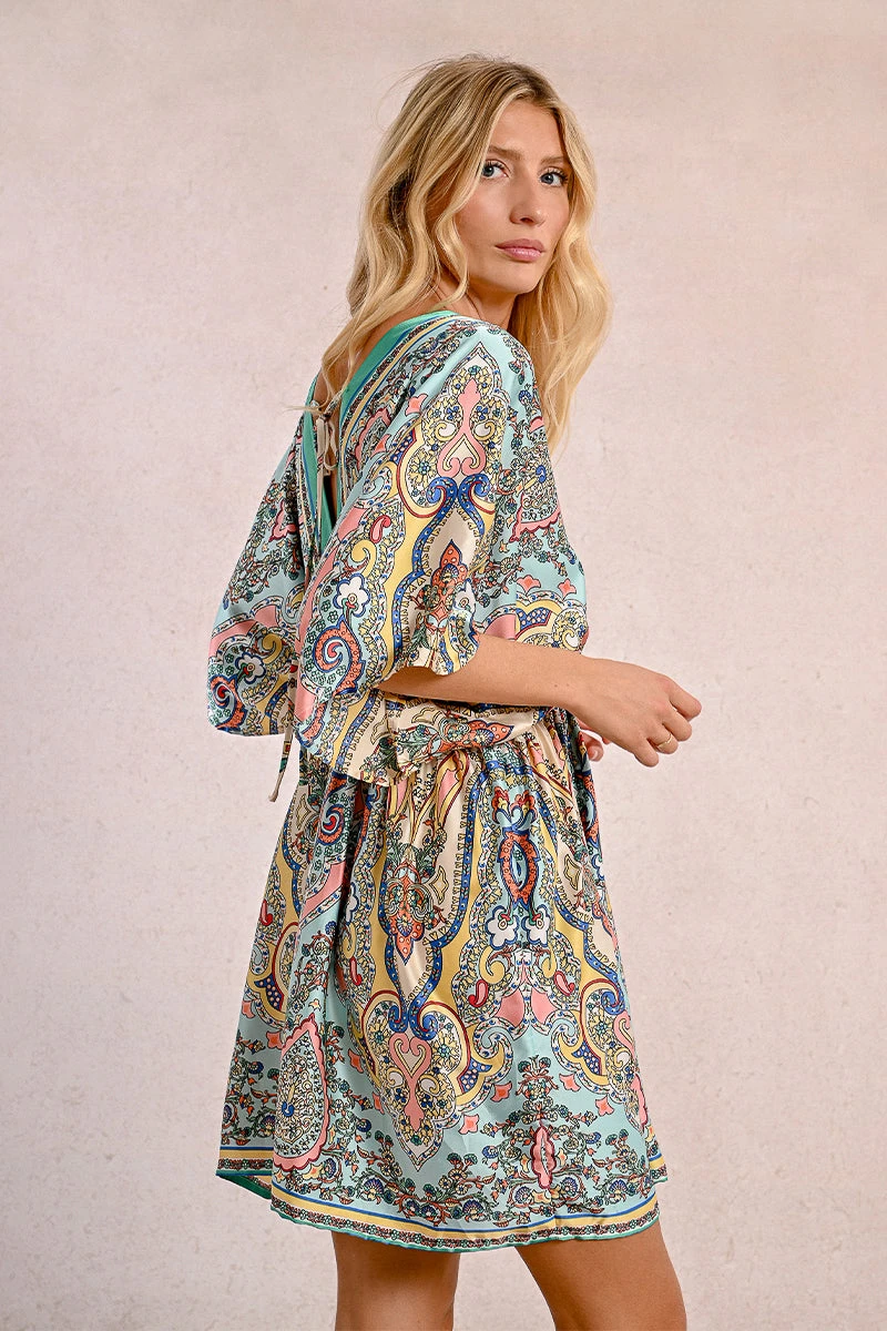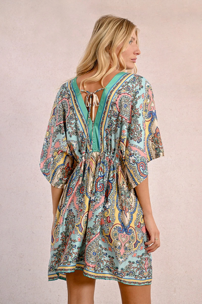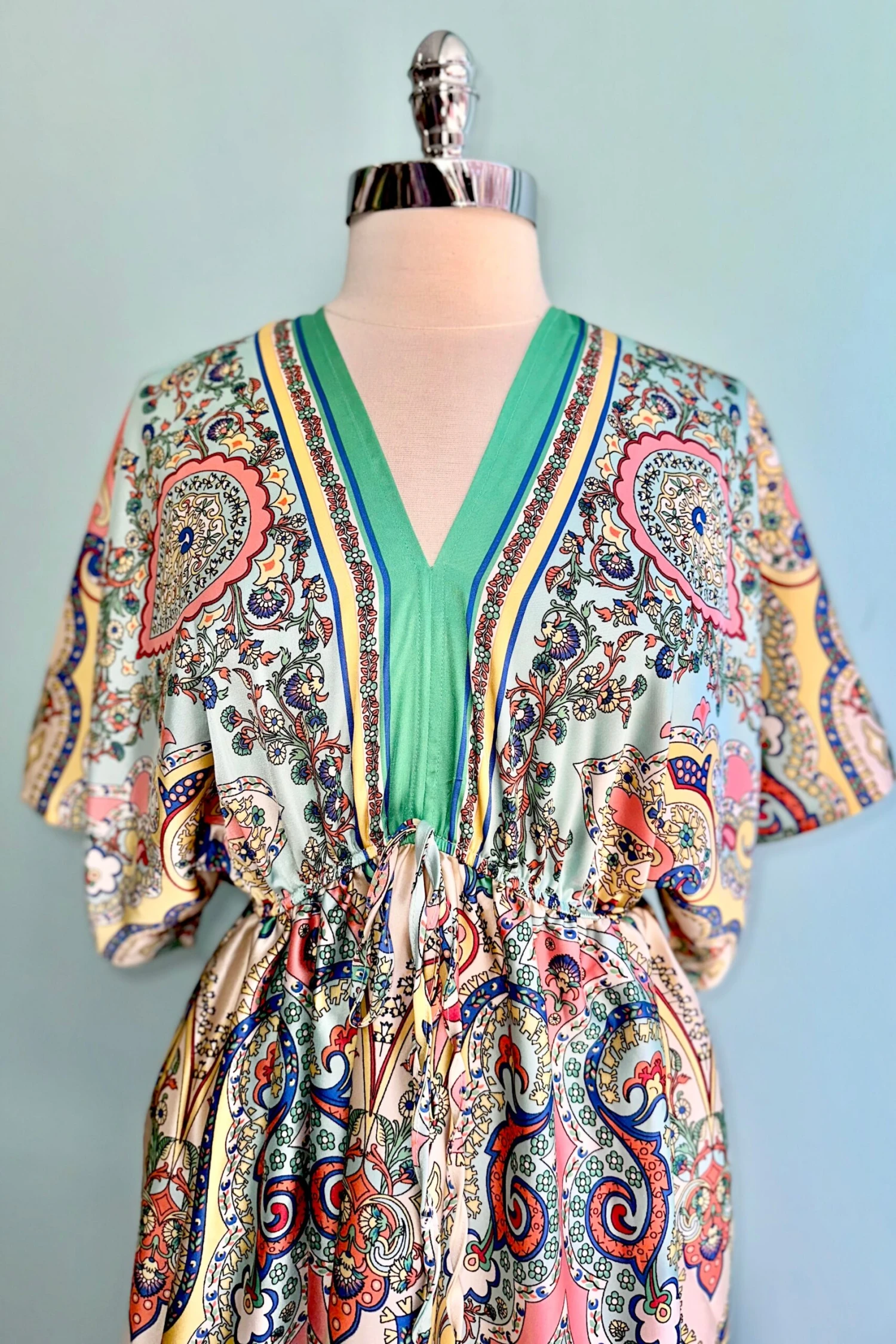 A paisley mini caftan in ivory with a print of peach, blue, yellow, green and red and a mint colored trim. The fabric is very silky to the touch and the fit is loose and flowy. The waist is elasticized and there is a tie on the back of the neckline and the front of the waist. This caftan does not have pockets.
