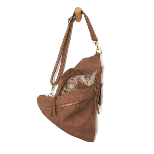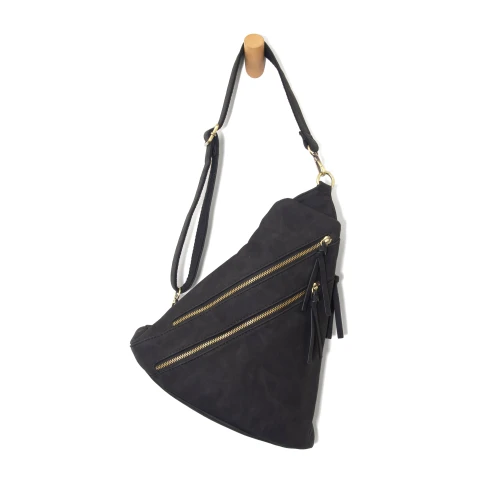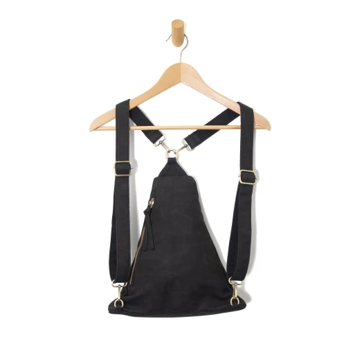 Sling bag with a convertible strap that can be worn as a backpack. There are two front zip pockets, one side zip, so much space!