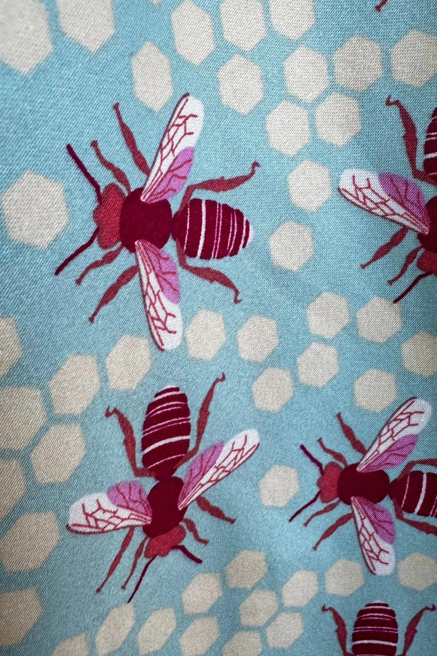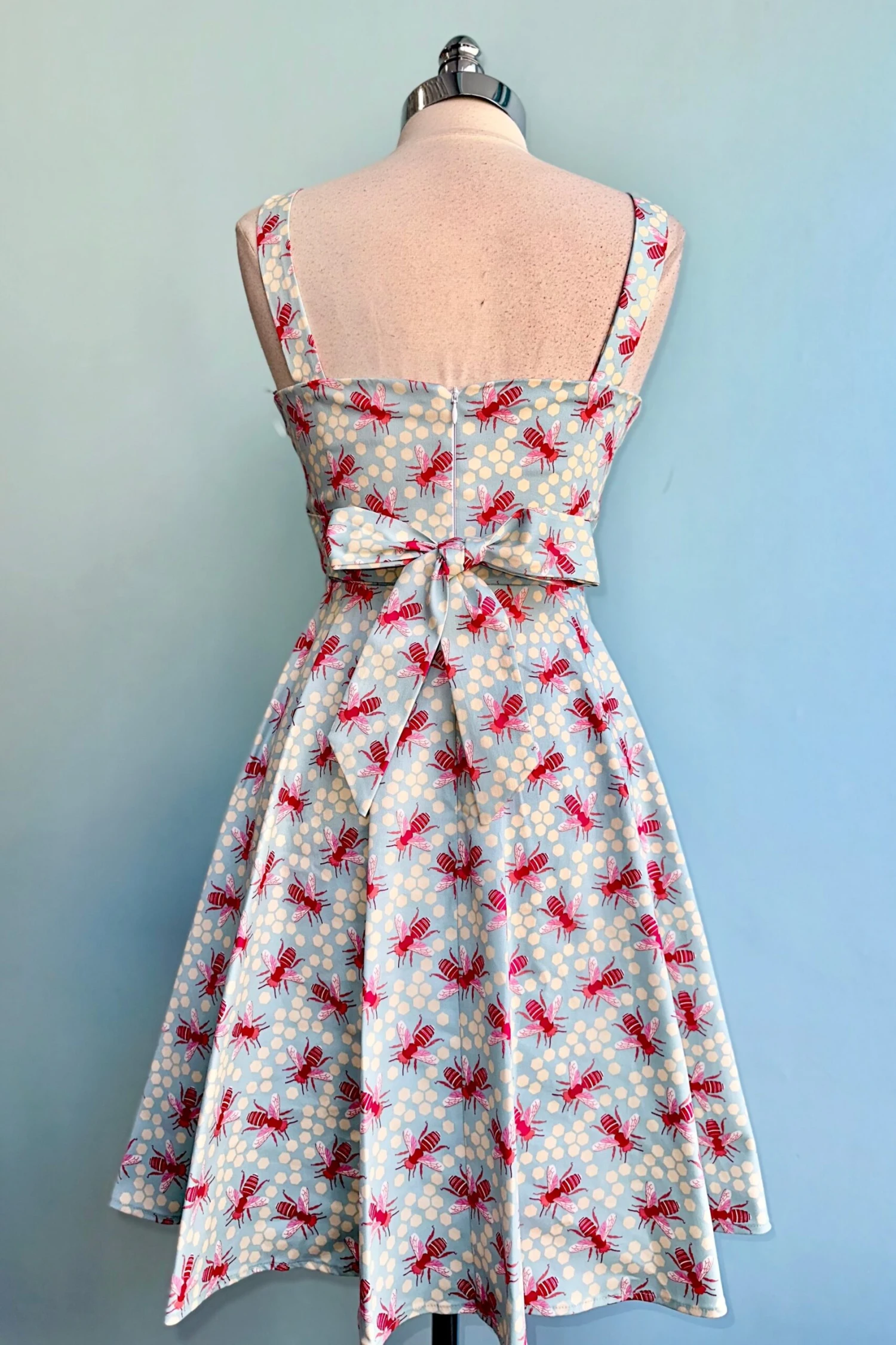 Sleeveless fit and flare dress in our bee and honeycomb print! Features a light blue background with a print of fuchsia pink big bees and ivory hexagon shapes throughout. This dress has detailing at the bust, waist tie in back, and has POCKETS! This has a padded bust so you could possibly go bra free! Zips up the back and has fixed straps. This length falls just above/ at knee.