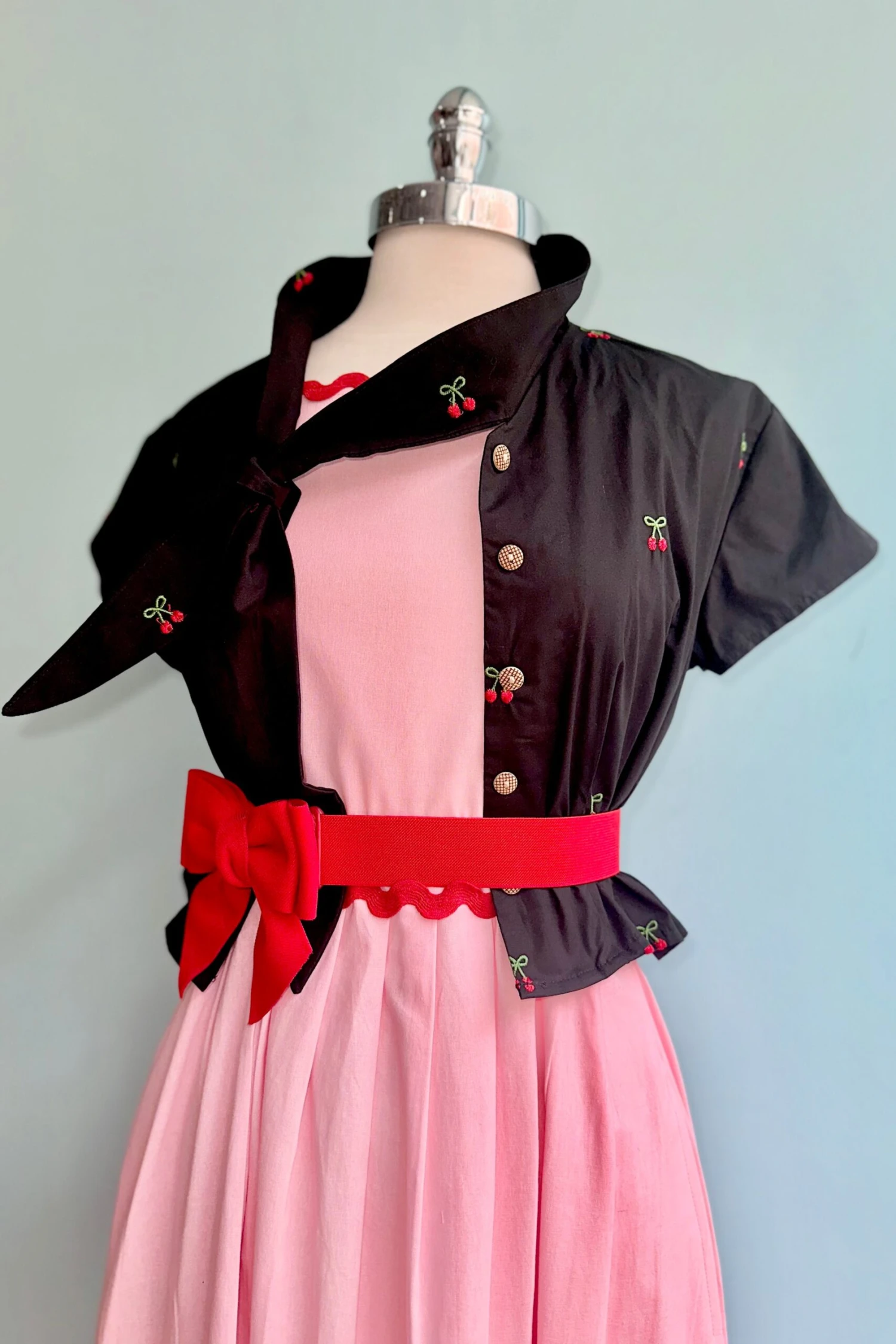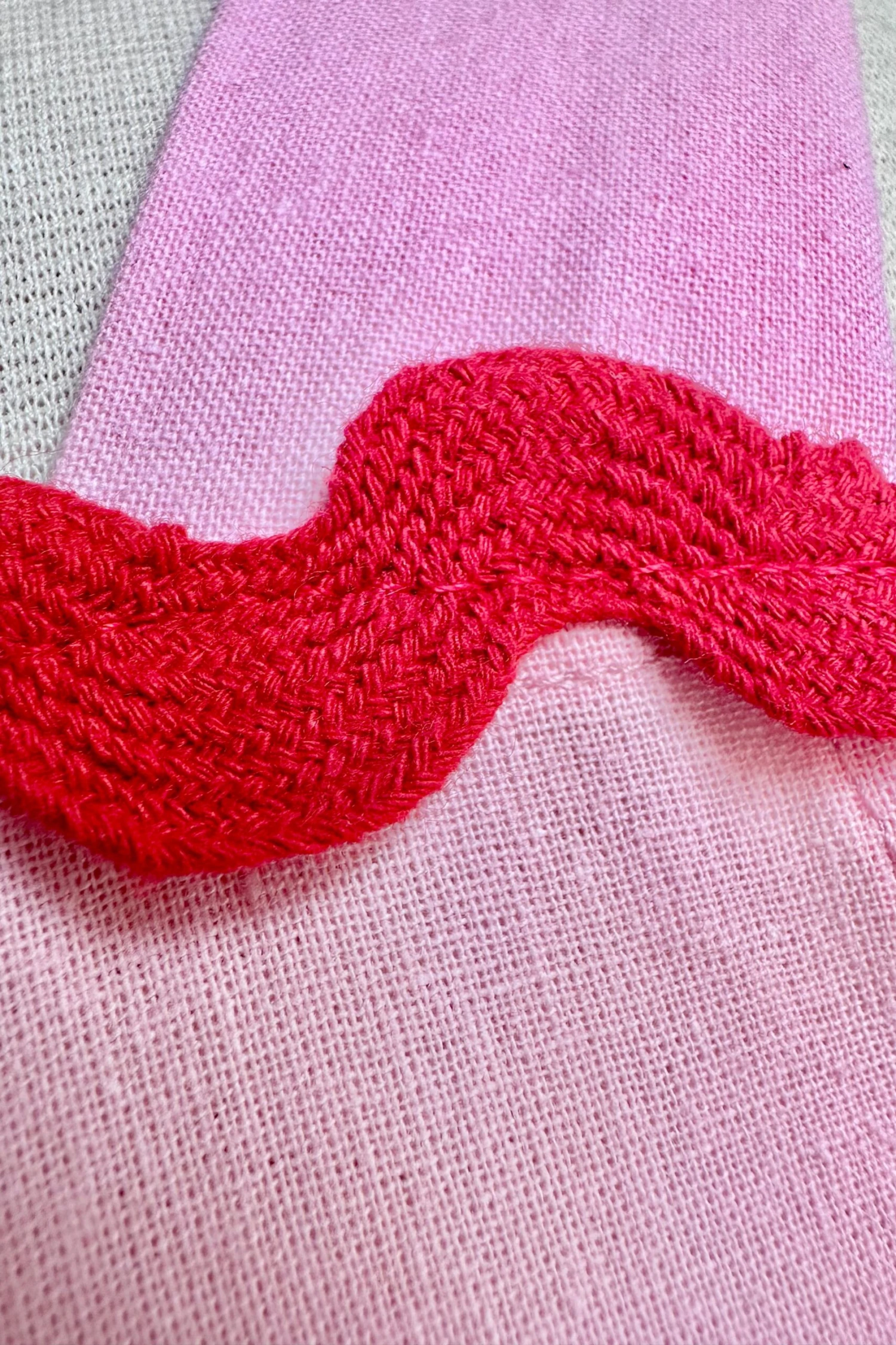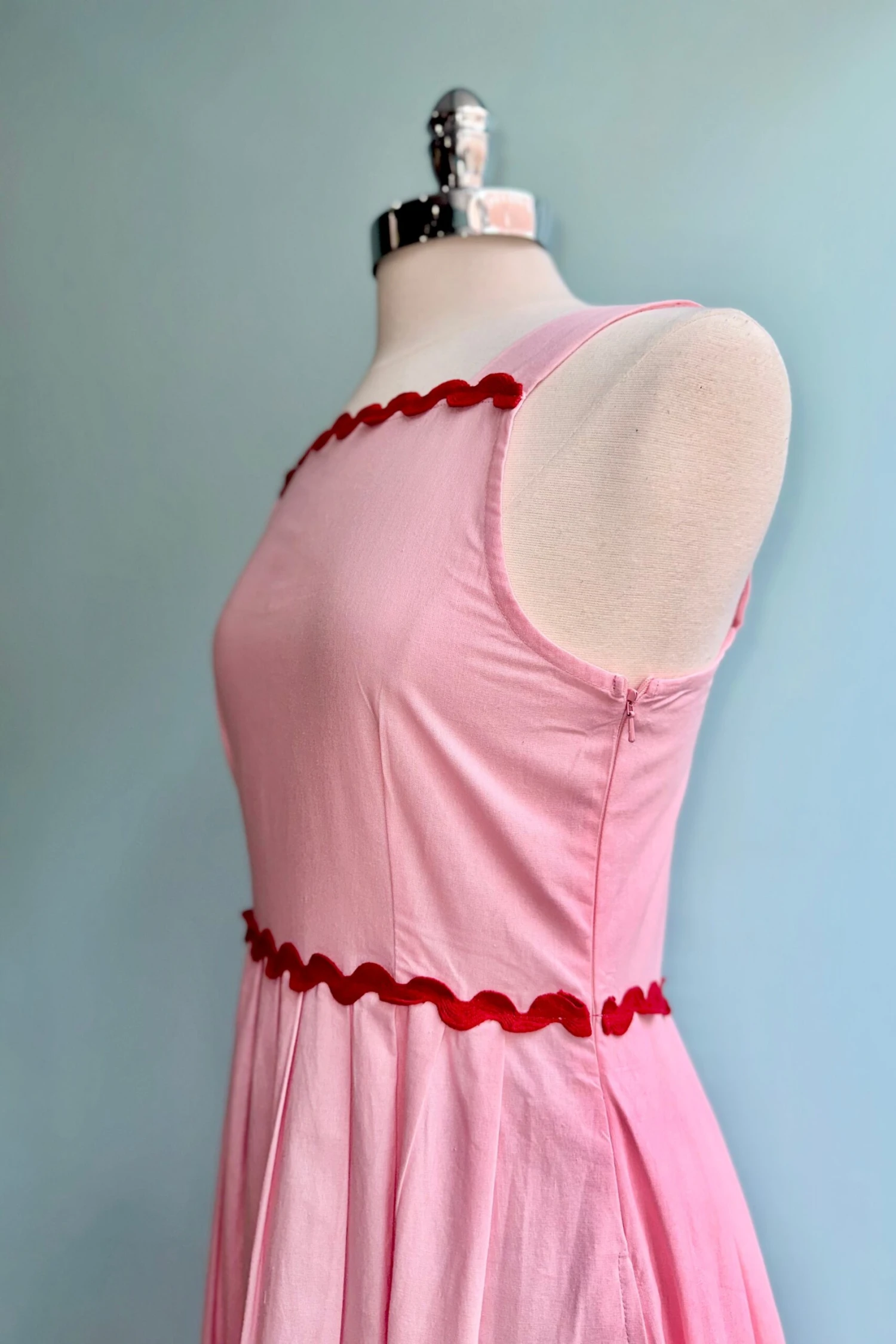 Pink tank dress with red ric-rac detail along the shoulder straps, hem and waist. This dress has a side zip closure and side seam pockets. This dress does not have any stretch and runs small.
