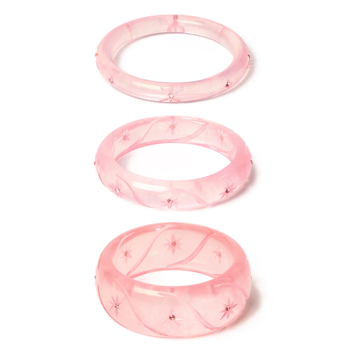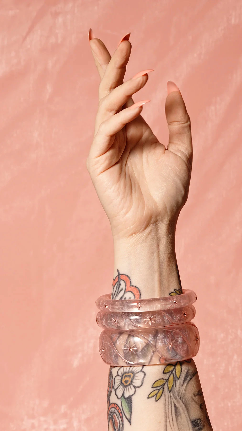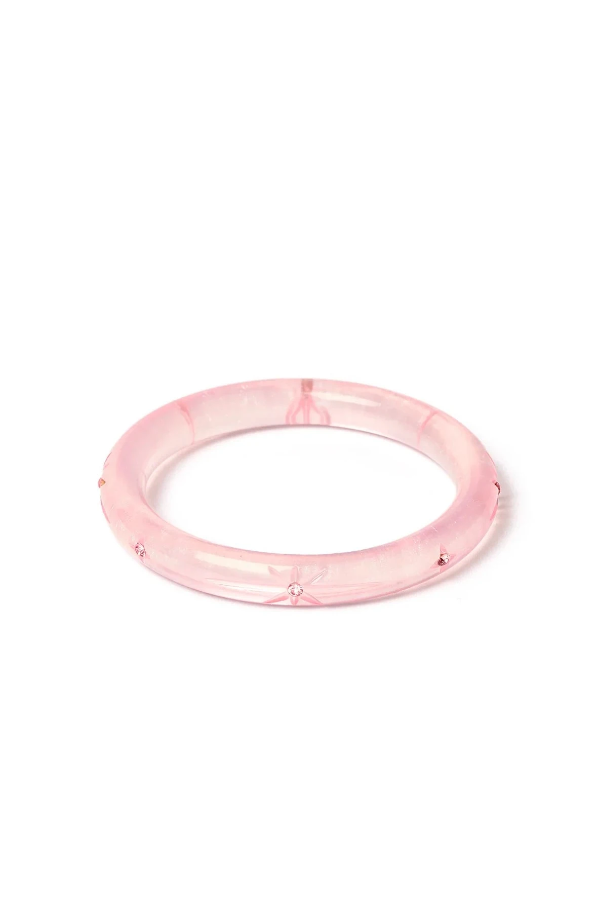 The Narrow Pink Chiffon Bangle features a carved starburst design and a gorgeous sheeny finish, reminiscent of 1950s vintage style. With sparkling diamantes, it adds a touch of elegance and glamour to any outfit.