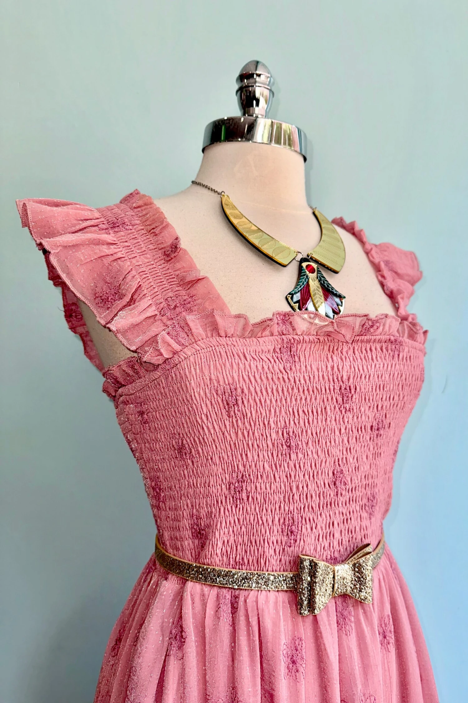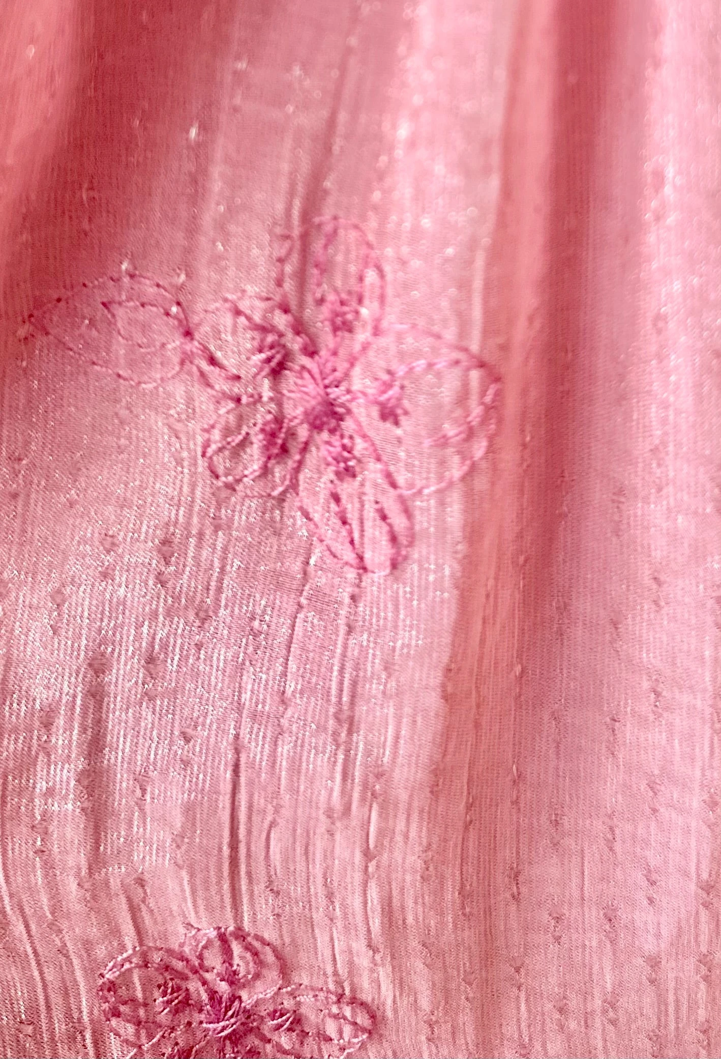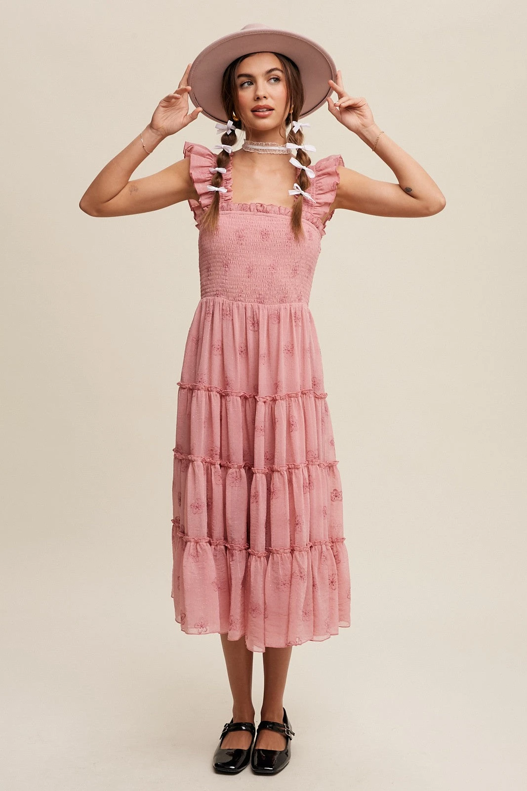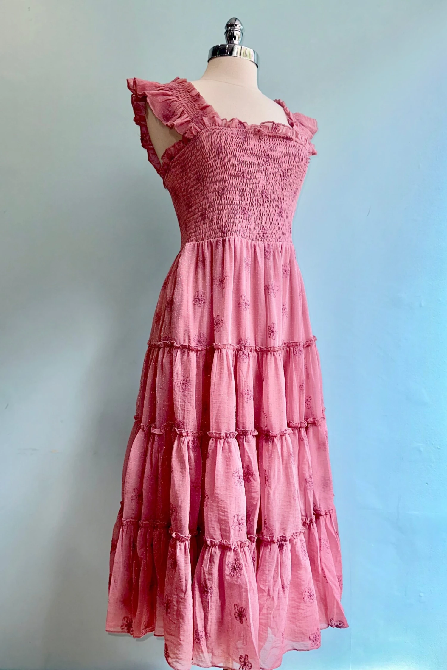 Pink floral embroidered midi dress with a tiered skirt and ruffled shoulder straps. This dress has a smocked bodice and elasticized shoulder straps to stay in place! Skirt is fully lined. The fabric is lightweight almost gauzy and soft.
