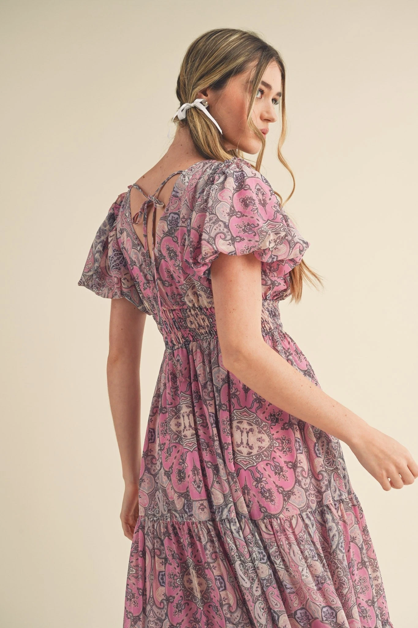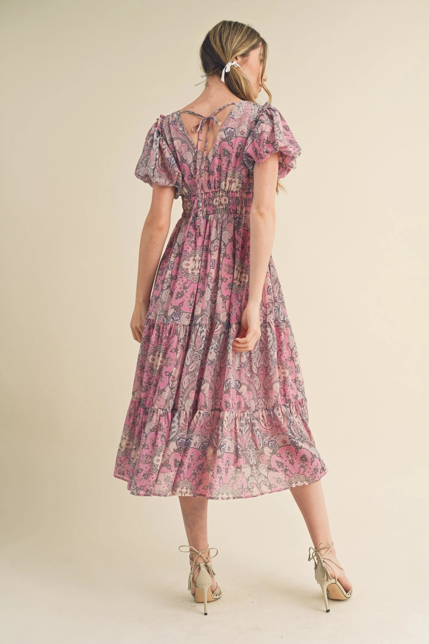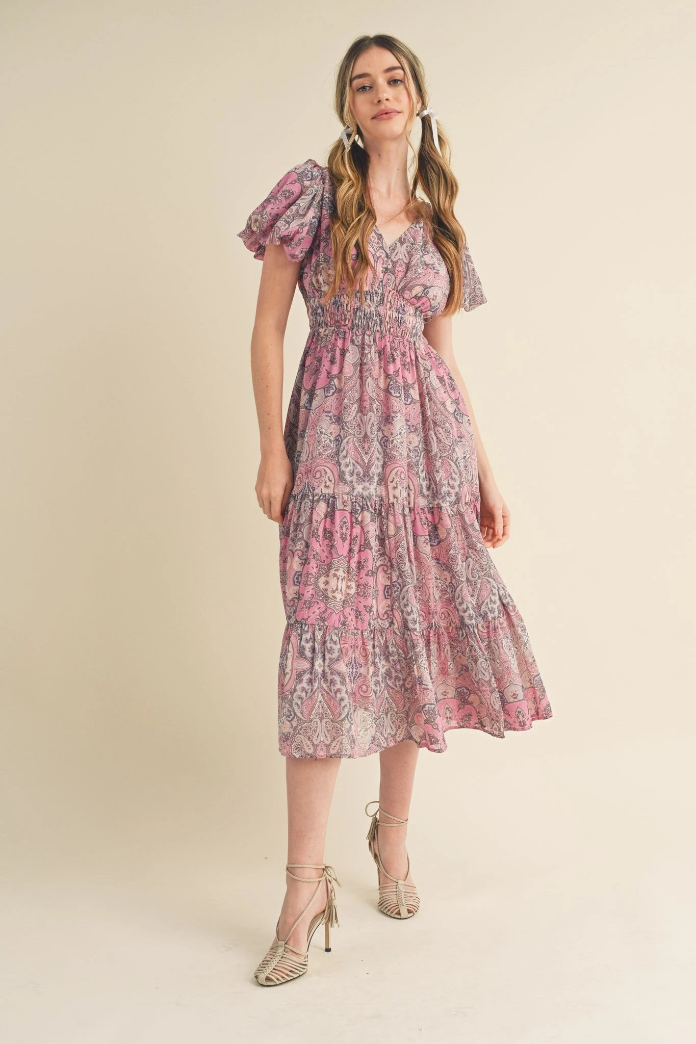 Pink paisley midi dress with the best bubble sleeves! This dress has a smocked elastic waist and a v-neckline. The fabric is pale pink with a black paisley print. This is fully lined.