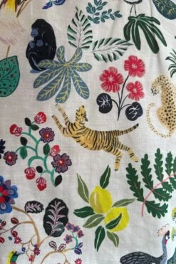 The cutest backpack with a print possums, strawberries and flowers. The back and straps are black. The is one large compartment that zips closed and one small front zip pocket. Very lightweight!