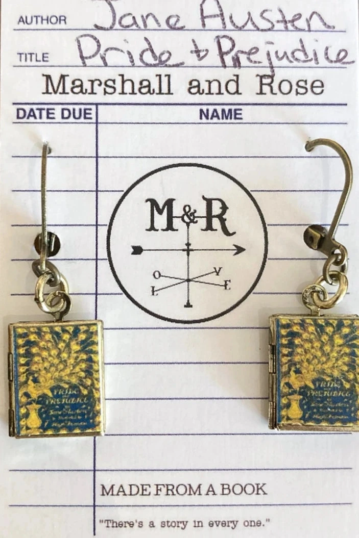 Book Locket earrings in Pride and Prejudice! Our new book locket earrings are made with nickel free materials and feature the most beloved classic and modern books! They are on lever back style backers and are sealed with a gloss finish for durability. Each little locket measures about 1/2 long and 3/8 wide and is a little less than 1 1/2 inch long while wearing them.