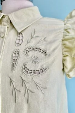 Sage-Lime Cut-Out Embroidered Button Down Top