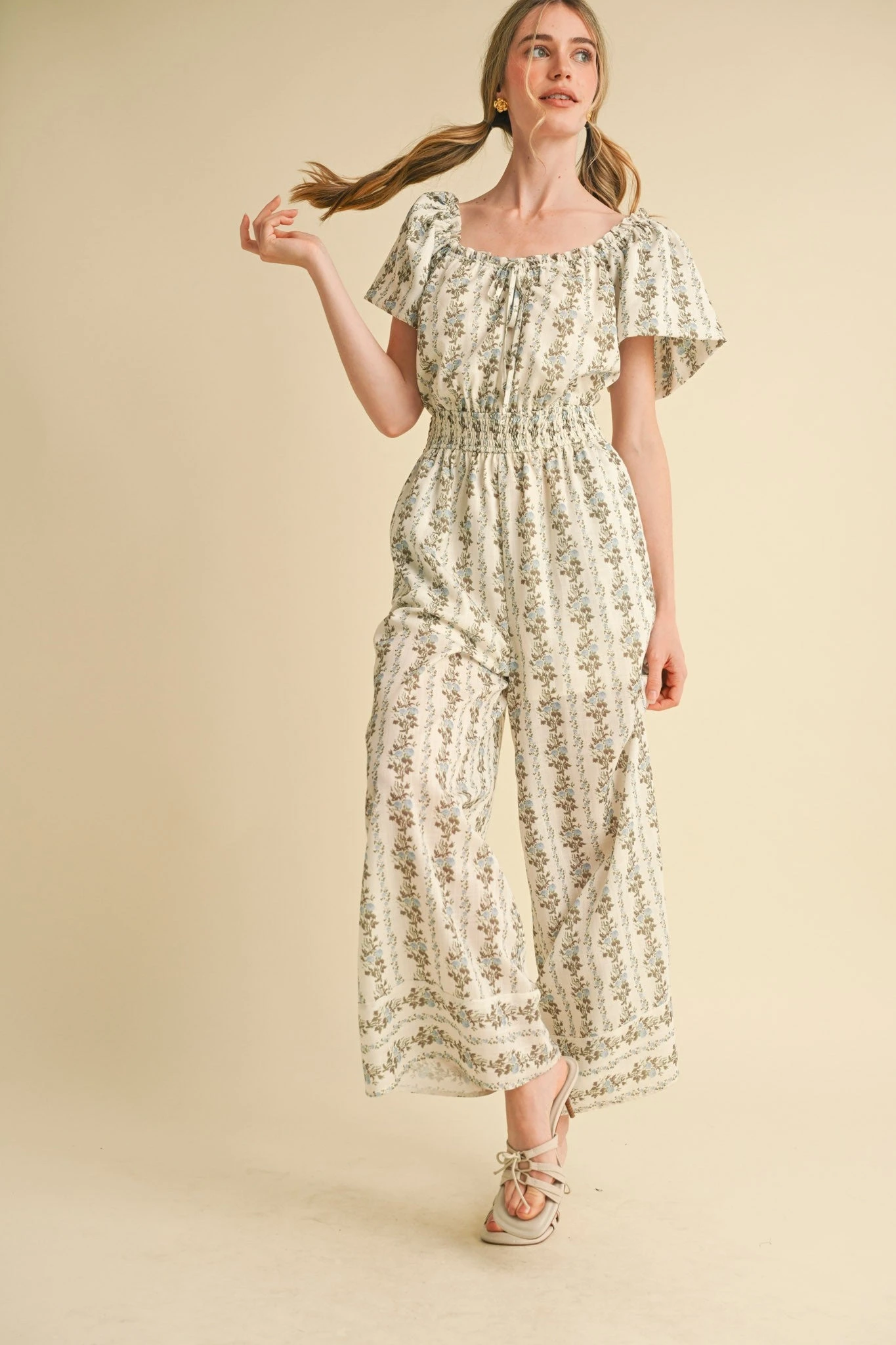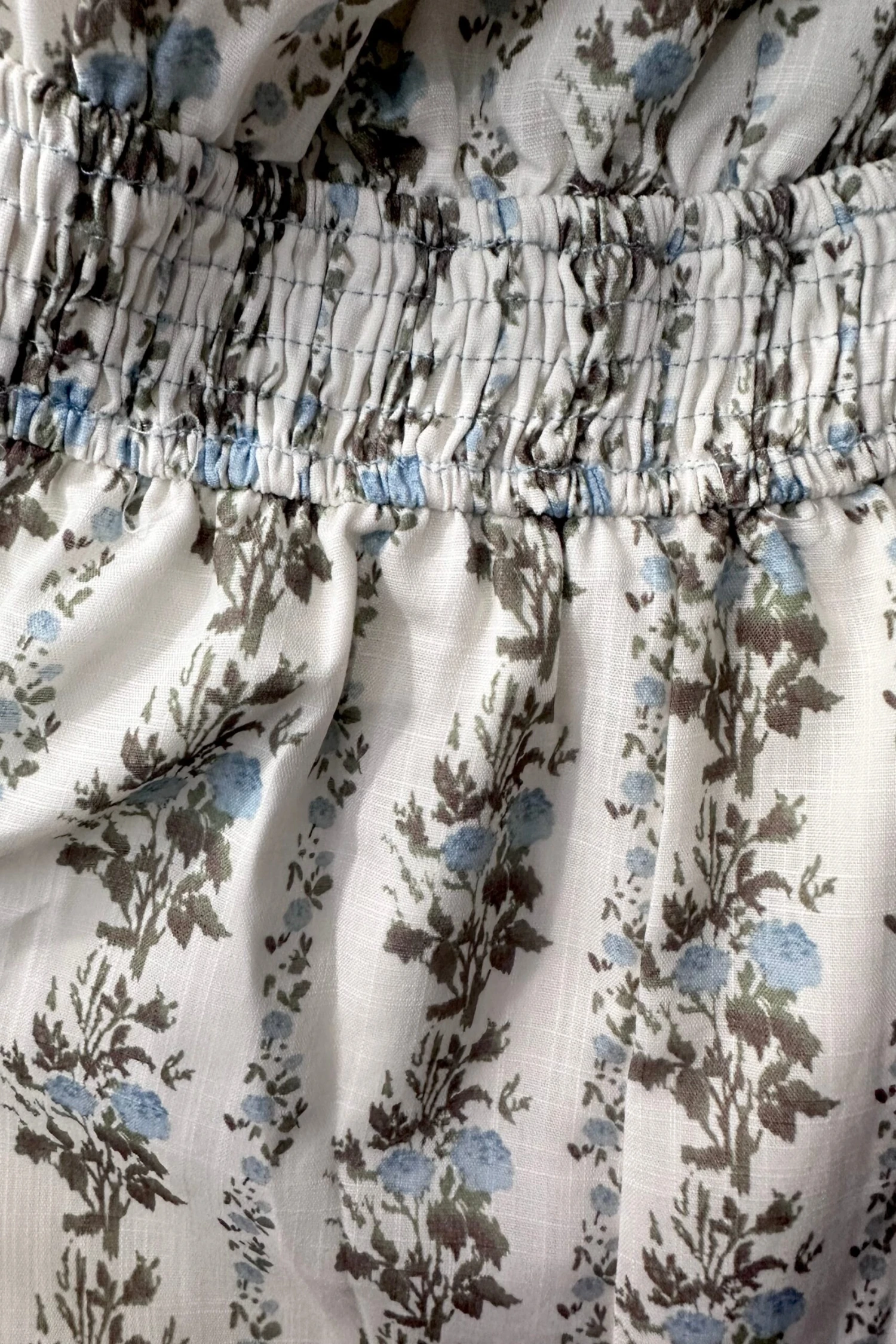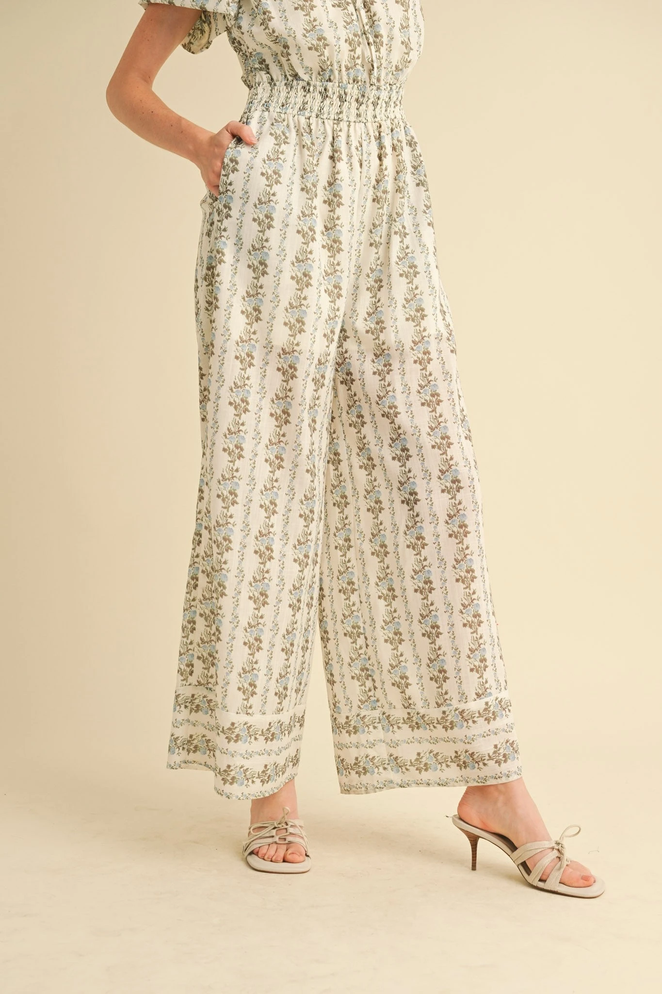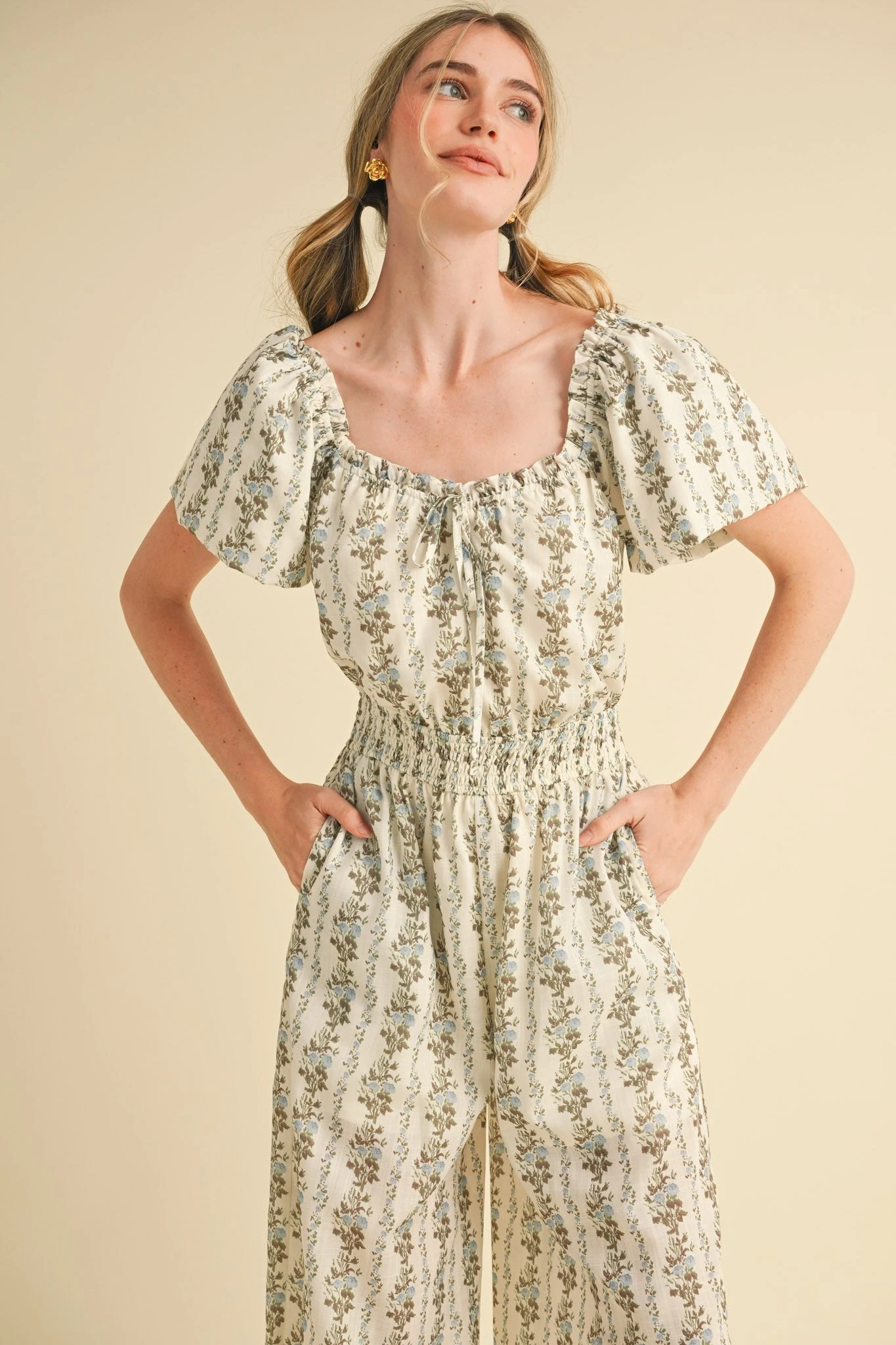 Jumpsuit with puff sleeves and a blousy bodice. This jumpsuit has a smocked elastic waist for easy on and off. The fabric is off-white with little blue flowers and green and brown stems. The bodice is lined and the legs are lined in shorts length. The legs are wide with side pockets.