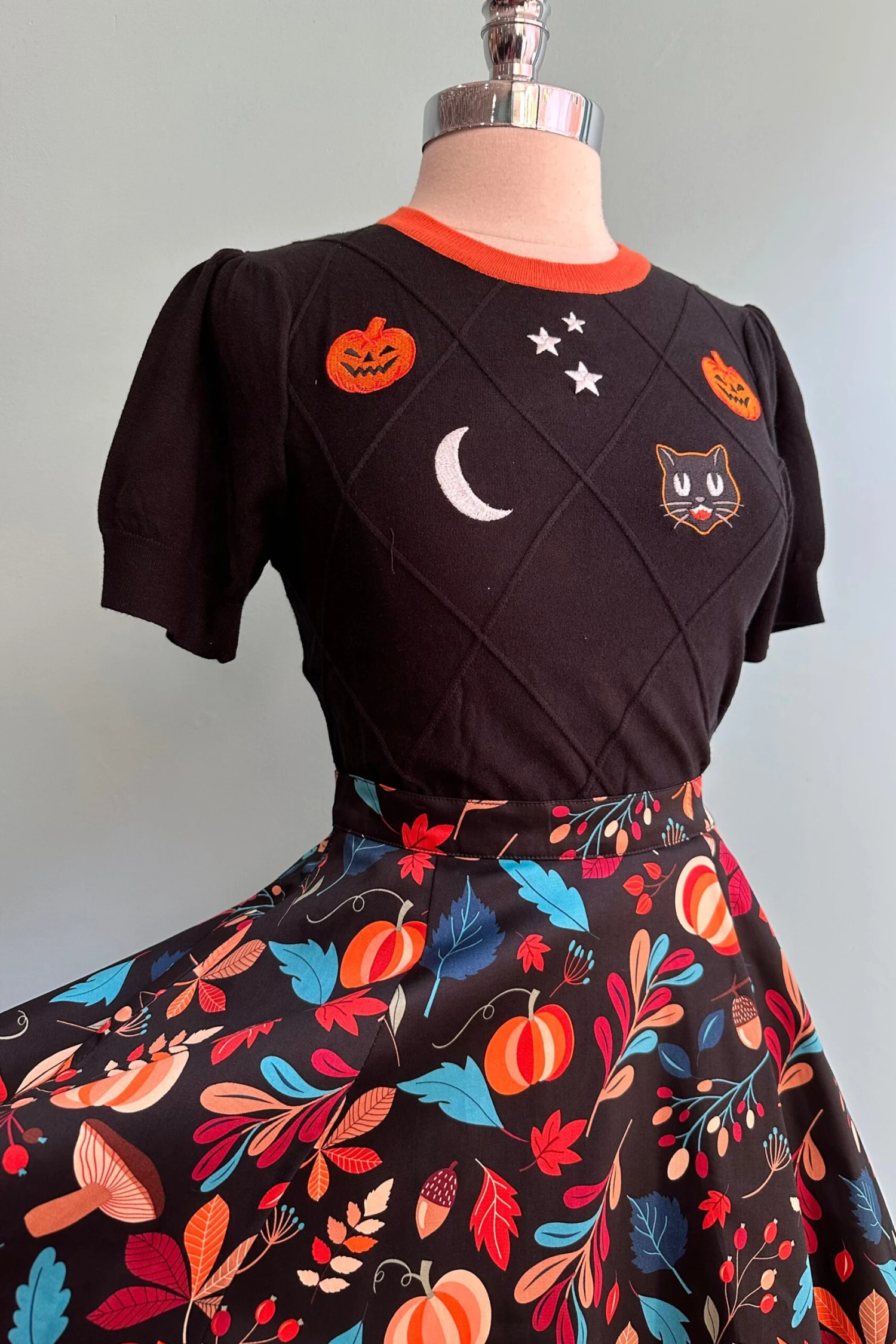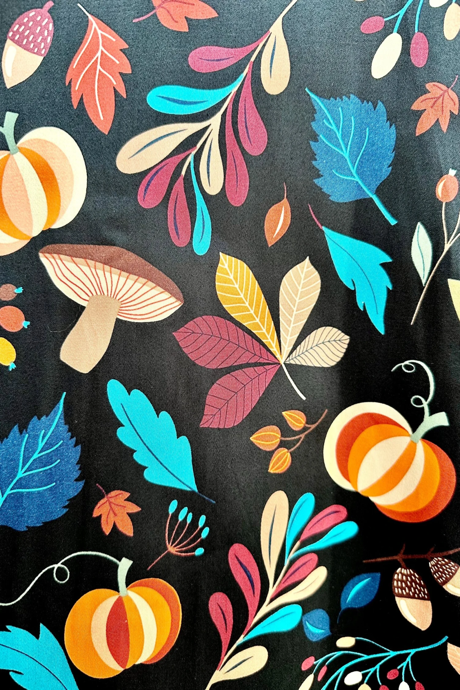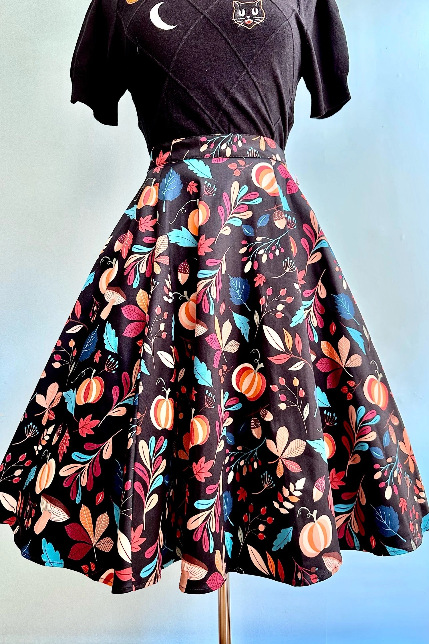 Full skirt in black with a print of leaves, acorns and pumpkins in teal, orange and tan. This skirt has pockets and zips up the back. Made of a cotton and elastane blend, there is some ease to the fabric but no real stretch. This skirt is easy to wear and pairs great with a fun tee for a casual look or with one of our bow tops or blouses from Heart of Haute! Has pockets and zips up the back!