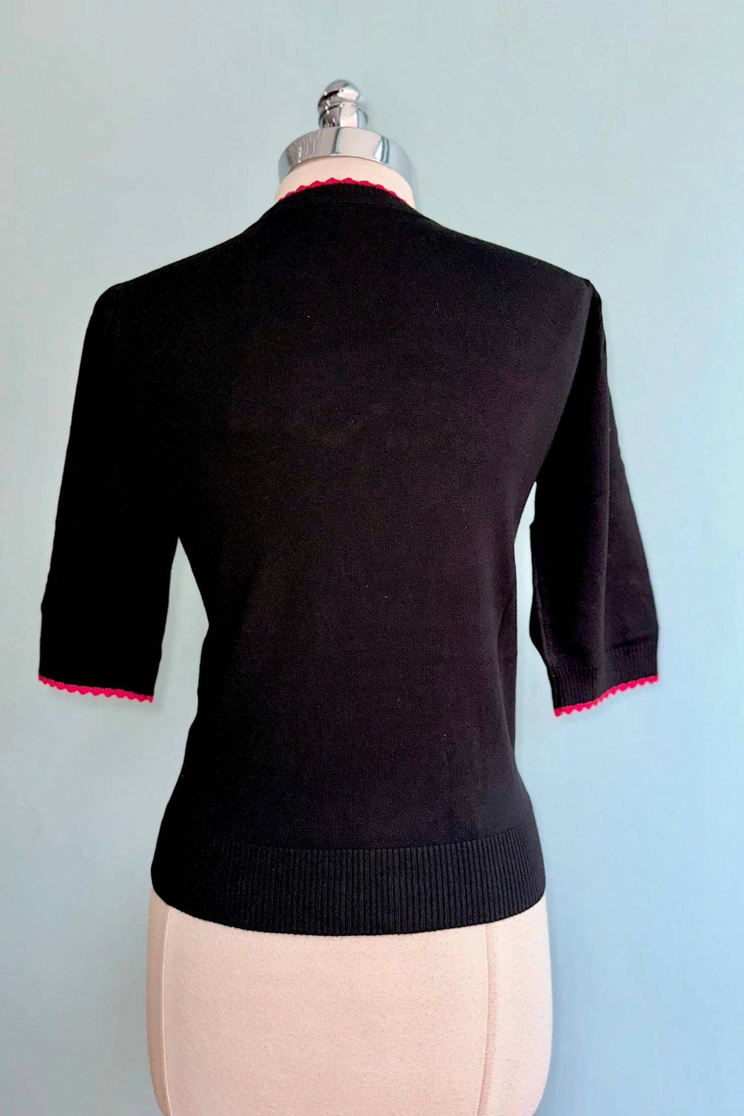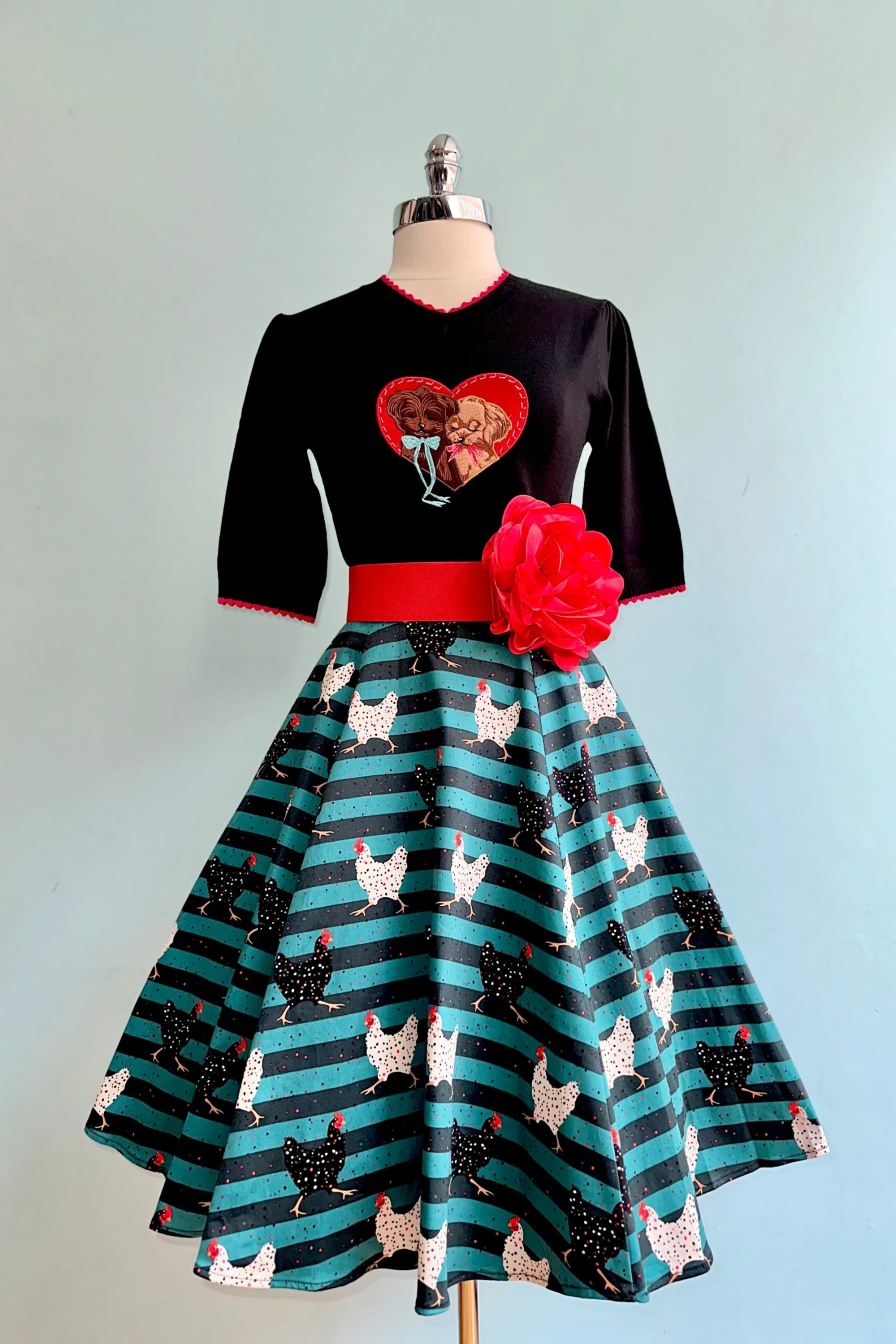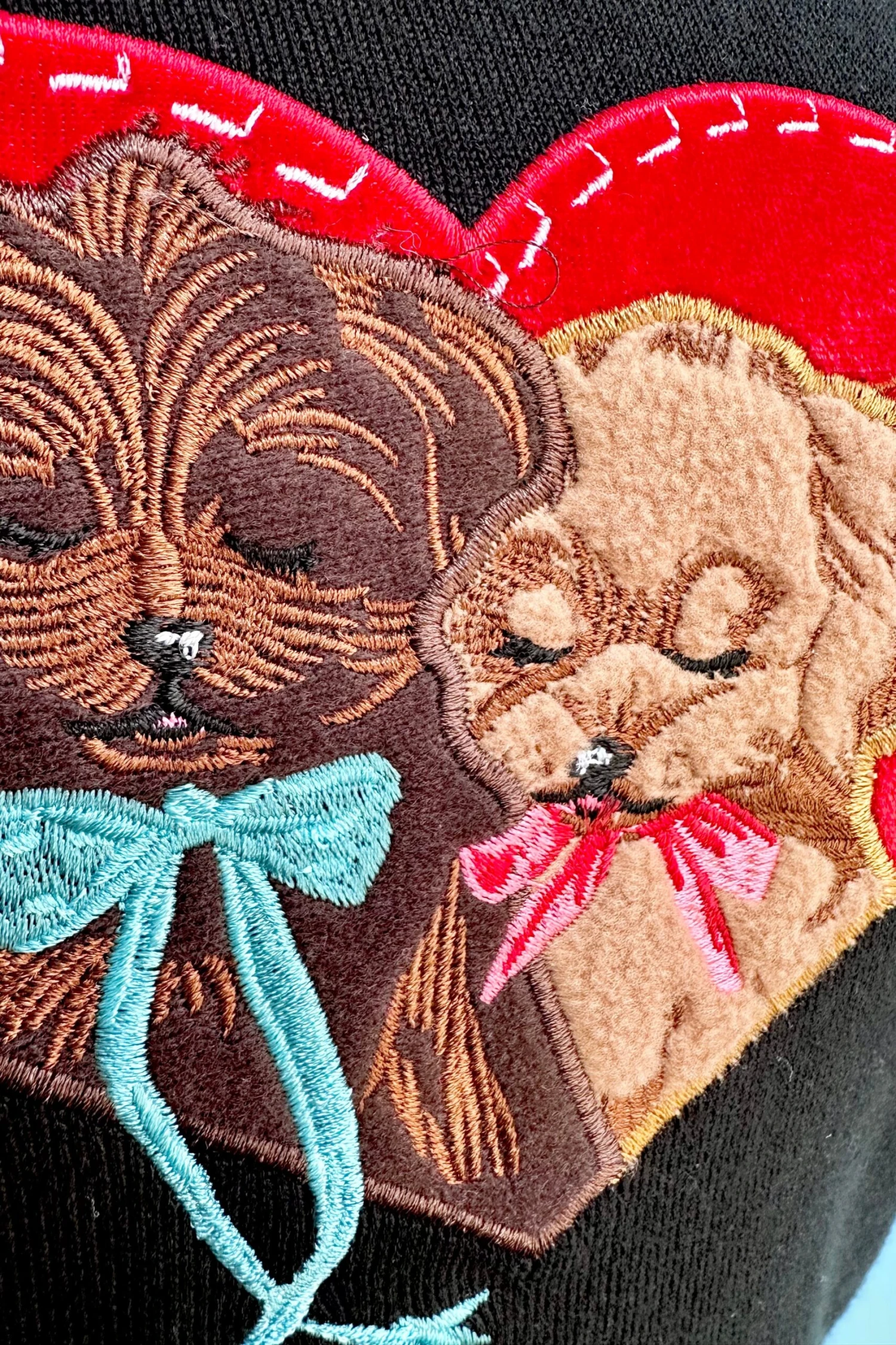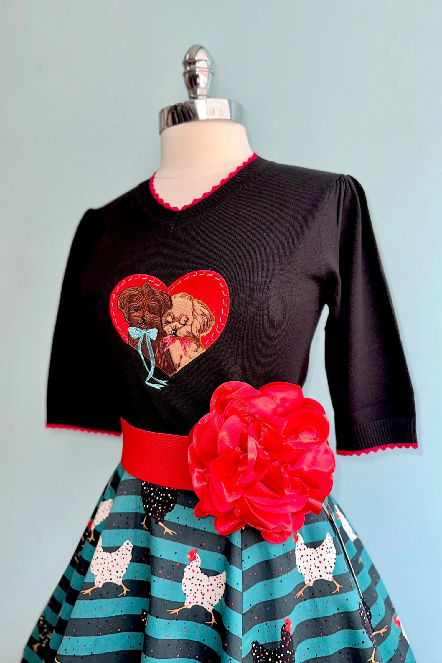 Crewneck black sweater with elbow length sleeves and an embroidered center heart with two puppies. The sleeves are about elbow length and are finished in a red ric-rac trim to match the neckline. The body is a fitted and made of fine, soft fabric.