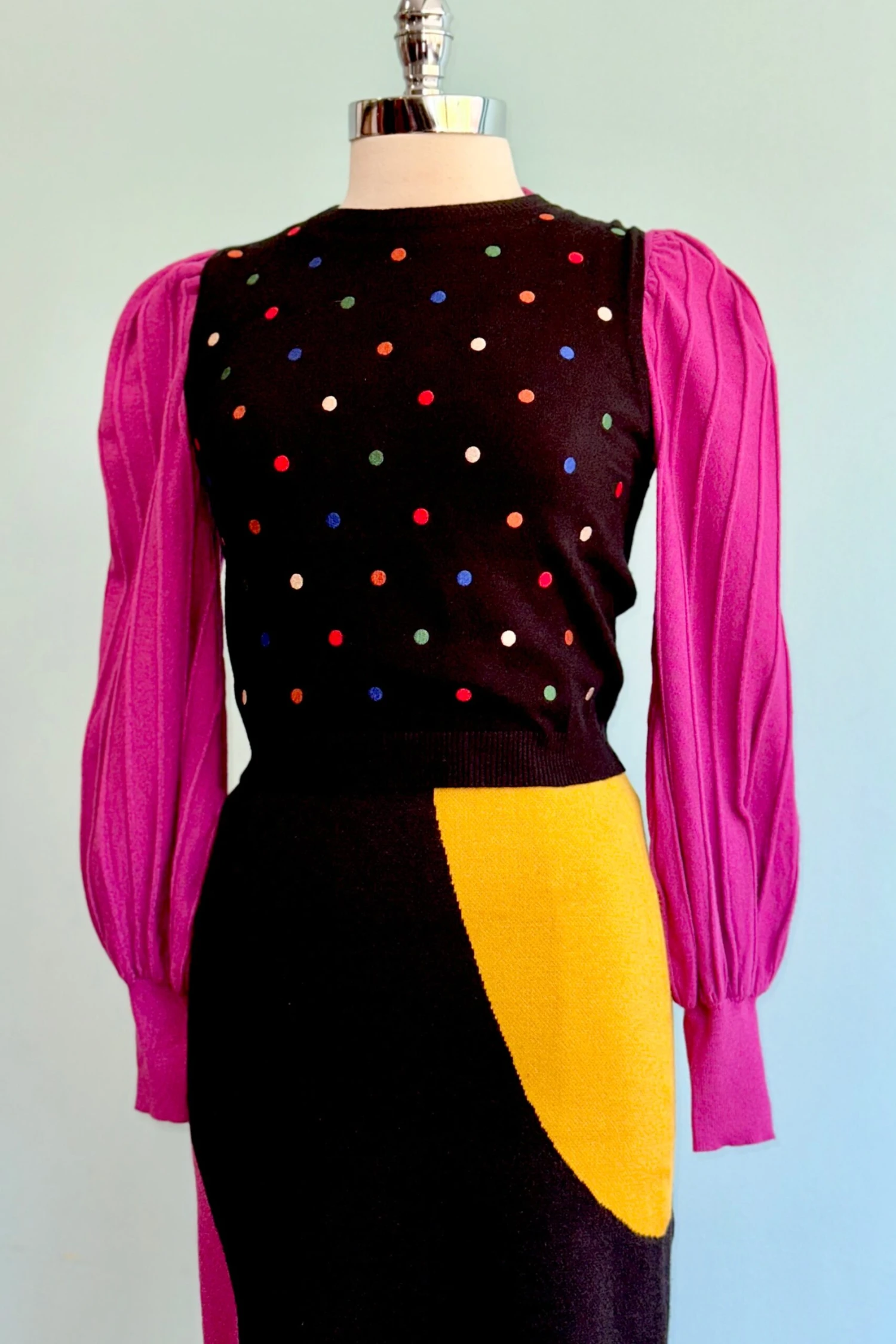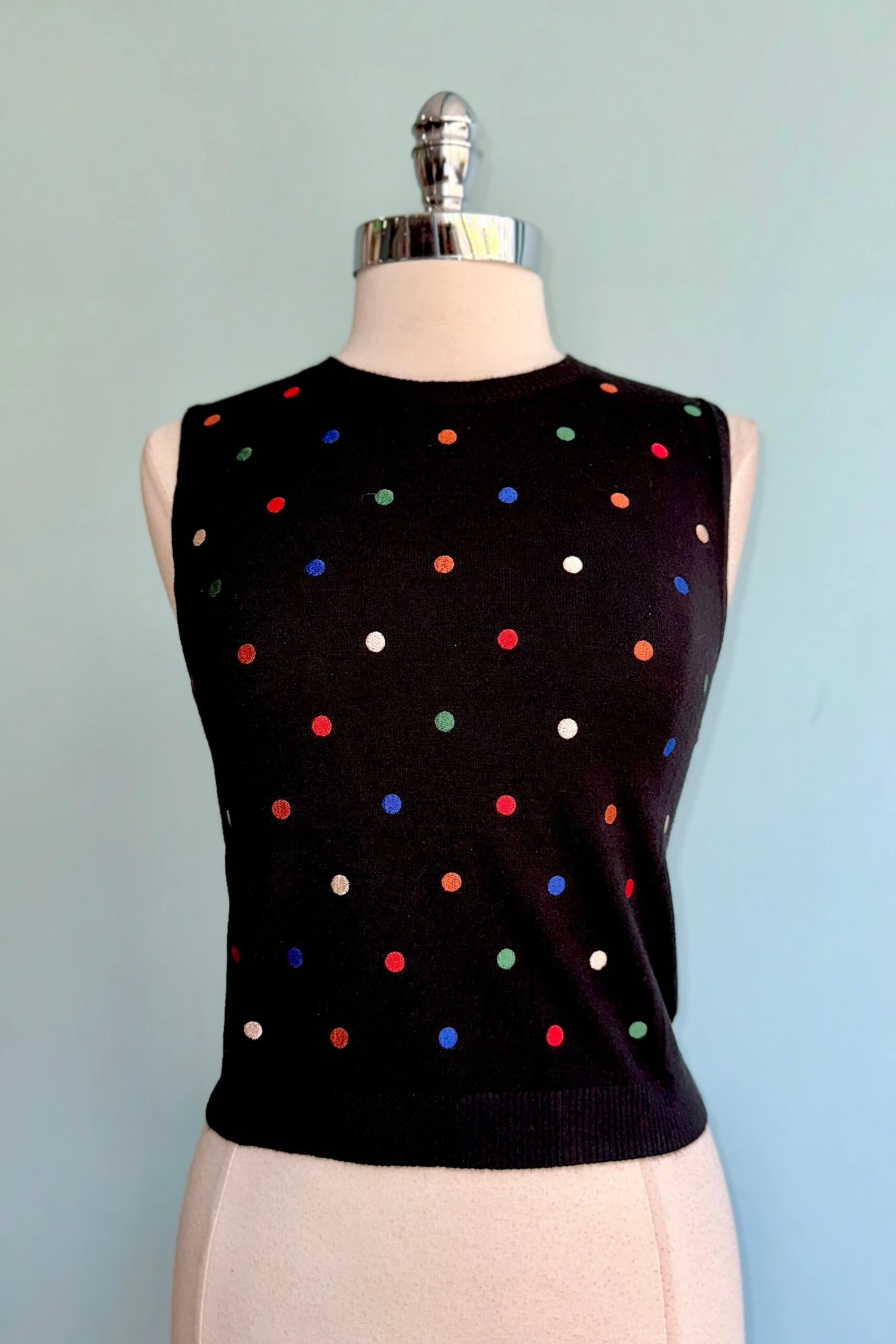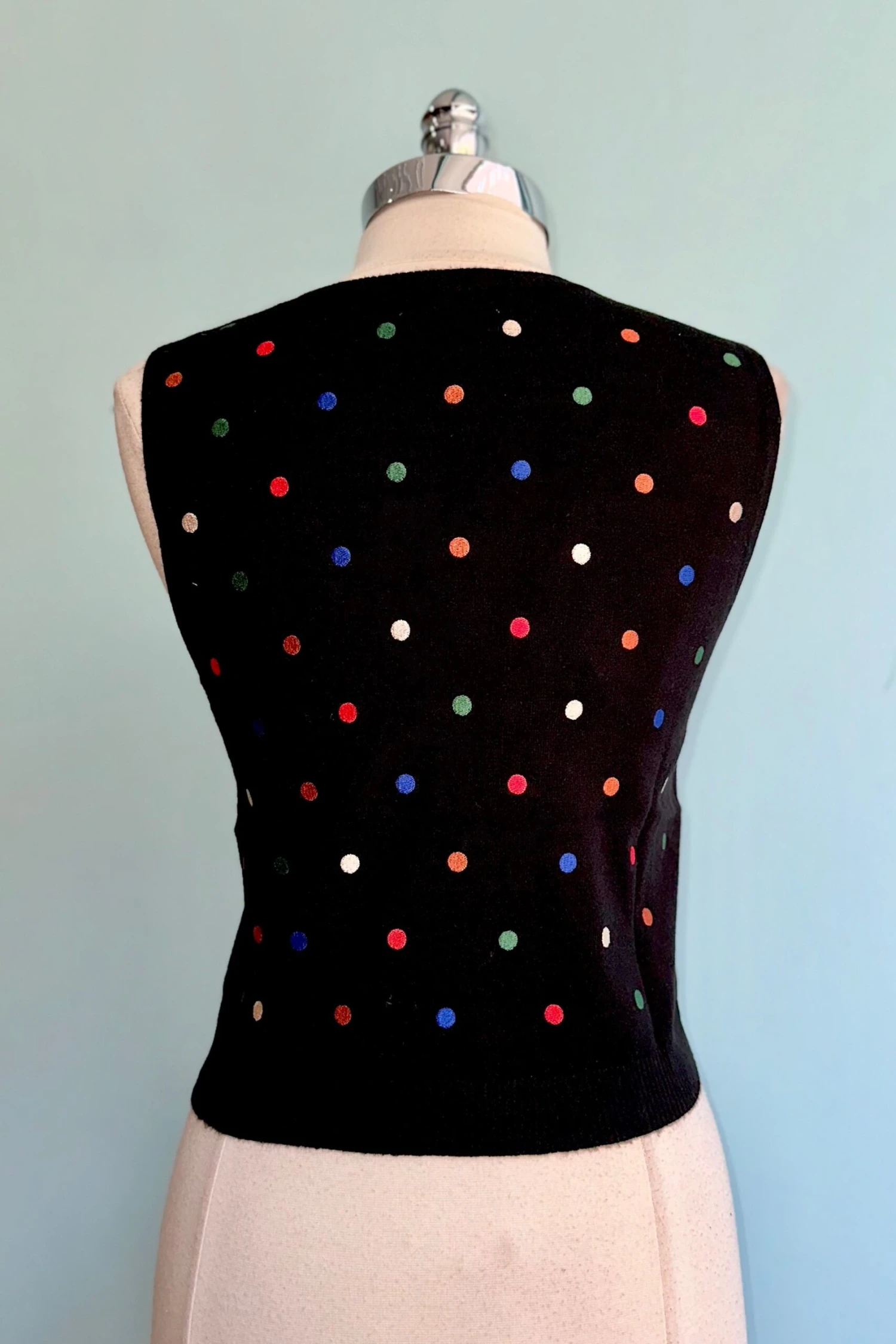 Black knit sweater vest with a embroidered colorful polka dots throughout. This vest has a crewneck and is about waist length.