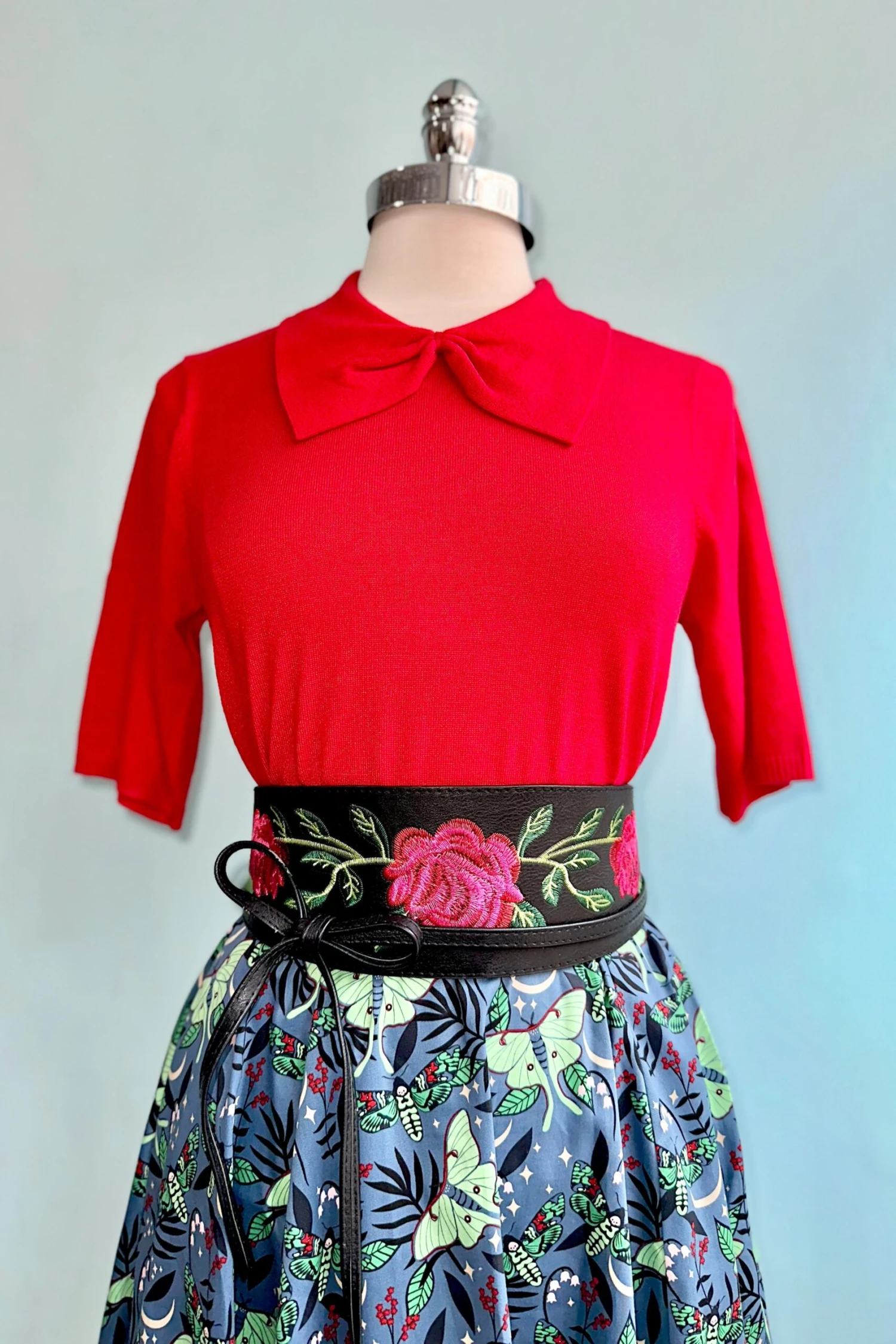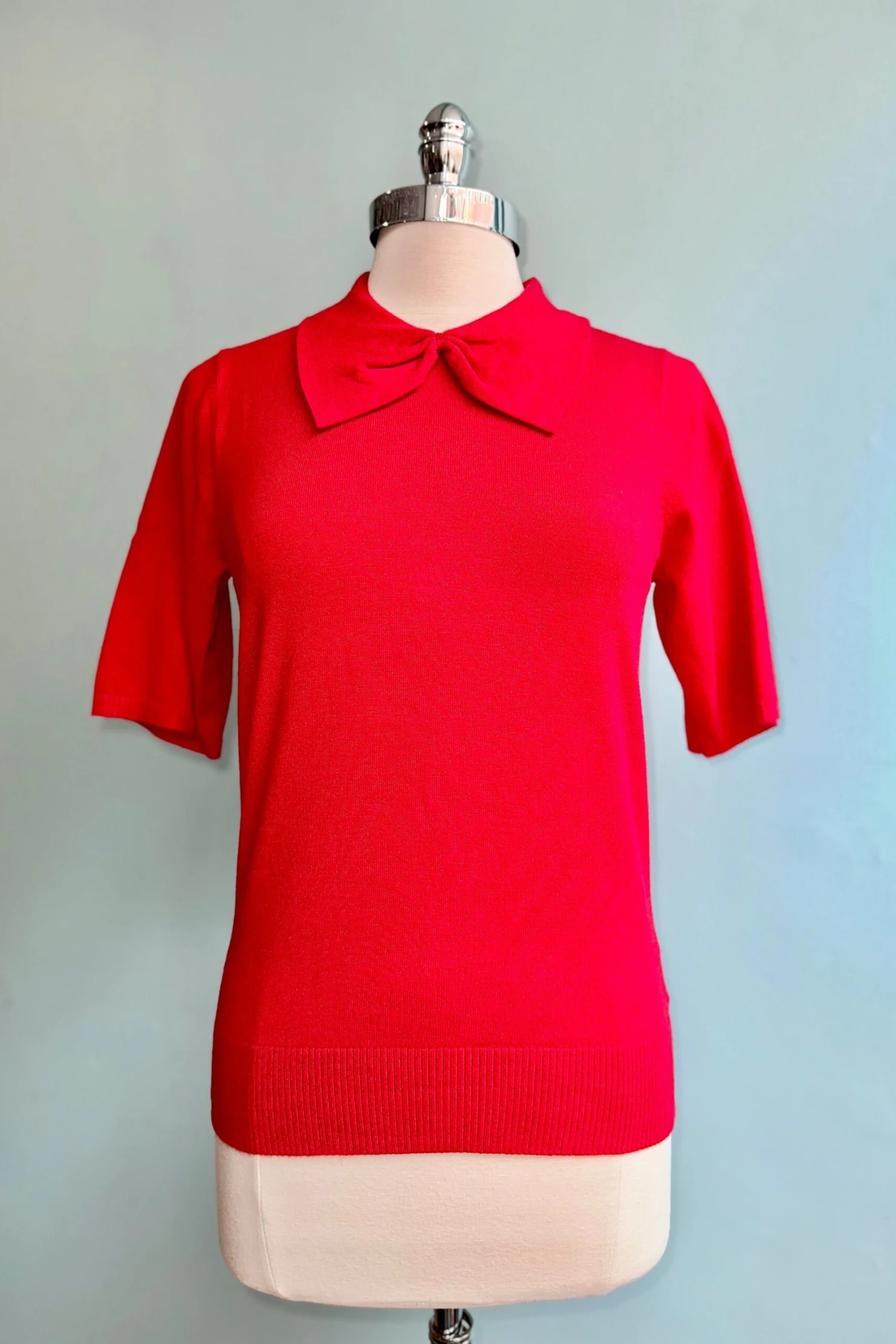 Red short sleeve sweater with a bow fold over collar. This is a fine knit, great tucked in or worn out. The sleeves reach to about the elbow.