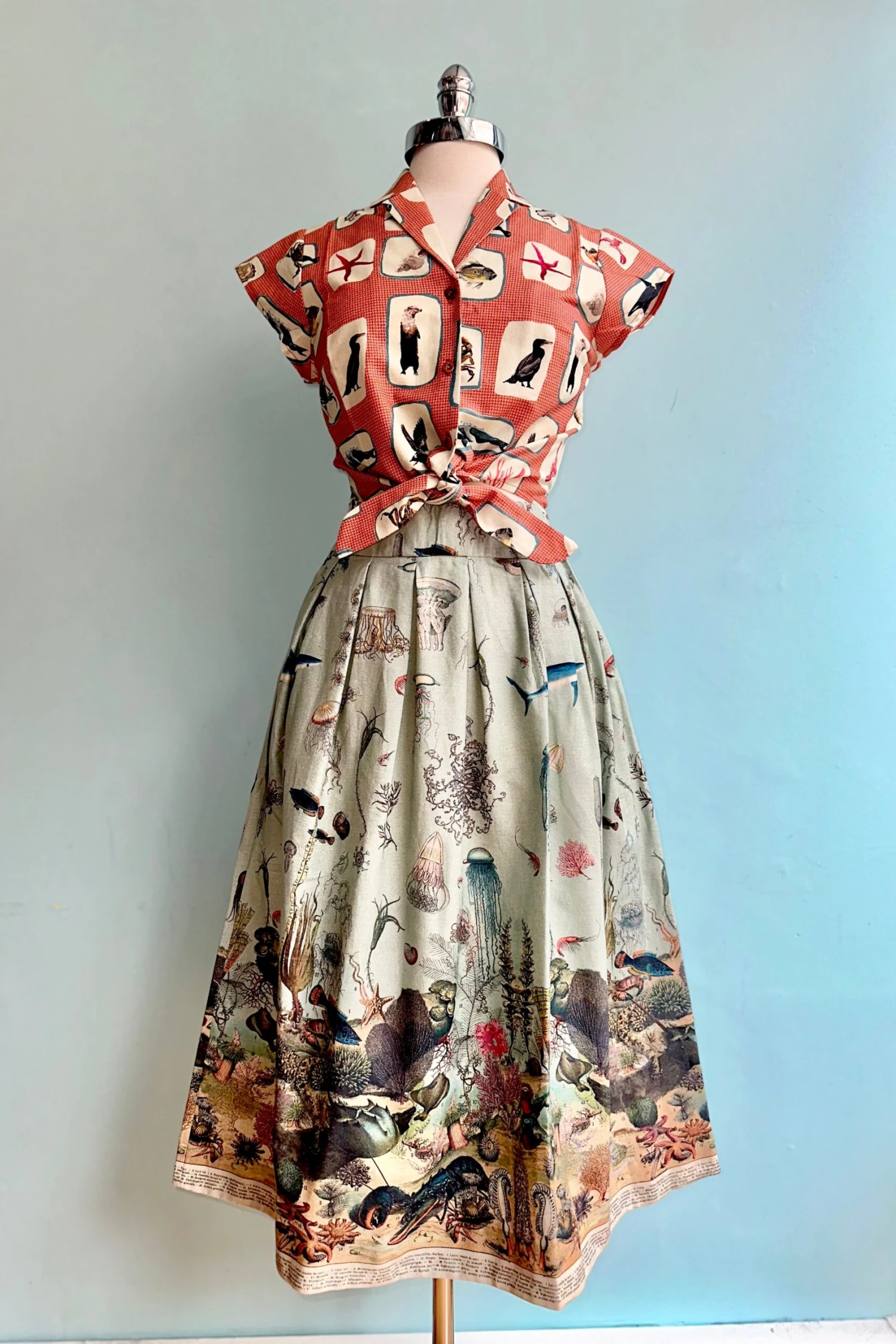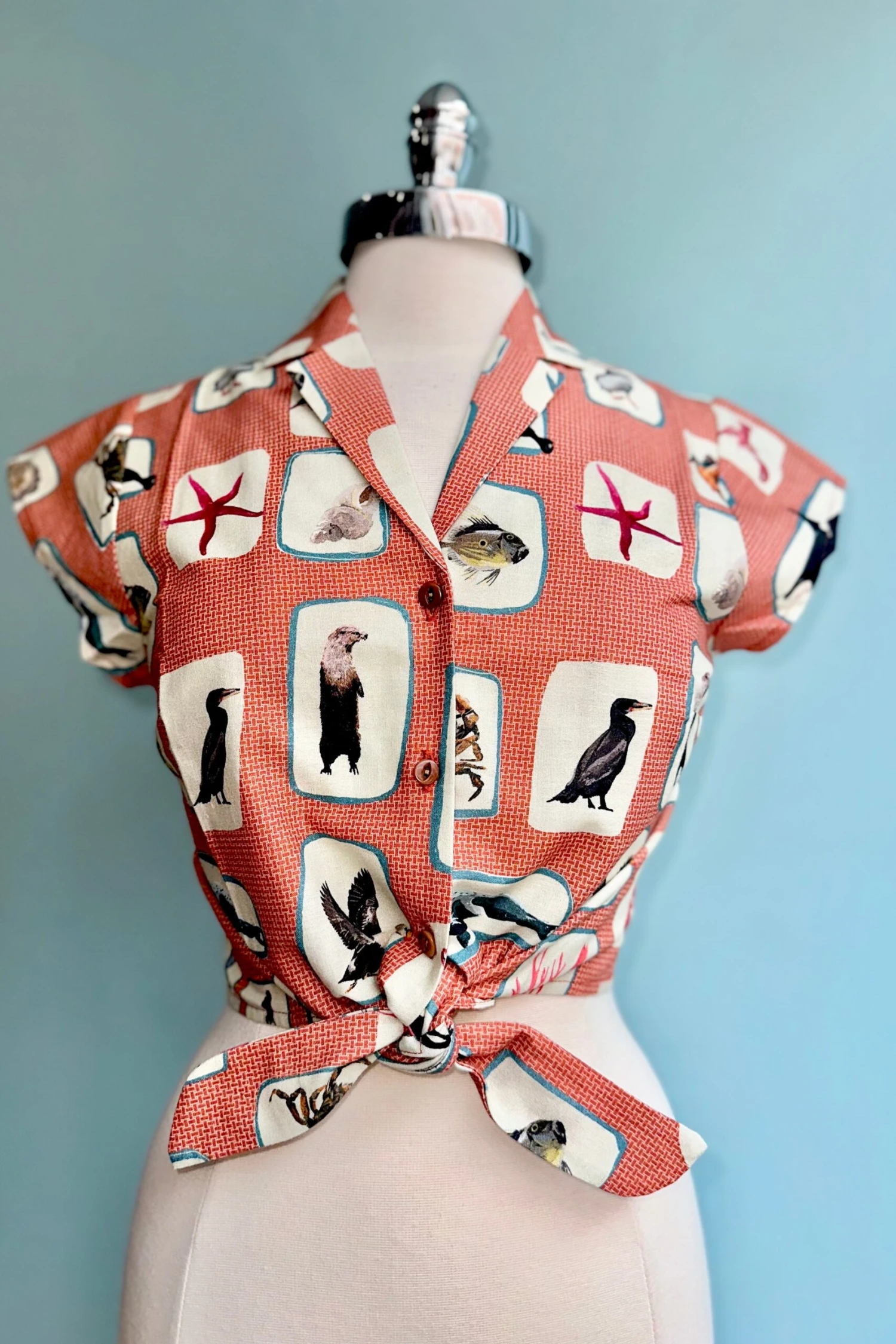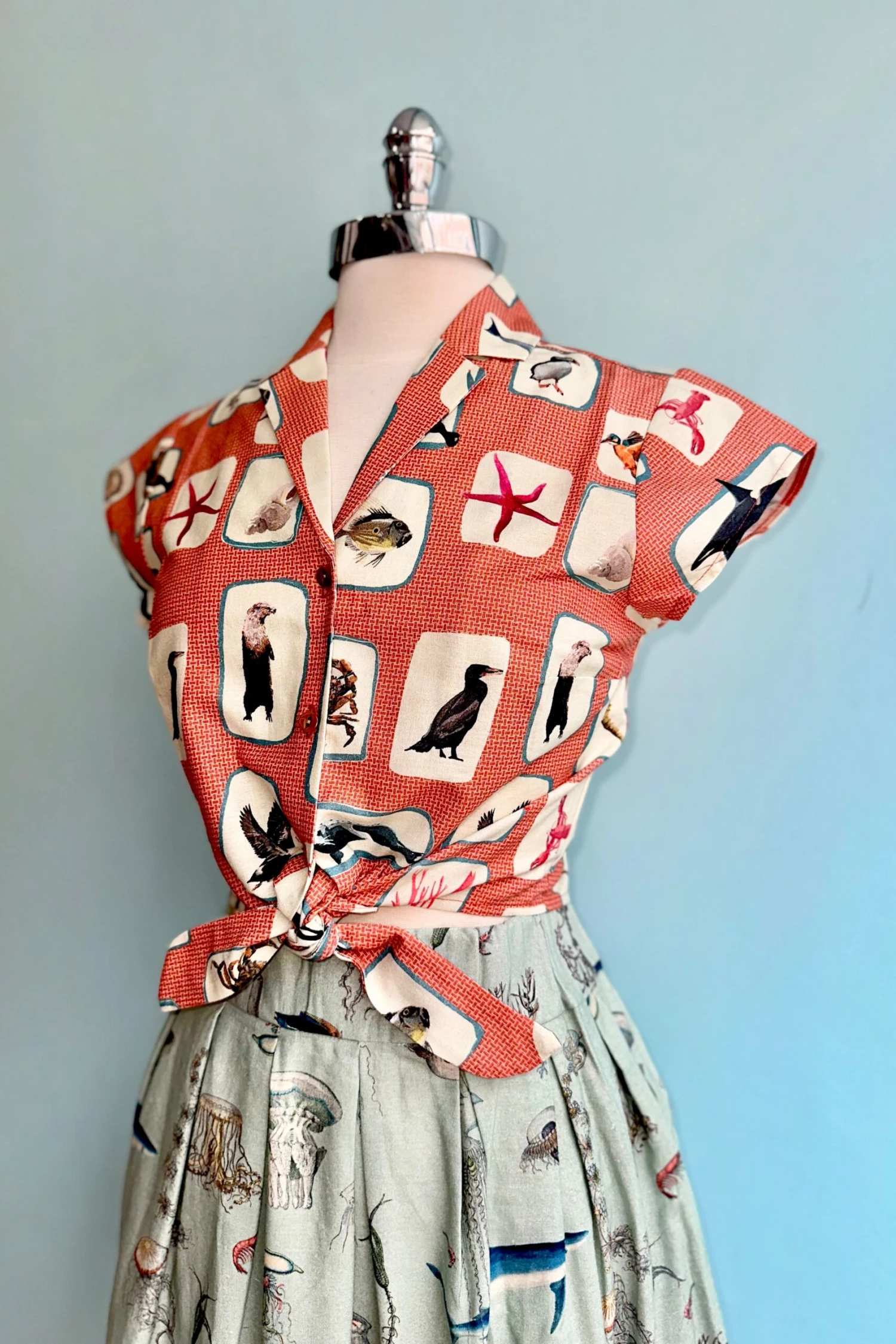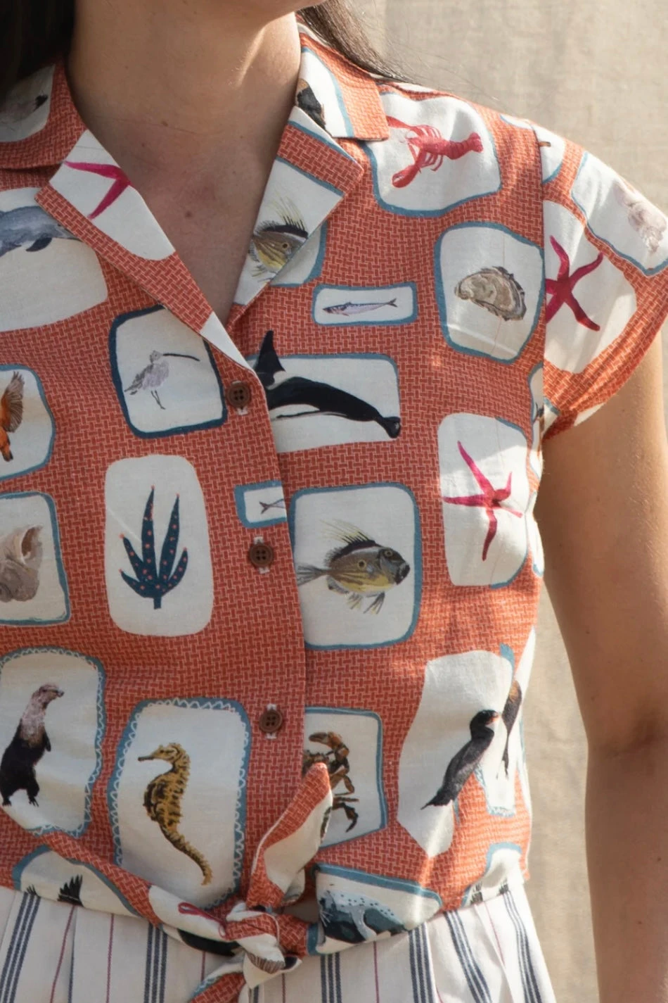 A red background with a print of cream rectangles containing various animals including whales, penguins, puffins, seahorses, starfish, otters, lobsters, seagulls, oysters, fish, dolphins, sealions, crabs, etc. The Peggy top is a Millie favorite with a summary down front, cropped tie waist and pretty cap sleeves. This top goes perfectly with high waisted trousers, a summer skirt or over a dress!