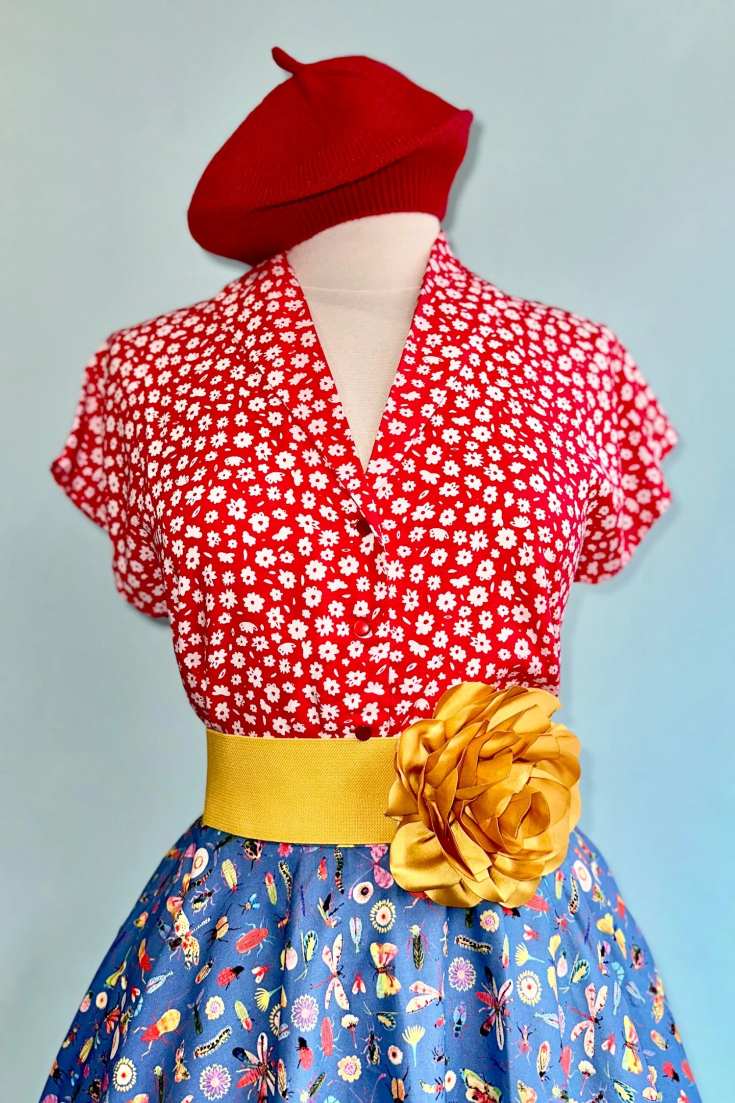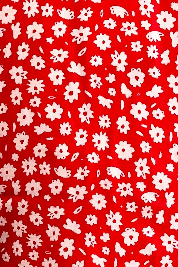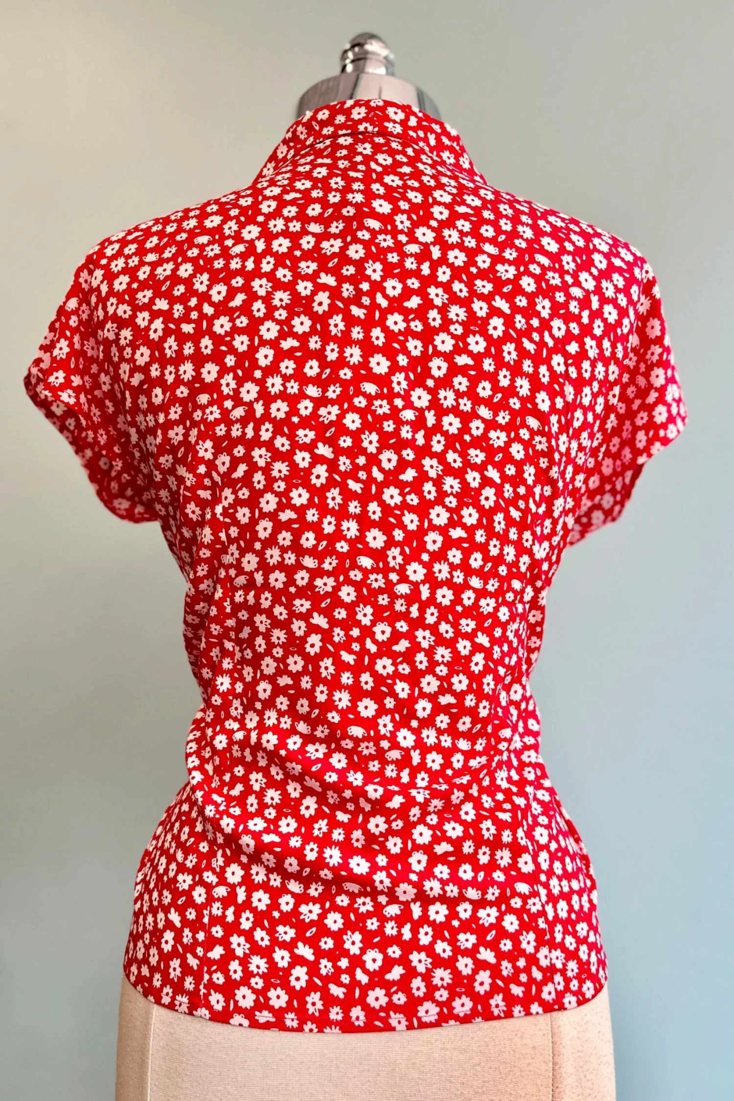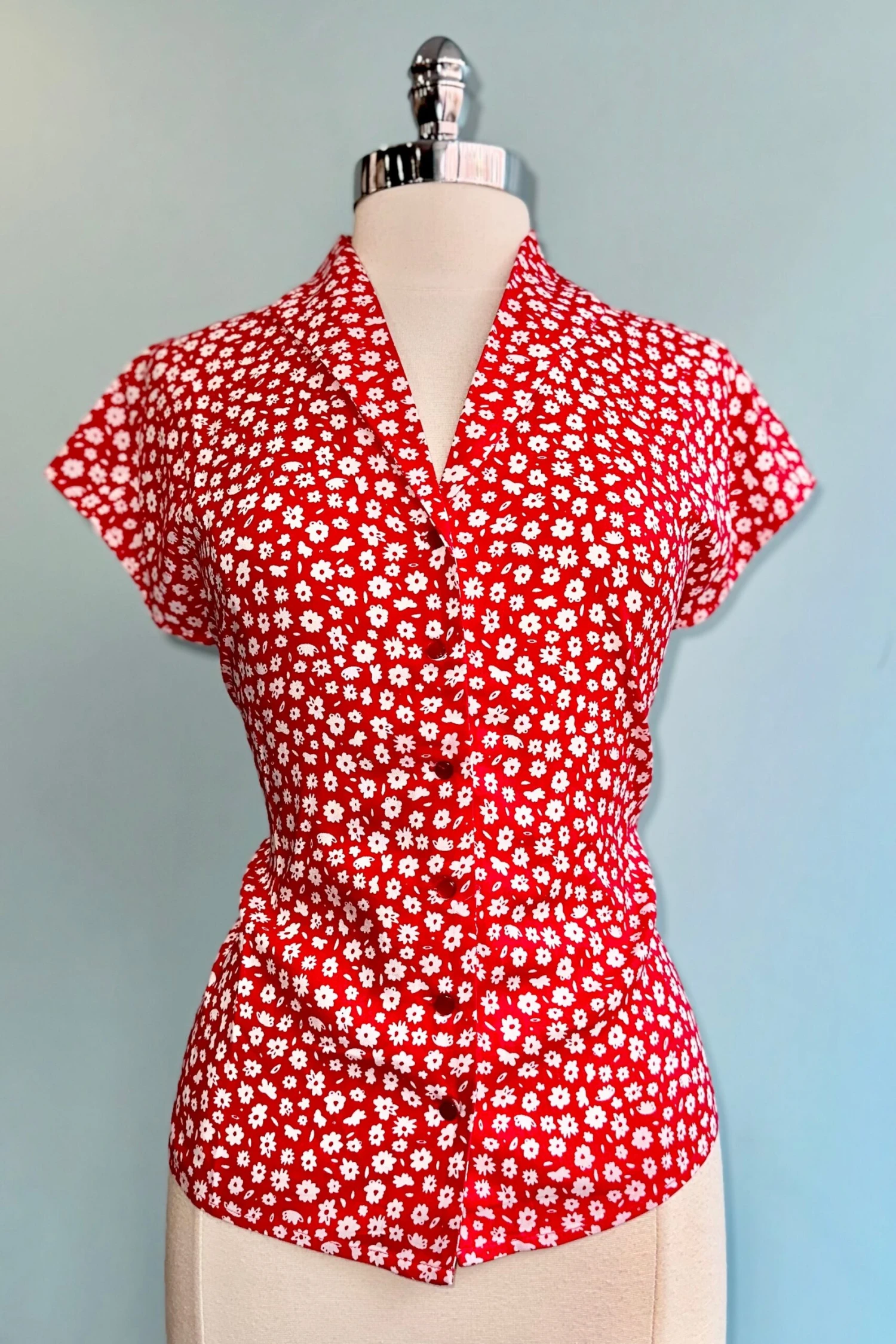 Red blouse with white ditsy daisies throughout. This top has cap sleeves and summarys down the front with red summarys. This top is not lined.