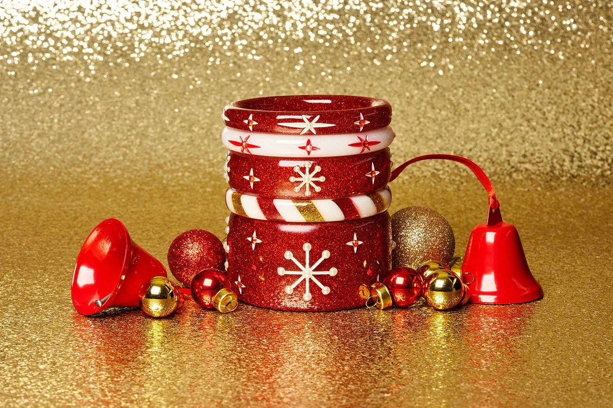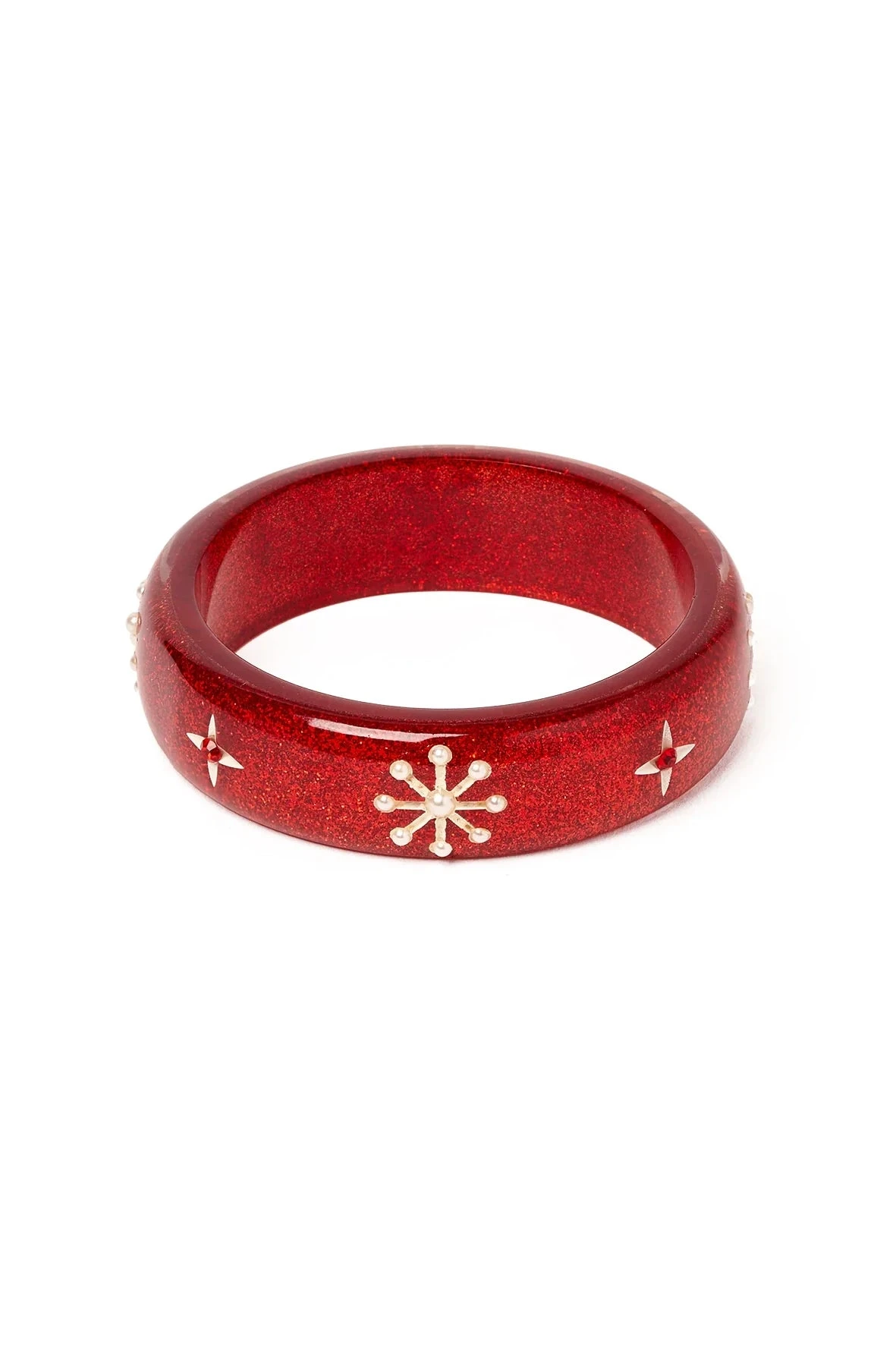 Add a touch of glamour to your holiday outfit with our Midi Red Glitter Snowflake Bangle. This elegant bangle features a carved white 50s style atomic snowflake design and imitation pearls for a festive touch. With the addition of red glitter, this bangle is sure to make a statement at any holiday gathering.