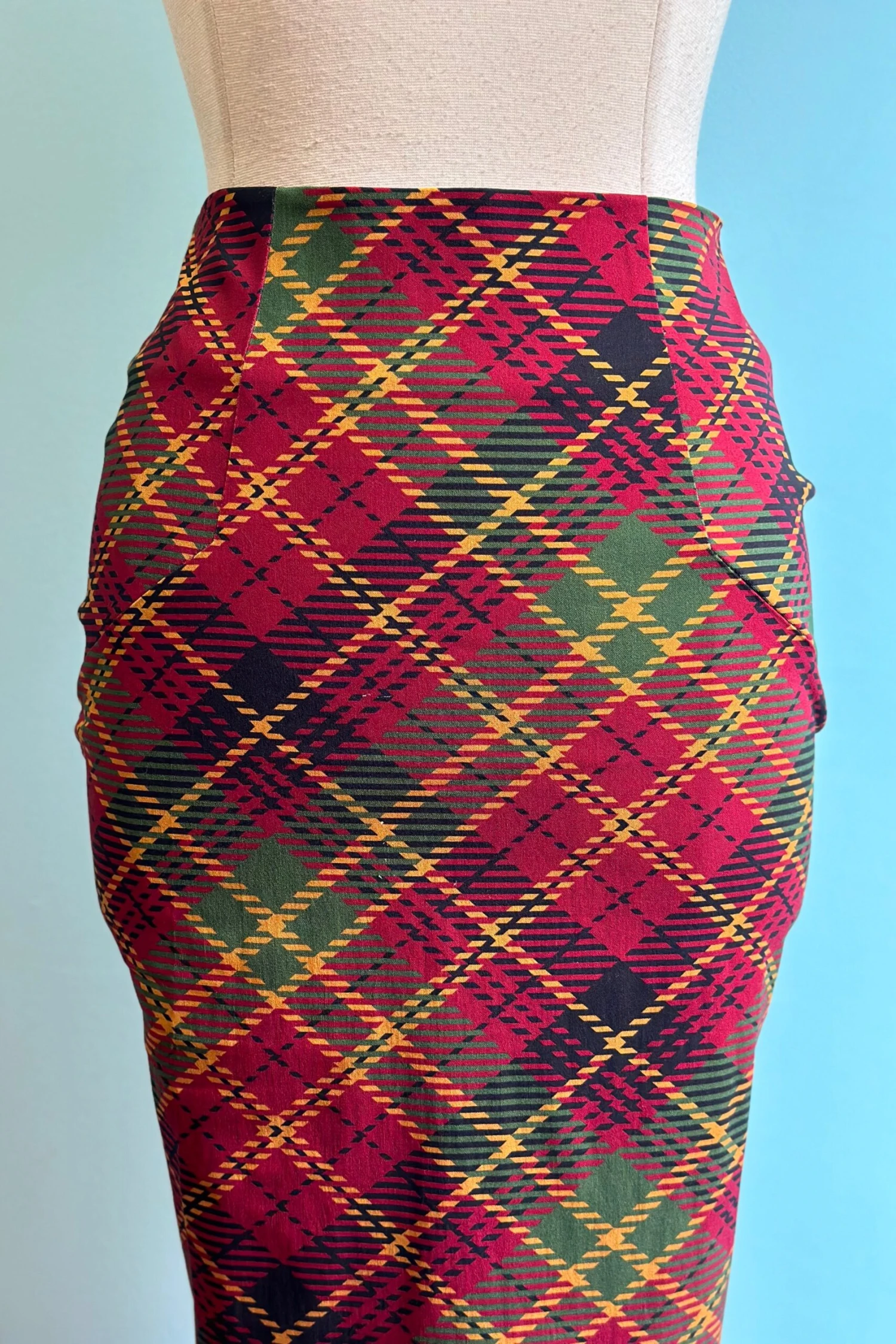 Jersey pencil skirt in red and green plaid. The skirt has give but the waist does not. Zips up the back and has a hem slit in the back. Unlined. Hits at or bellow the knee.