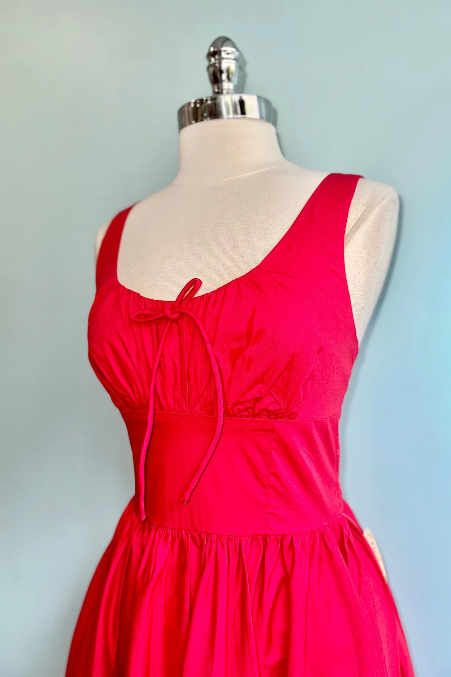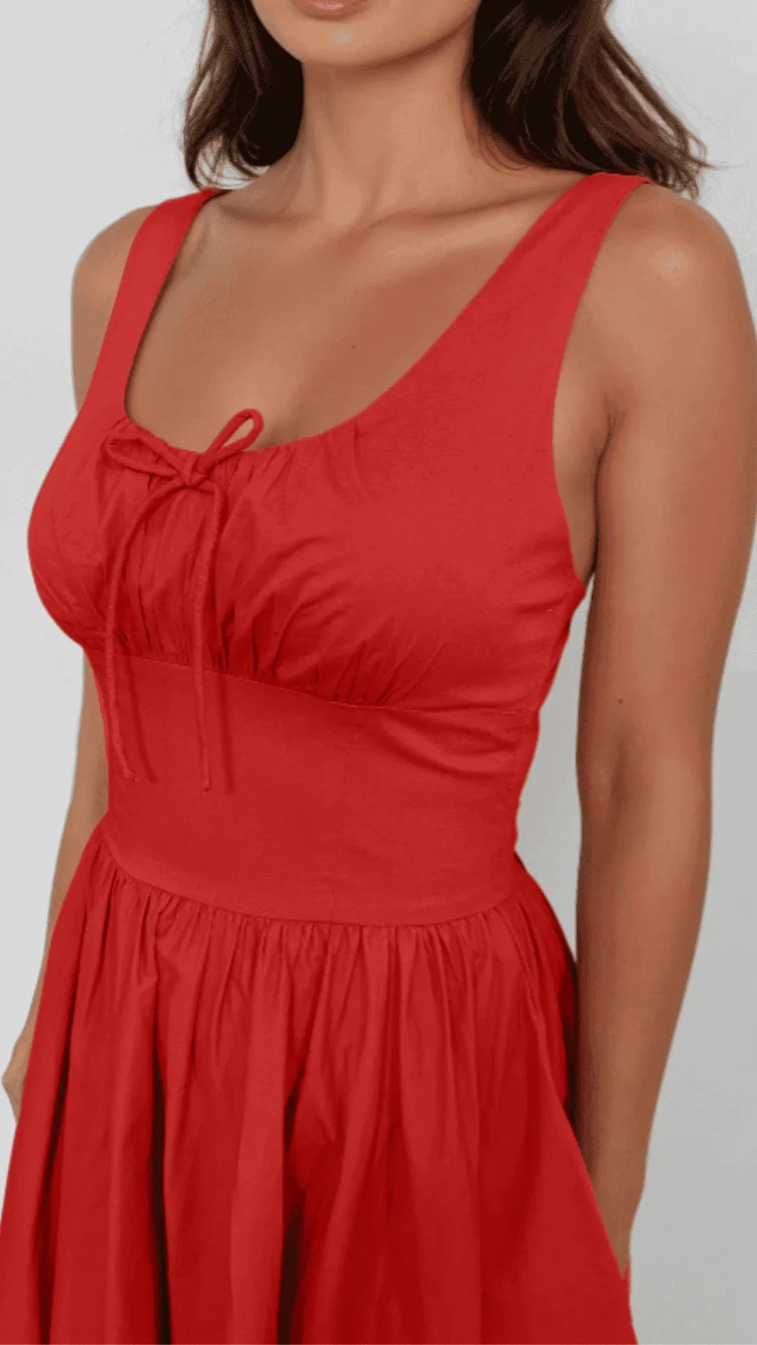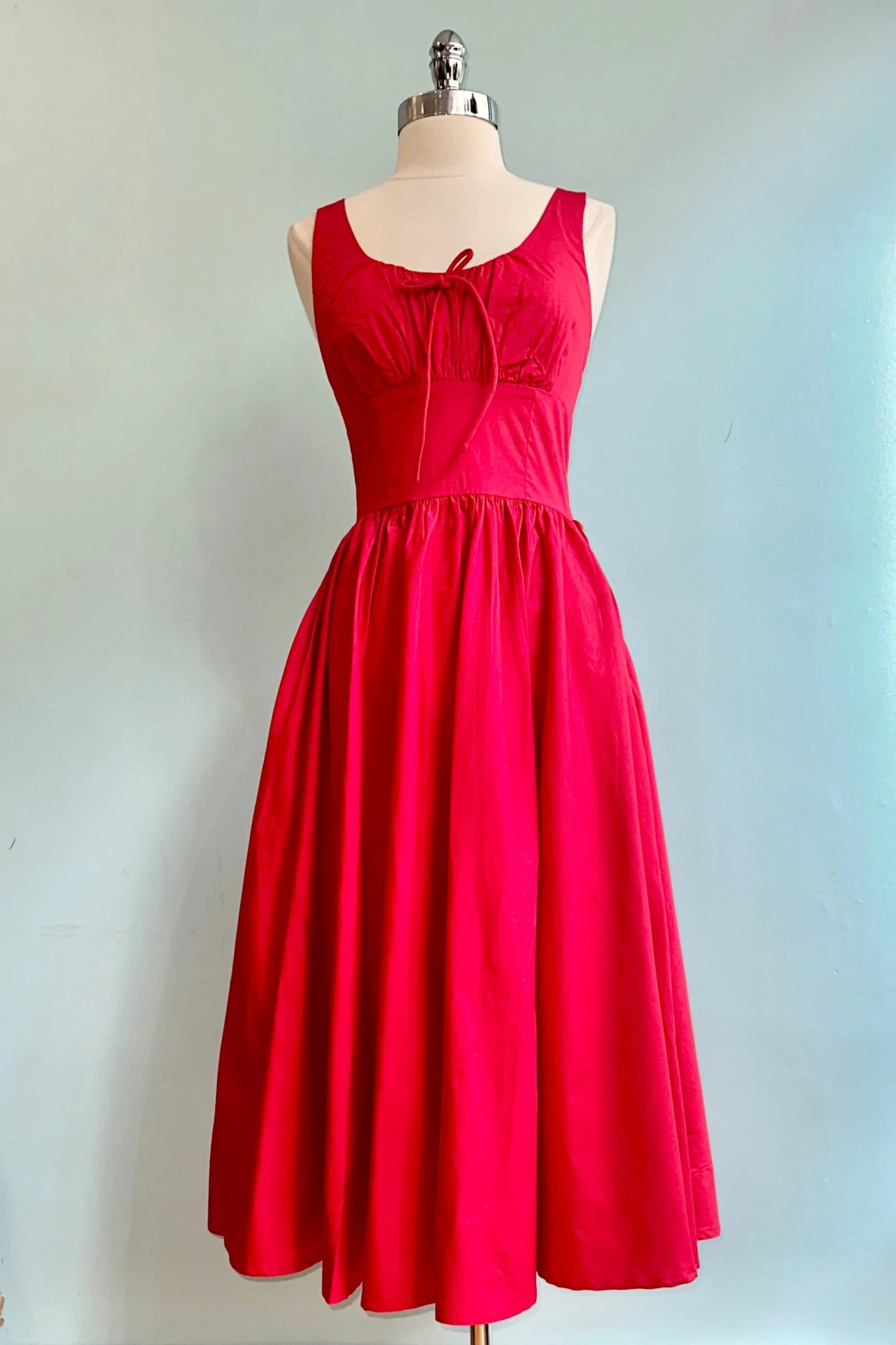 Red sundress with a smocked back and adjustable straps. This dress is made out of sustainable (BCI) stretch cotton poplin dress. The bodice is fitted with gathering underbust, and a smocked back panel. Complete with pockets, this dress is perfect for weddings, garden parties, and vacations. There is a back zip for closure and the bodice is fully faced. The skirt is not lined.