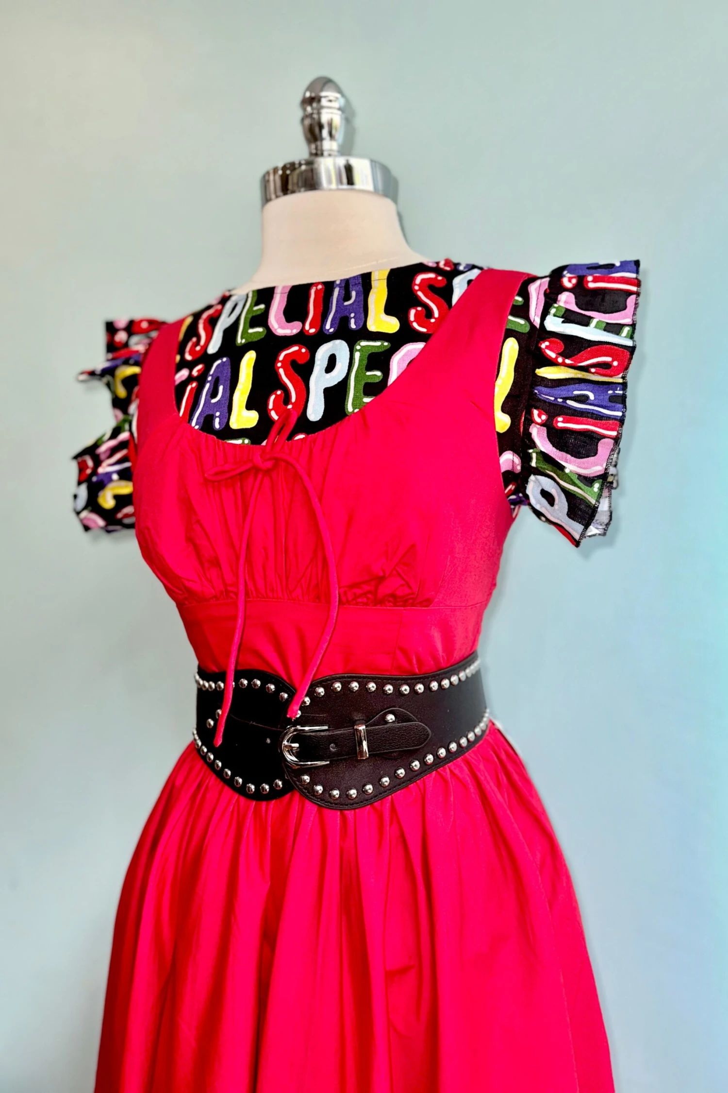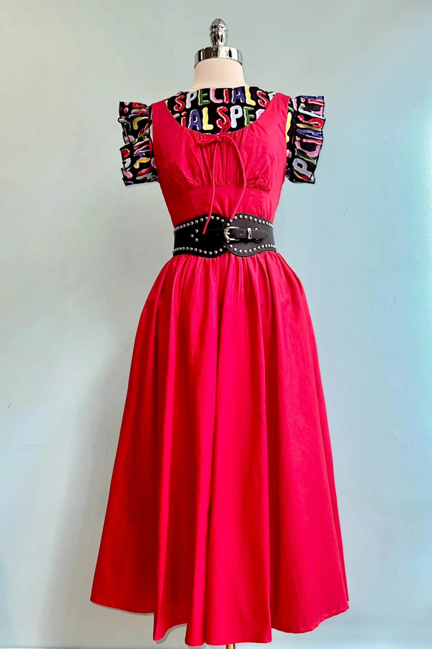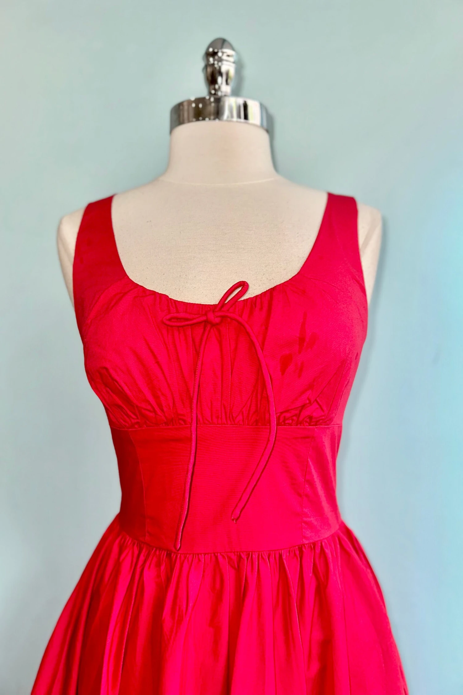 Red sundress with a smocked back and adjustable straps. This dress is made out of sustainable (BCI) stretch cotton poplin dress. The bodice is fitted with gathering underbust, and a smocked back panel. Complete with pockets, this dress is perfect for weddings, garden parties, and vacations. There is a back zip for closure and the bodice is fully faced. The skirt is not lined.