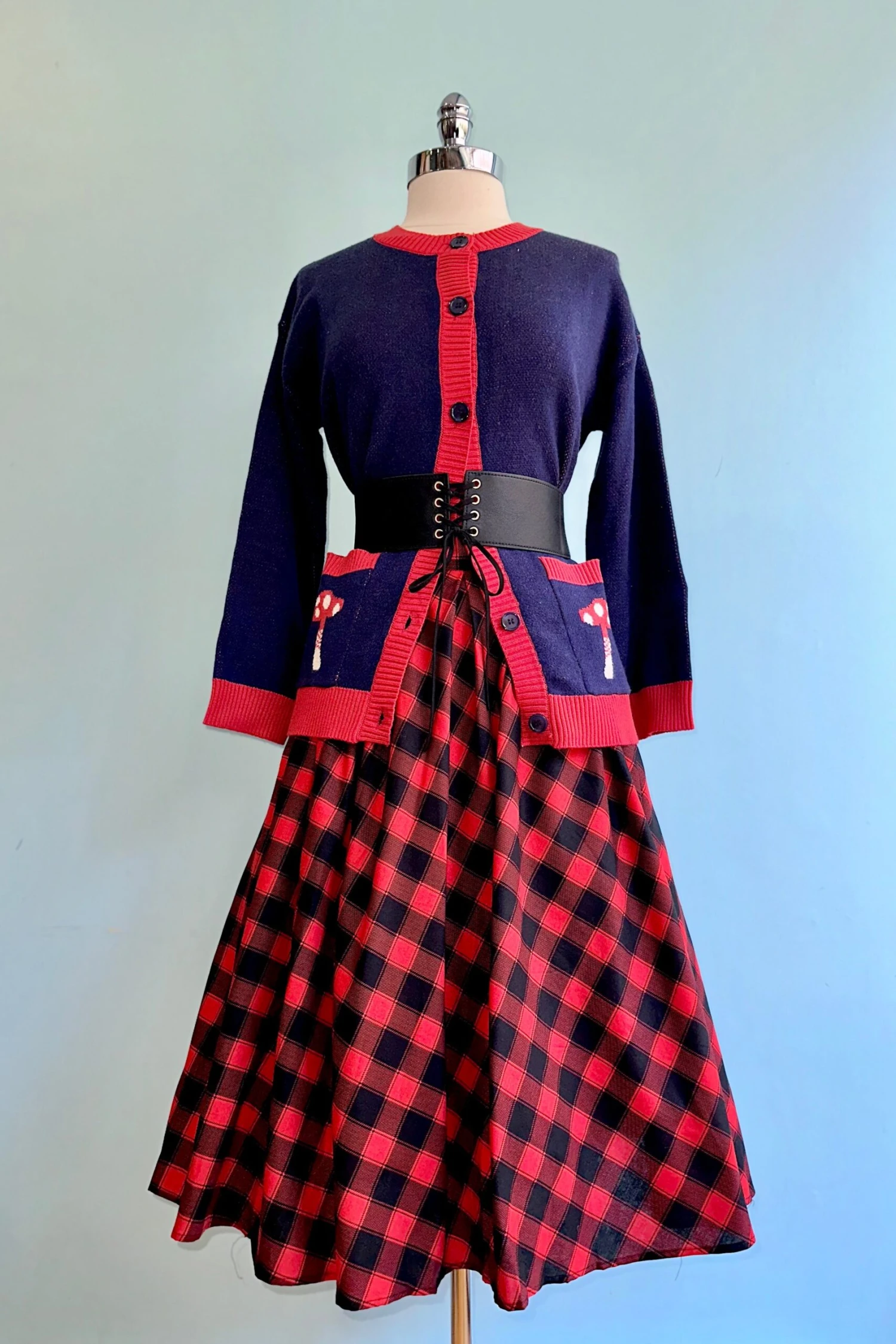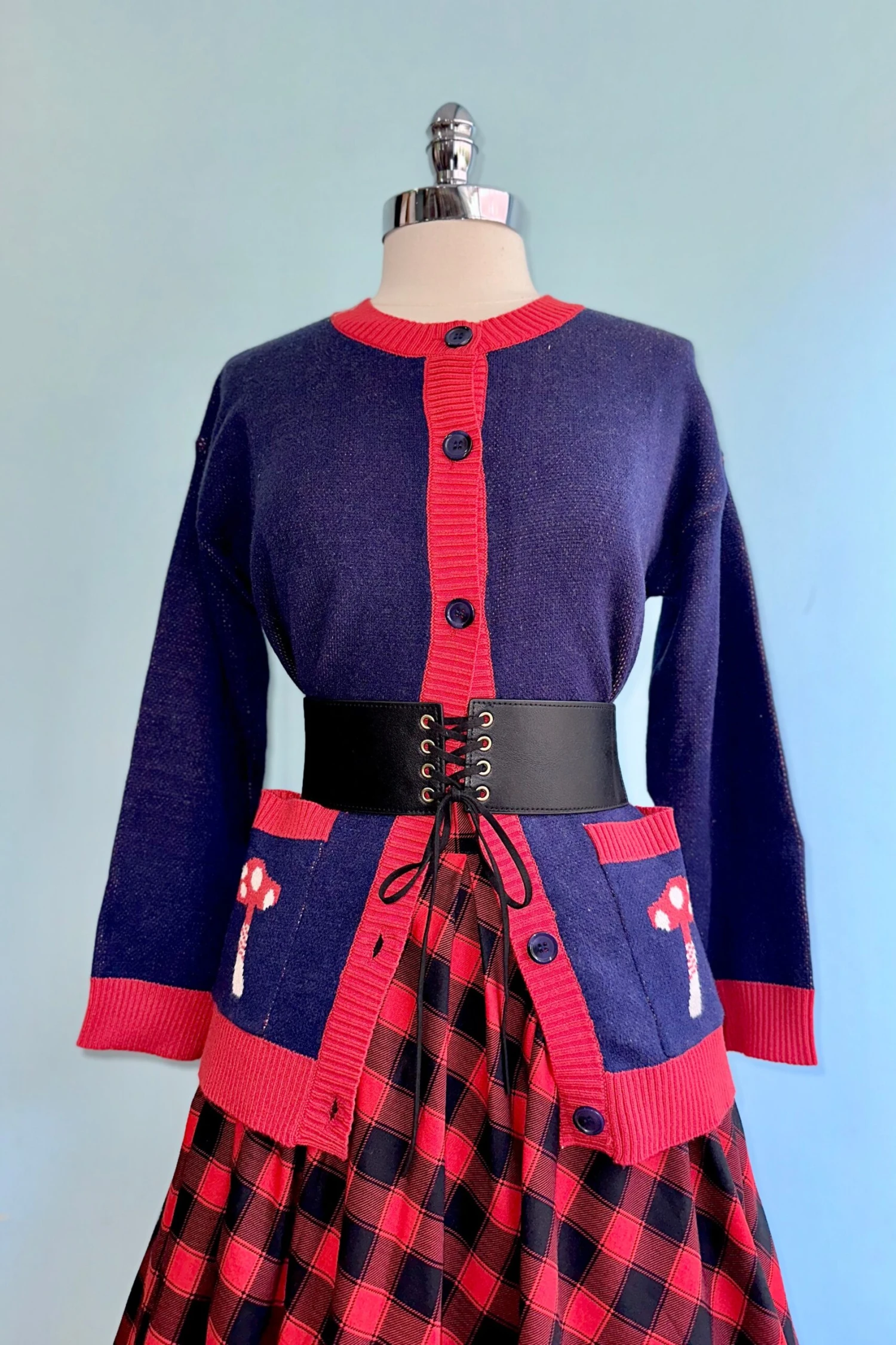 A long cardigan in navy with red trim featuring a mushroom on the front pockets and a red panda on the back. Buttons up the front with navy summarys and has two small front facing pockets.