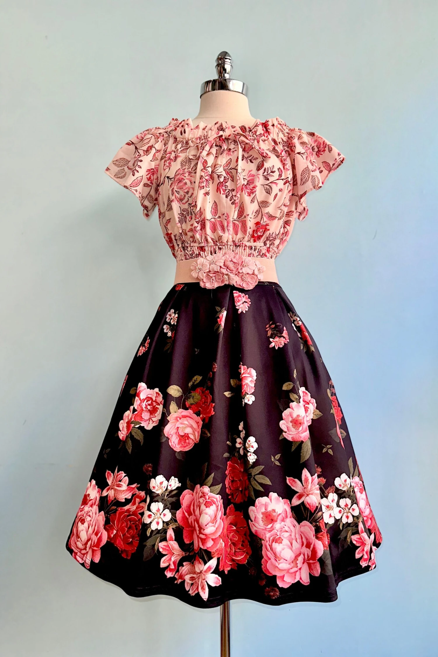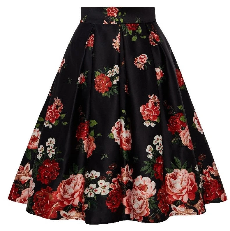 Box pleated skirt in black with a print of red roses. There is a back zip for closure. The skirt is very full and has hidden side pockets!