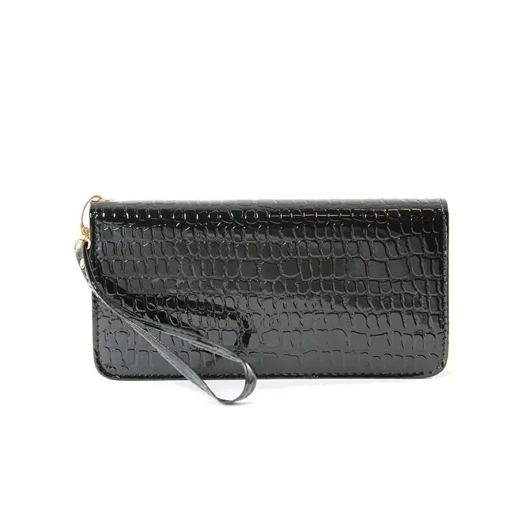 Black and clear rhinestone piano key clutch evening bag with a faux alligator backing. Lined in fabric with multiple card slots and a zip coin compartment. Closes with a gold zipper.