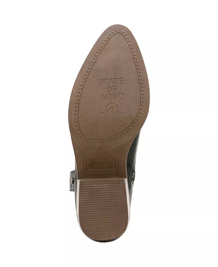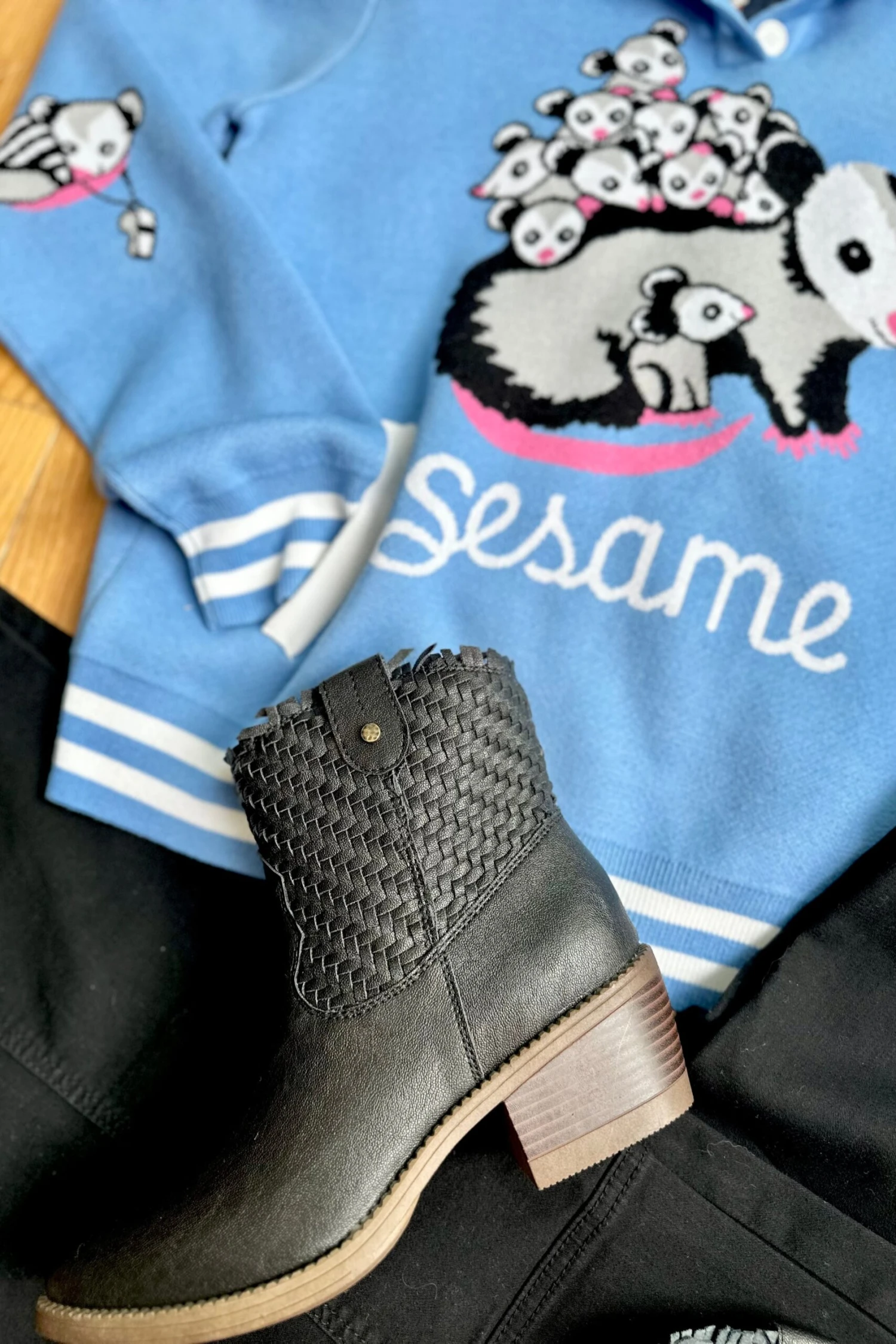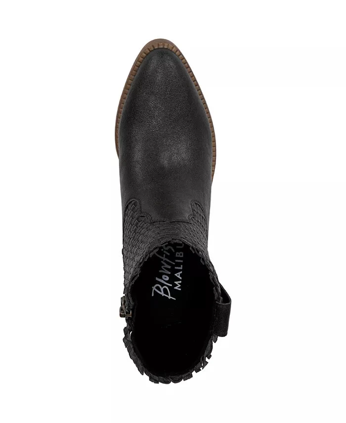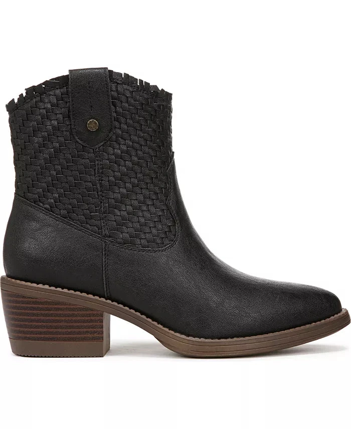 Mid calf boot featuring a western inspired silhouette and a stacked block heel. Faux leather – Polyurethane or Fabric upper. Side zipper entry. Embroidered detail.