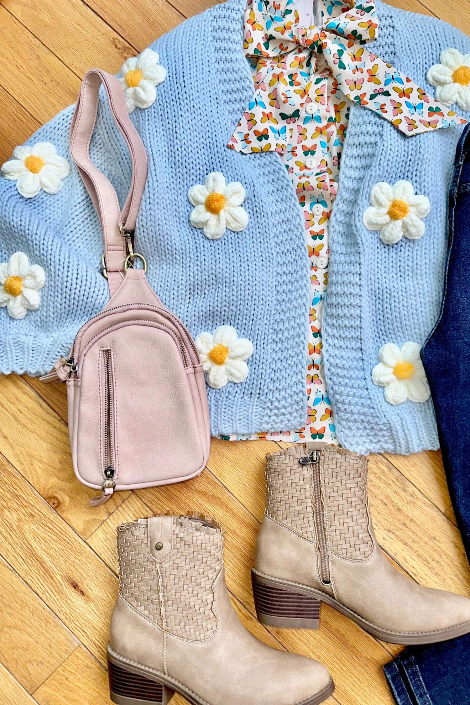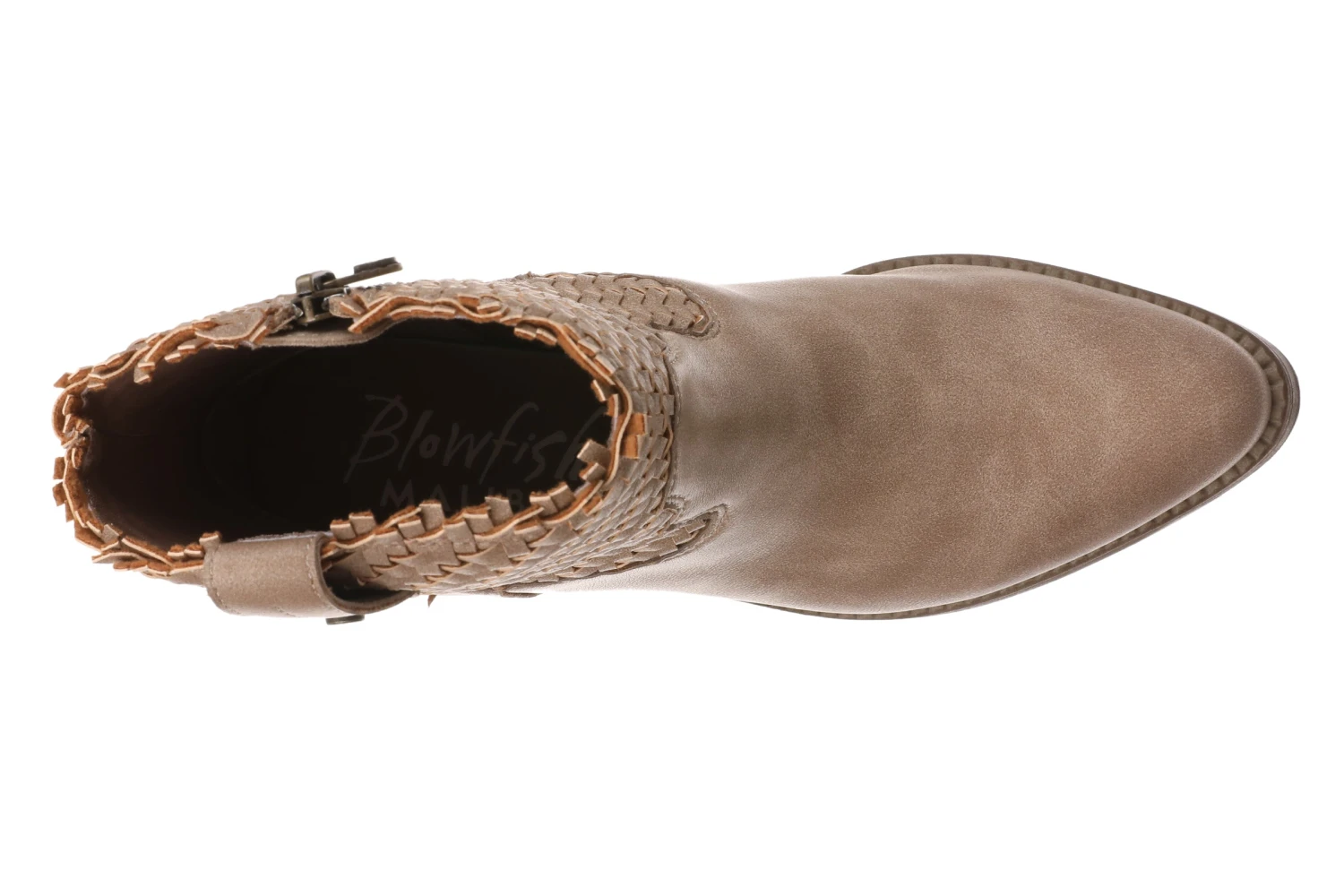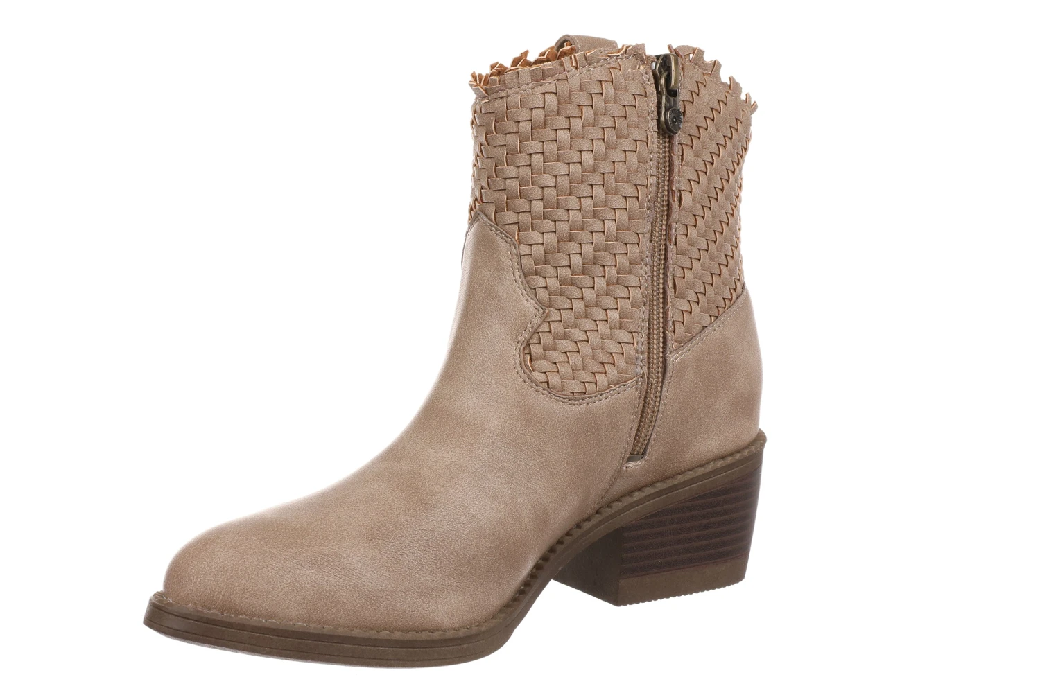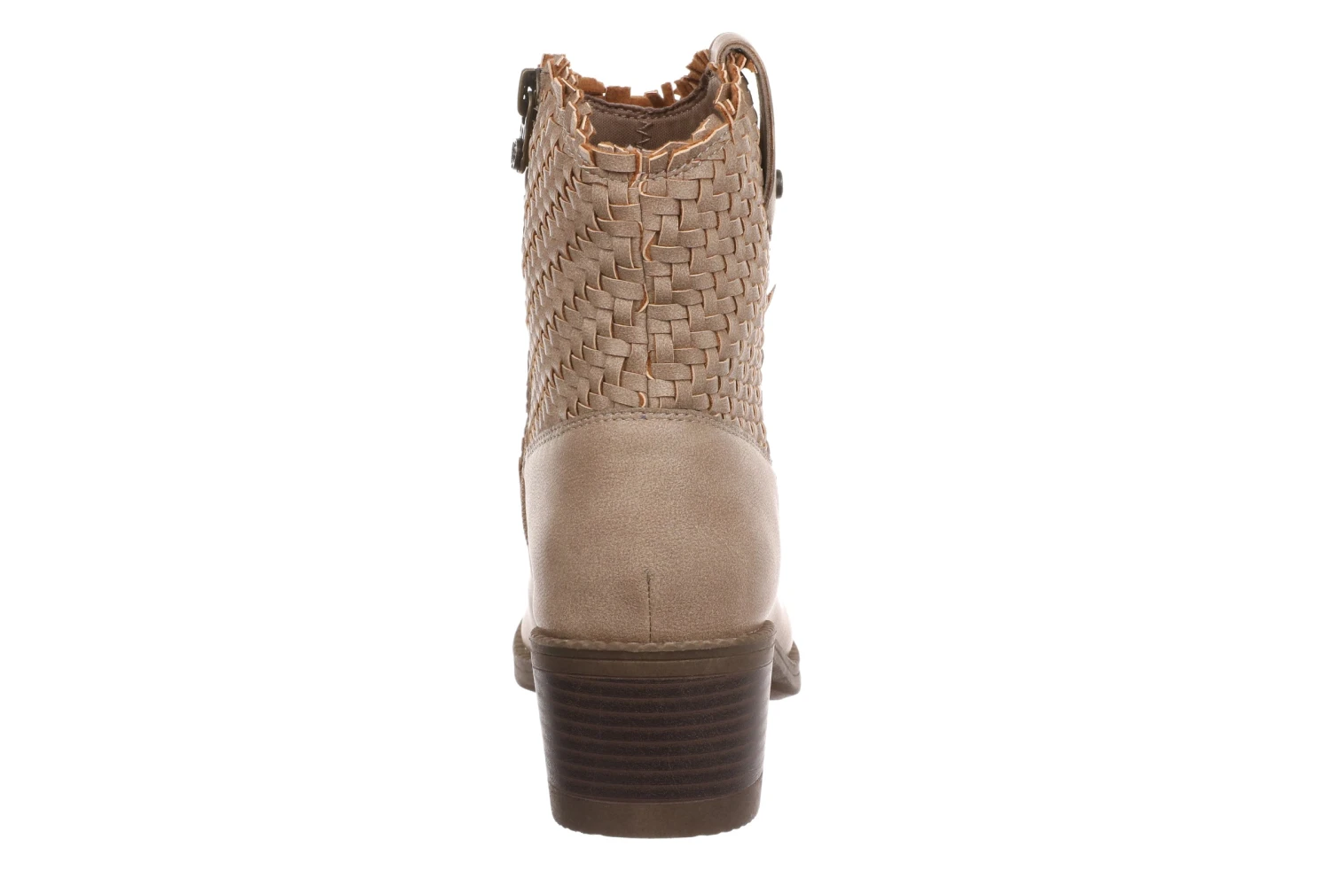 Mid calf boot featuring a western inspired silhouette and a stacked block heel. Faux leather – Polyurethane or Fabric upper. Side zipper entry. Embroidered detail.