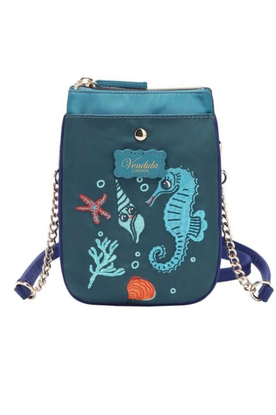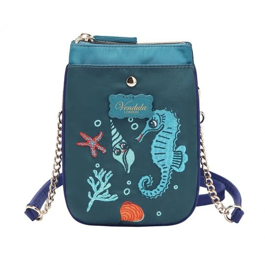 Teal and turquoise cross body phone bag with an embroidered seahorse, sea shells, and starfish on the front. There is a front pocket for your phone and an inside compartment that closes with a zipper and has two compartments on the inside. There is a back zip pocket as well!