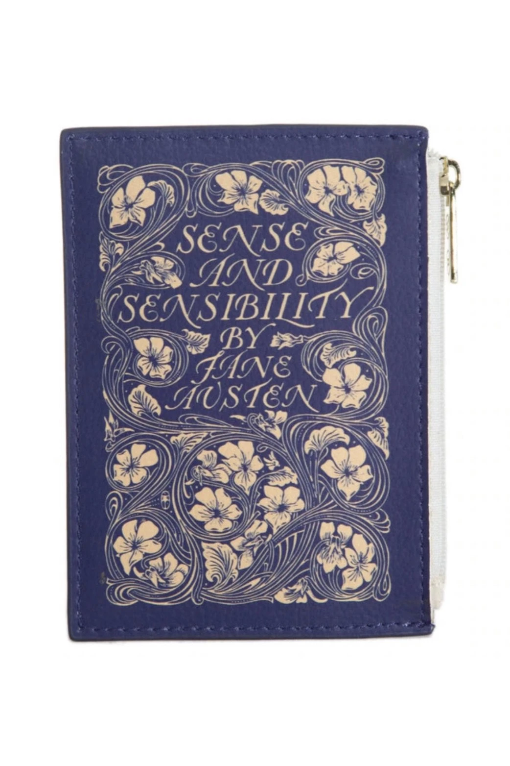 Coin purse version of Jane Austen’s Sense and Sensibility featuring a gold flower design on a deep blue background and made with vegan leather. The back of the handbag is also decorated with the quote: ‘I wish, as well as everybody else, to be perfectly happy: but, like everybody else, it must be in my own way’.