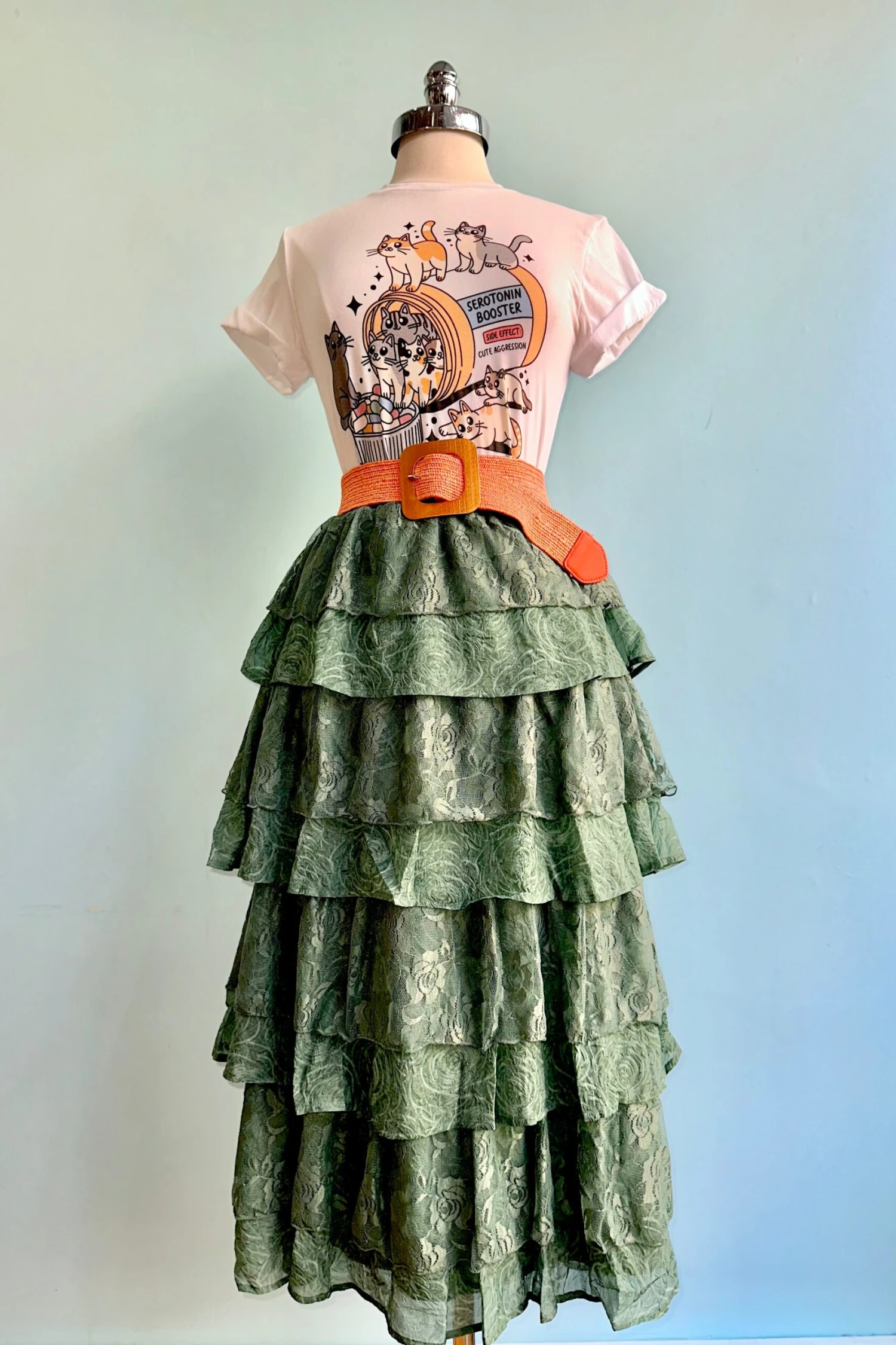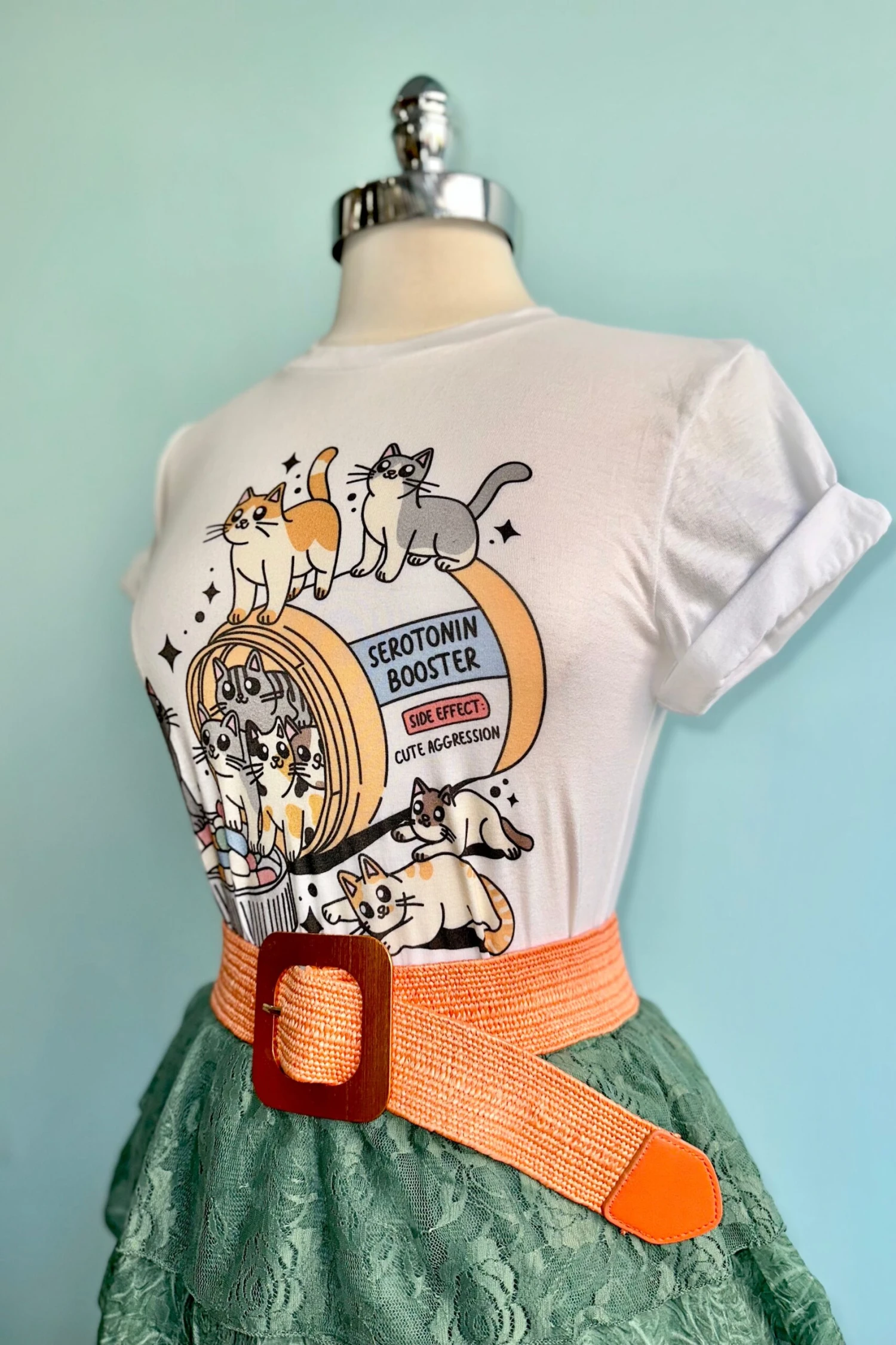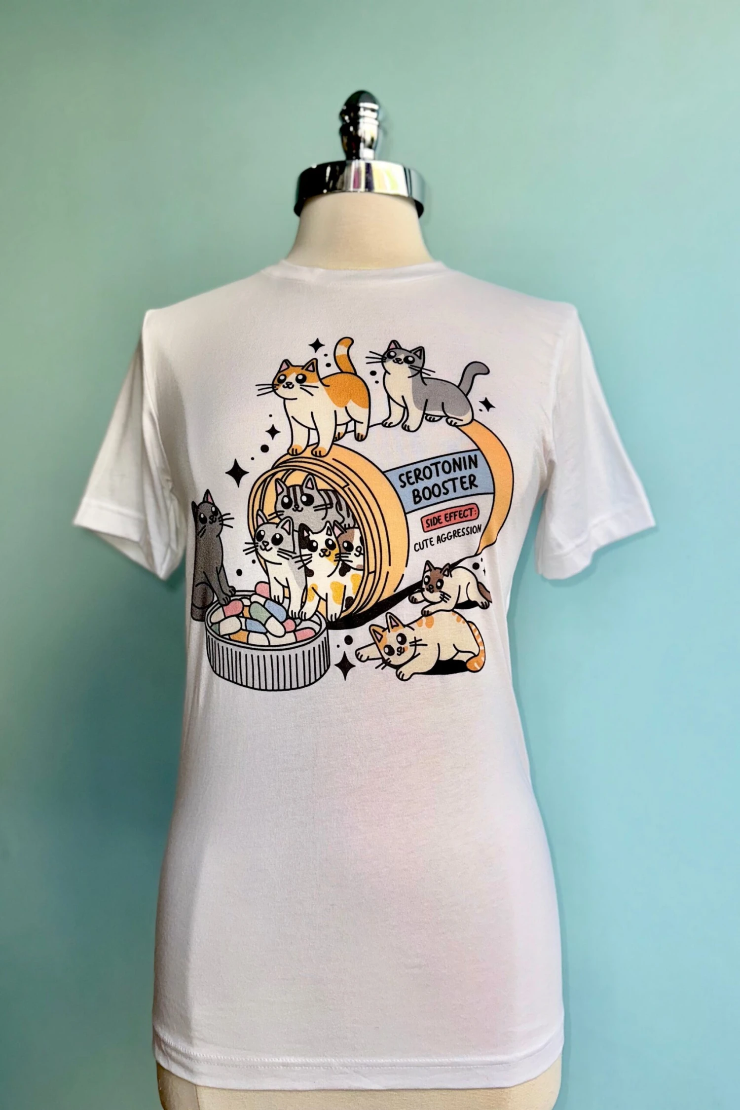 Serotonin Booster Cat T-shirt in white. Unisex sizing and made of 100% Cotton.